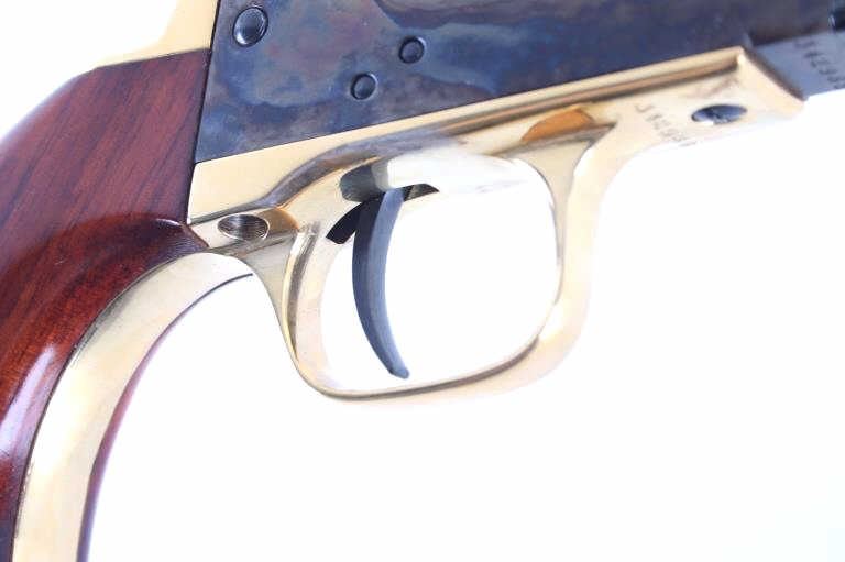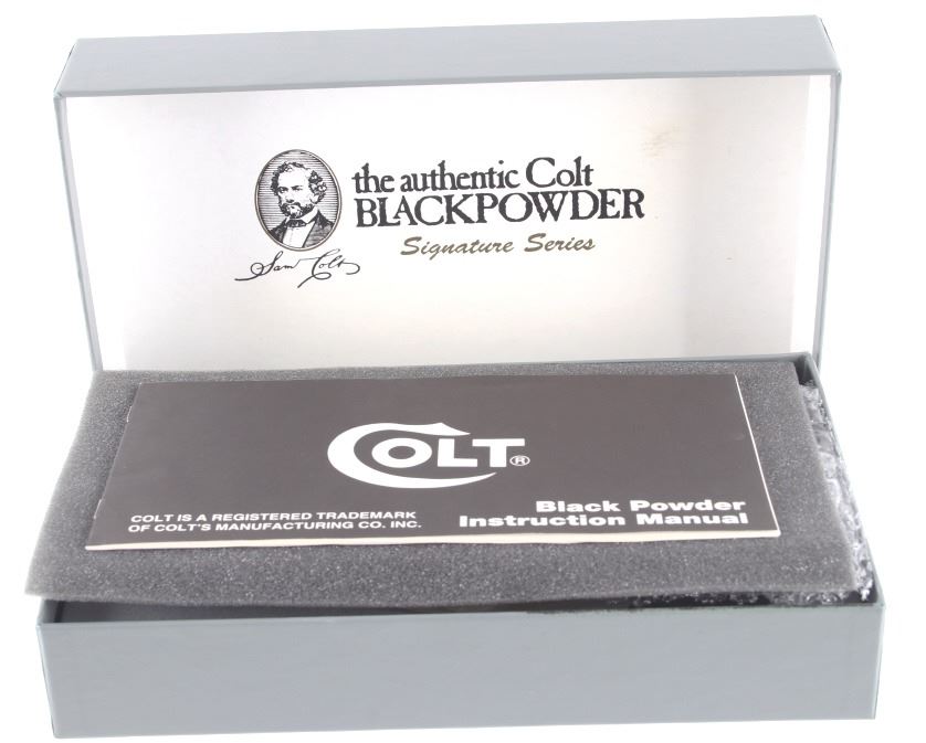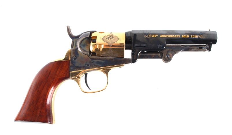 Included in this lot is a Black Powder Signature Series Colt Model 1849 Pocket Revolver with 4” octagon barrel chambered in .32 caliber and calibrating the 150th Anniversary of the Gold Rush. A superb example five shot revolver that found favor with lawmen and outlaws alike who carried a small back-up revolver. It also found immediate acceptance by ladies of the evening, gamblers, well-heeled gentlemen, Civil War officers and enlisted men as personal weapons. Many of these also saw service in the gold fields of California. The Model 1849 was one of Colt’s most popular designs that was large enough for aimed fire, yet small enough to conceal in a waistband or an unobtrusive holster. Matching serial numbers on the frame, trigger guard, barrel, wedge, rammer and cylinder. The cylinder displays five etched medallions each depicting a figure or tool from the gold rush era and displays a gold finish along with the trigger guard and grip tang. The left wooden grip is set with a medallion depicting a man panning for gold with the edge marked "1849 GOLD RUSH 1999 150th ANNIVERSARY". The side of the octagonal barrel is marked in gold lettering reading "150th ANNIVERSARY GOLD RUSH". The barrel is correctly marked in the two-line style “ADDRESS COL. SAM COLT over NEW-YORK CITY.” along with “COLT’S PATENT” on the left side of the frame. Nice overall mint blue on the barrel with exceptional case colored frame, walnut grips. The revolver comes with its Signature series Colt Black Powder box. Serial Number: 342988. This firearm qualifies as an antique / black powder and does not require FFL Transfer or NICS Background Check. This is an original Colt from the factory and is from the Colt Black Powder Series.*