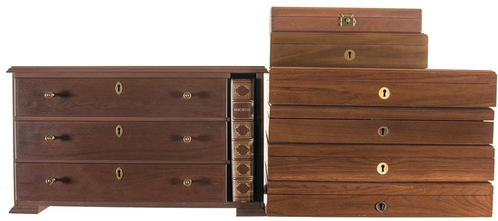 The lot includes approximately the following: 7 Colt blackpowder revolver fitted wood display cases (2 1851 Navy single, 3 3rd Model Dragoon pair, 2 1851 Navy pair, and 1 three drawer 1st, 2nd, & 3rd Model Dragoon case with Armsmear book and each drawer containing the appropriate accessories) Excellent to near new. 30 assorted Colt, James Dixon and Italian reproduction powder flasks, most are boxed (Approximately 10 Baby Dragoon, 1 Remington, 1 James Dixon Baby Dragoon, 2 James Dixon bag type, 4 Dragoons, 8 1851 Navy, 2 "Klay" style flasks and 3 empty flask boxes) Very good to near new. 2 Shoulder stocks, one is boxed. Very good to near new. 28 assorted screwdriver/nipple wrenches for Dragoons, 1851 Navy and 1860 Army) Very good to near new. 5 assorted bullet molds. Excellent to near new. 27 reproduction Eley Bros cap tins. Excellent to near new. 21 assorted one and two piece Colt grip sets (1 brass, 6 ivory and 14 wood). Excellent to near new. 1 set of Colt Baby Dragoon accessories (flask, mold, wrench and cap tin). Excellent. 6 reproduction boxes of cartridges for Colt revolvers (2 .36 Cal, 1 .44 Cal. And 3 belt revolver). Excellent. 2 Colt brochure stands with brochures. Excellent. Miscellaneous Colt manuals, brochures, photos and pamphlets. Excellent. 1 Small case of 14 Colt grip medallions (Gold & Silver). Excellent. 1 Colt case plaque. Excellent. 8 Colt Blackpowder Series pins. Excellent. 8 Colt brass & pewter belt buckles and 1 empty buckle box. Excellent.