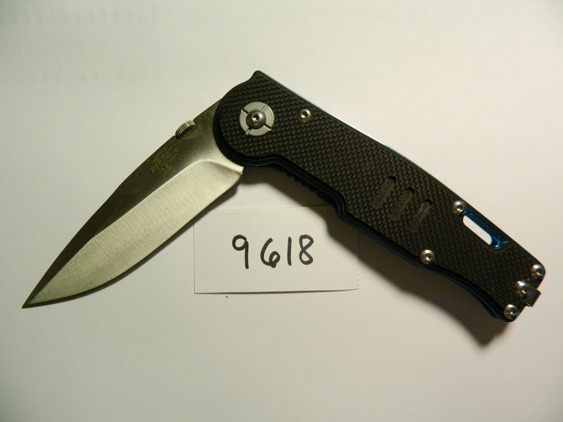 Black and Blue Linerlock - 6" closed. 4 1/8" stainless blade with thumb lug. Blue anodized aluminum liners with textured black G-10 onlay handle scales. Lanyard slot. Stainless pocket clip.