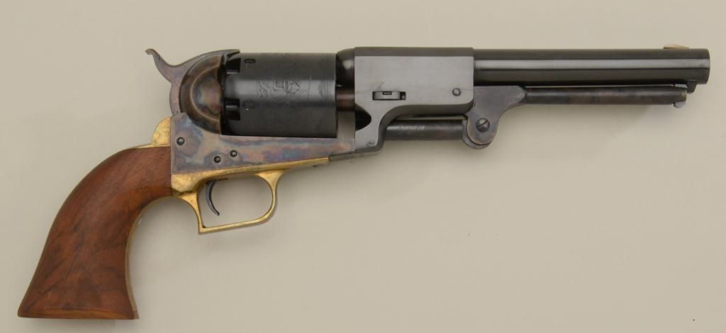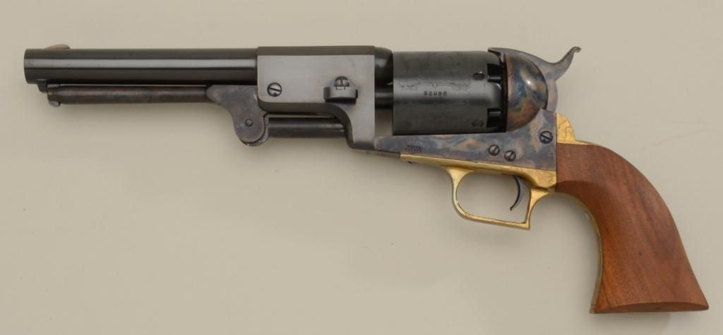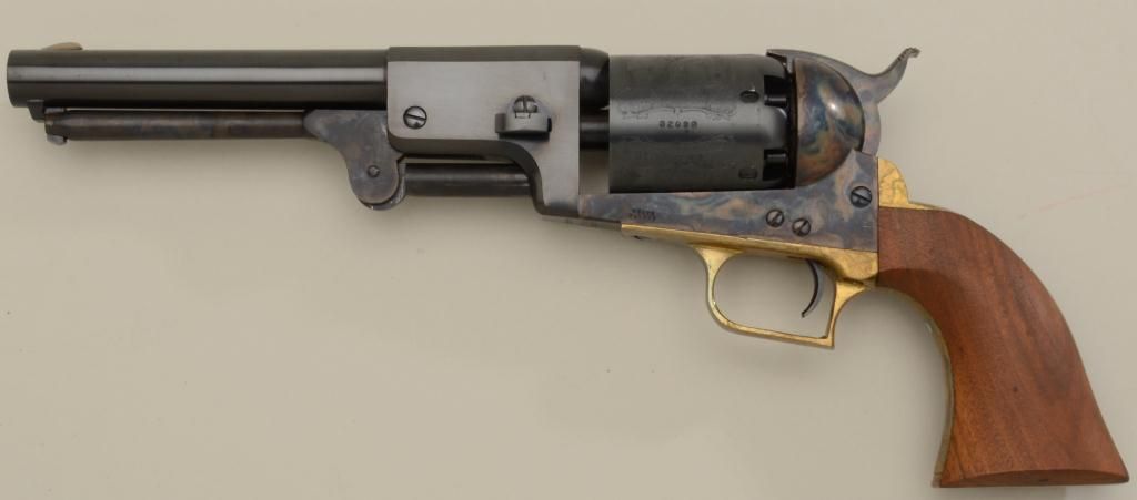 Colt Blackpowder Series First Model Dragoon percussion revolver, .44 cal., 7-1/2” barrel, blue and case hardened finish, wood grips, #32099. This gun is in like new condition showing little handling with original factory cardboard box, hang tag and instructions. Est.: $500-$1,000.