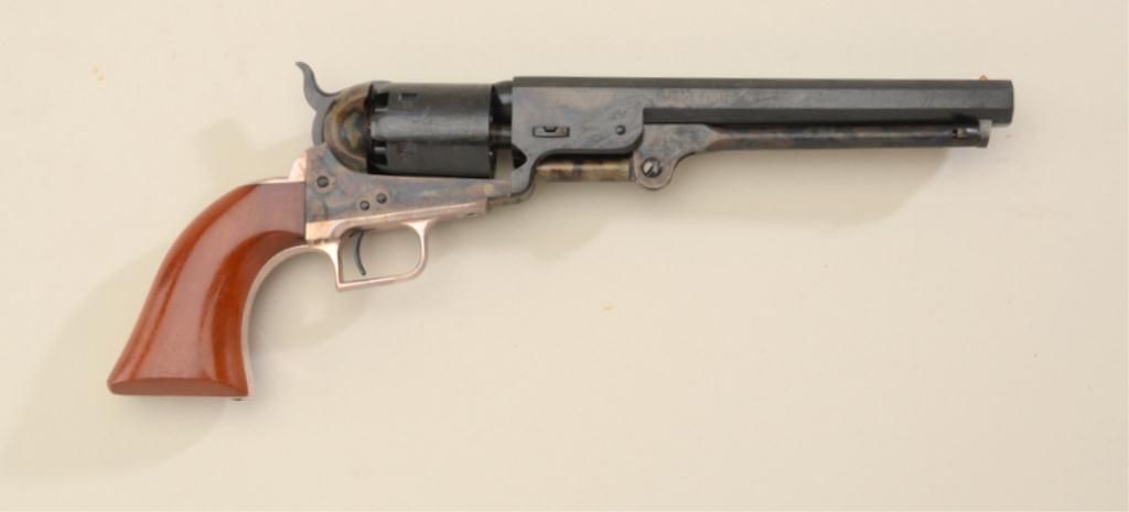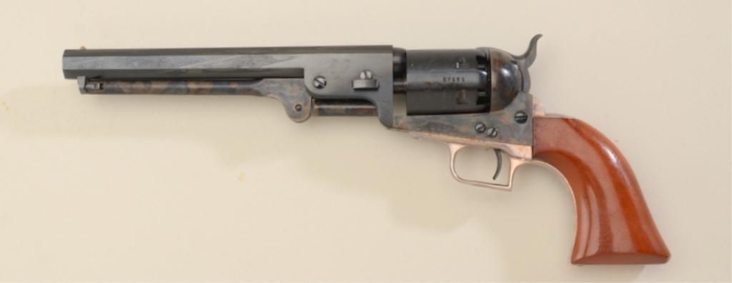 Colt Blackpowder Series Model 1851 Navy percussion revolver, .36 cal., 7-1/2” octagon barrel, blue and case hardened finish, wood grips, #27960 with factory cardboard box, inserts and instructions manual; box isoverall good. Est.: $400-$800.