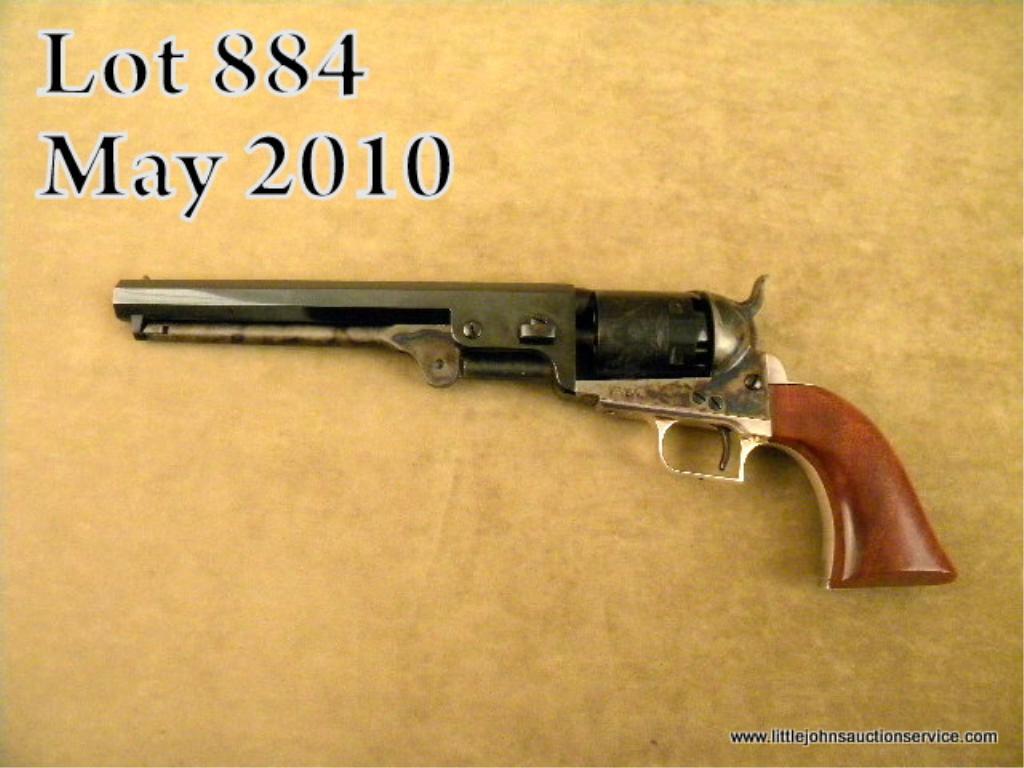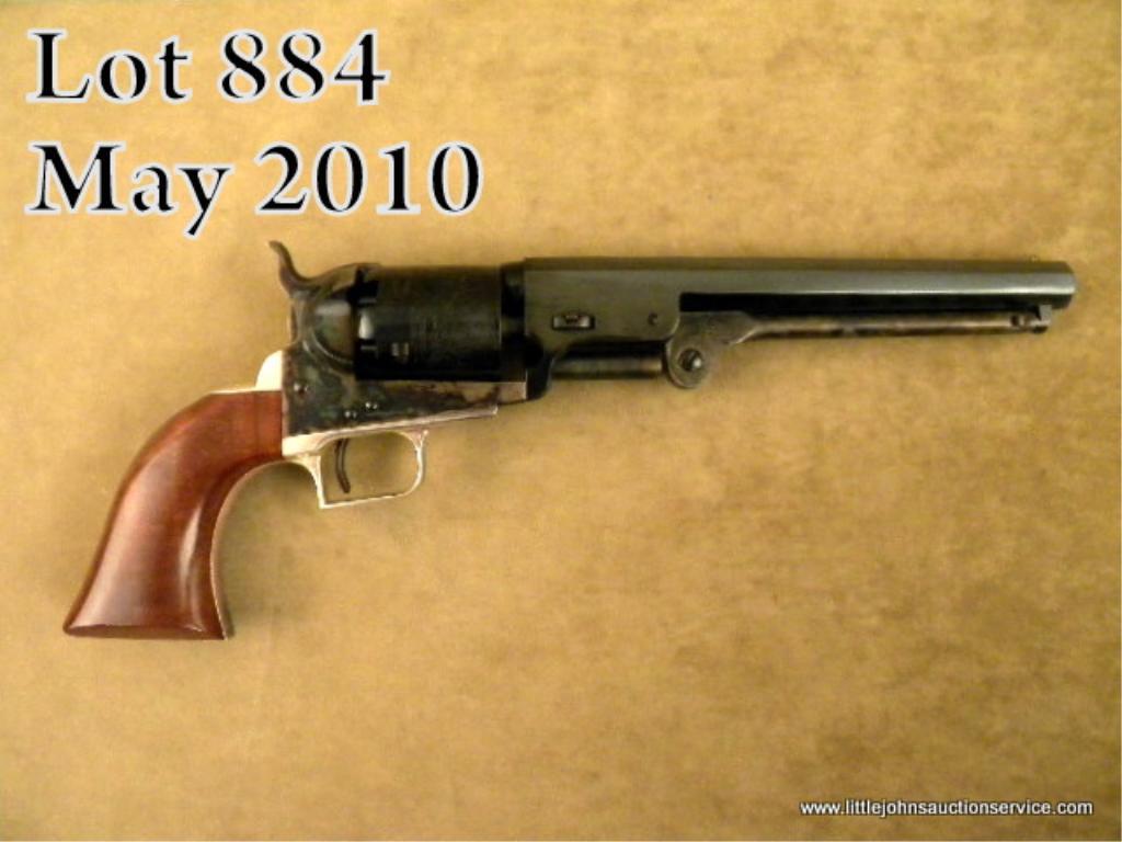 Colt Blackpowder Series Model 1851 Squareback Navy percussion revolver, .36 cal., 7-1/2” octagon barrel, blue and case hardened finish, wood grips, #15680. This modern generation of the famous Model 1851 Colt is in overall like new conditionshowing little handling; accompanied by Colt wood grain cardboard box that is in overall fair + condition. Est.: $300-$600.