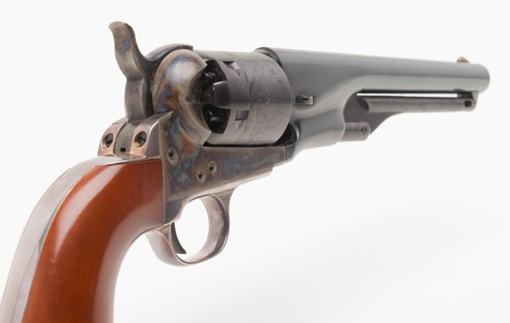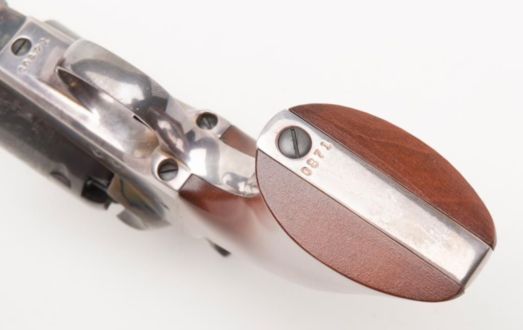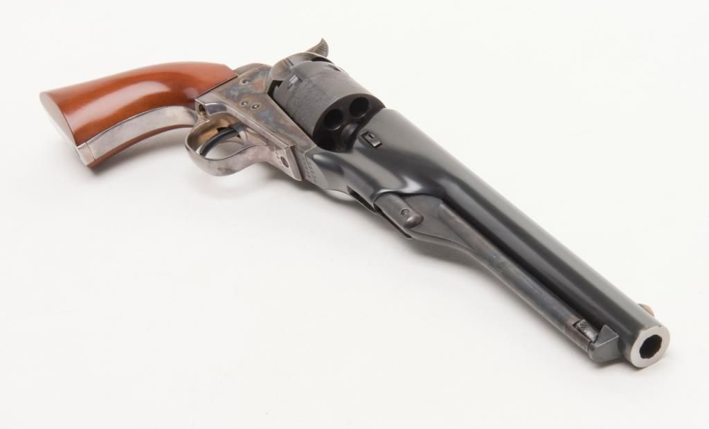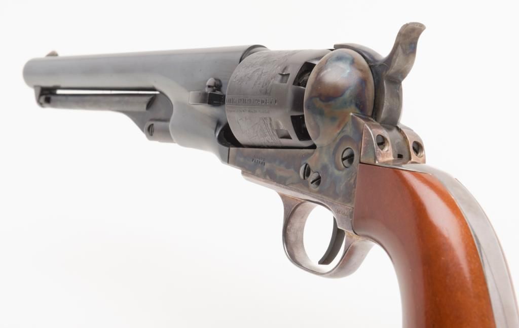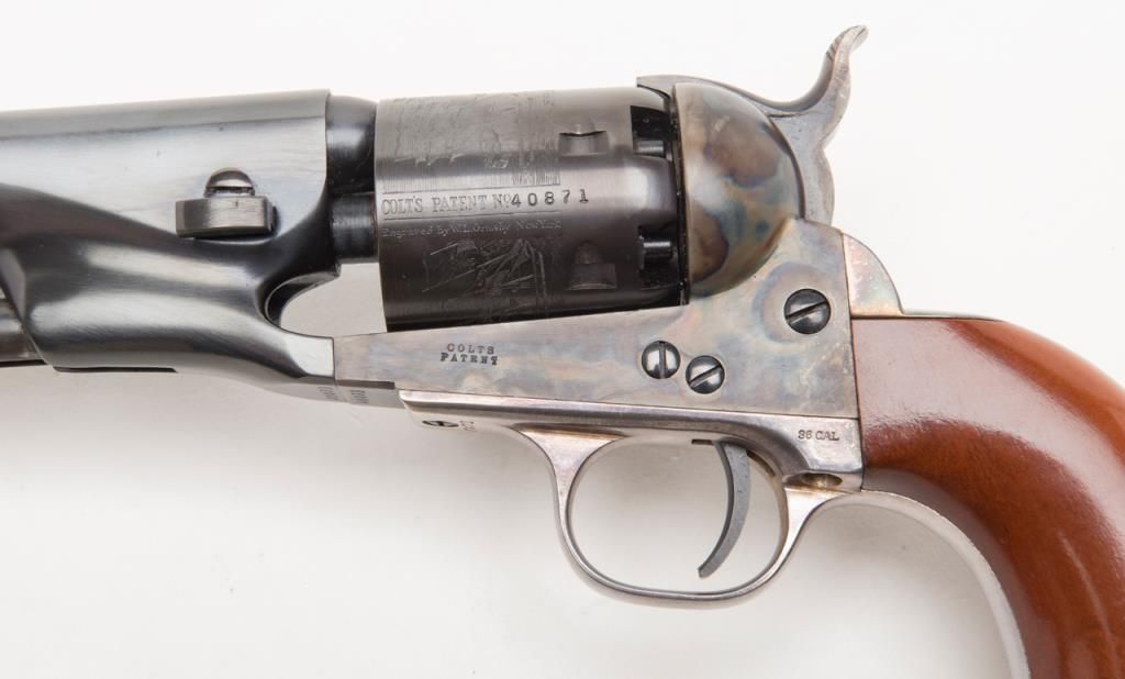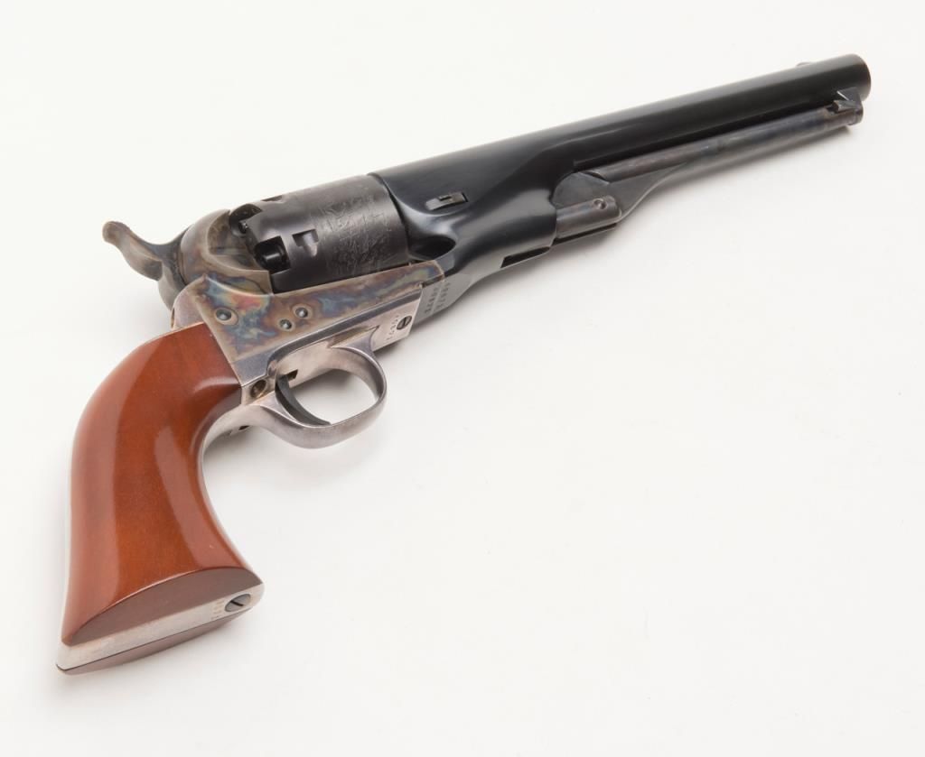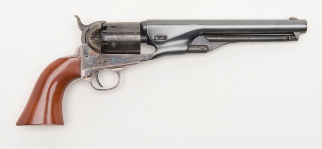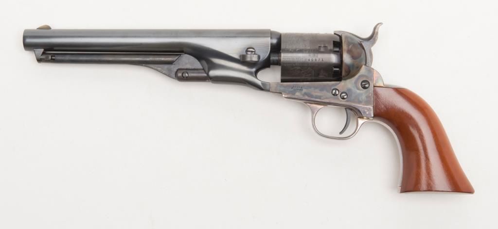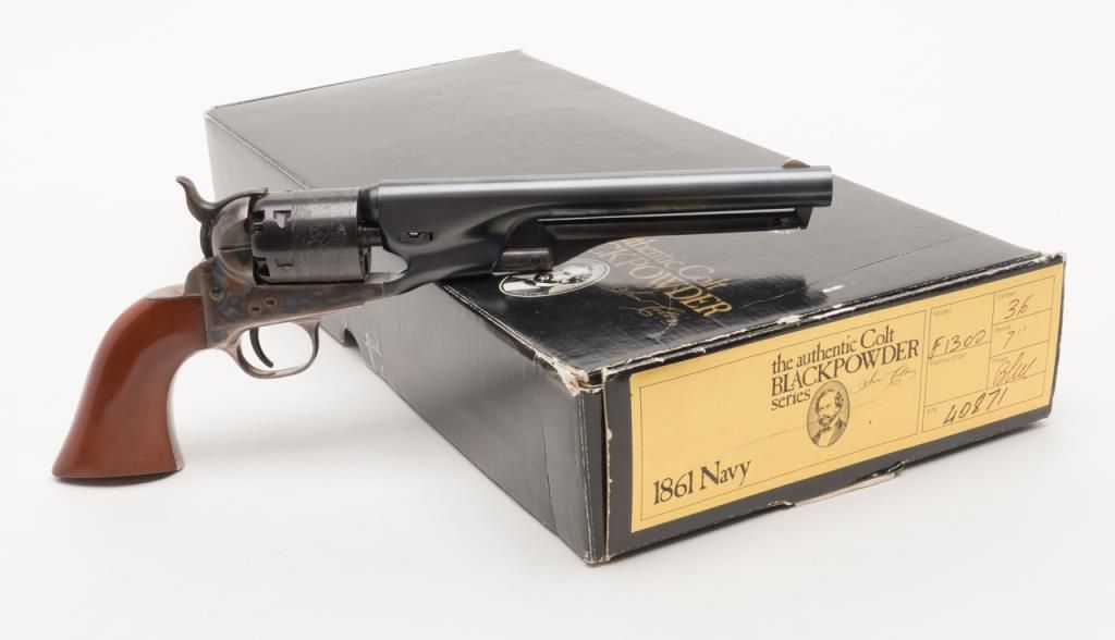 Colt Blackpowder Series Model 1861 Navy percussion revolver, .36 cal., 7-1/2” barrel, blue and case hardened finish, wood grips, #40871. This gun is in like new condition showing little handling with original factory cardboard box, hang tag andinstructions. Est.: $400-$800.