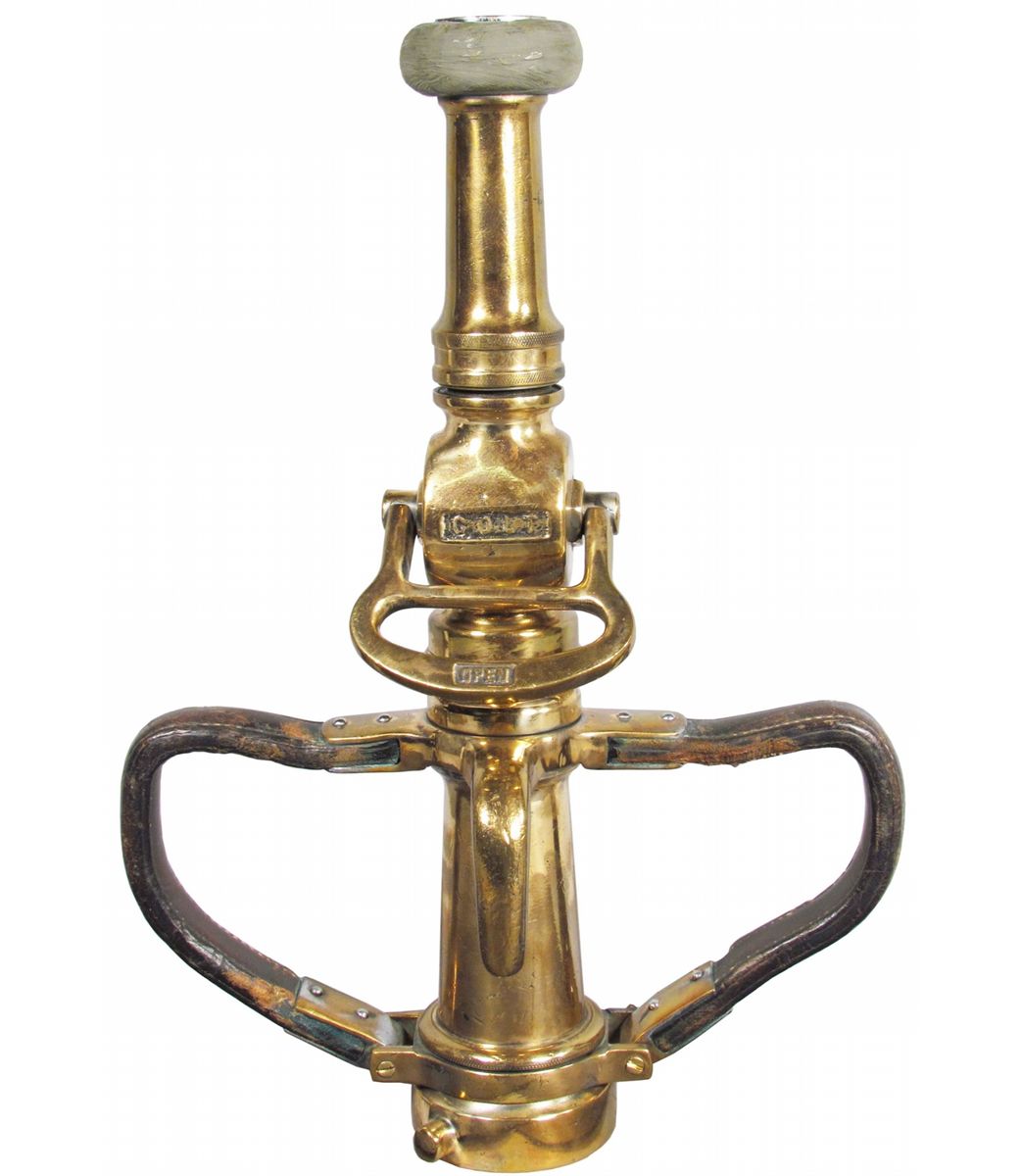 Colt Brass Playpipe Nozzle. 2 1/2 inch with leather handles. Marked RFC at bottom. 18 1/4 inches tall.