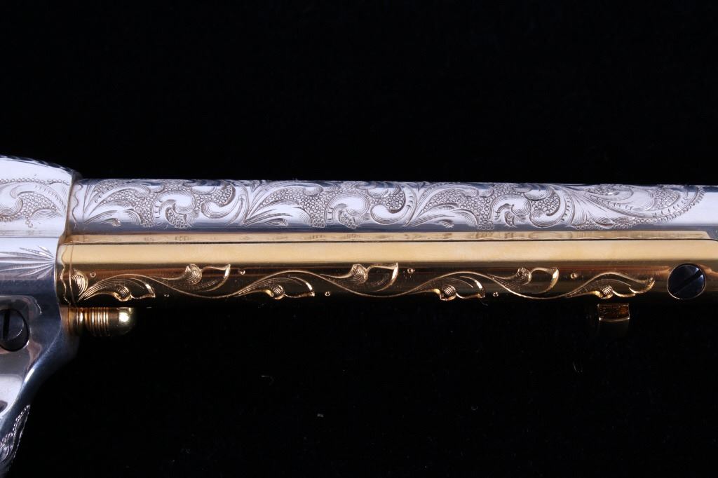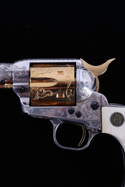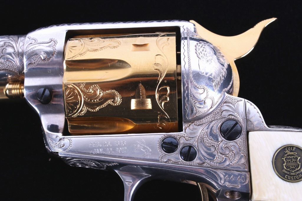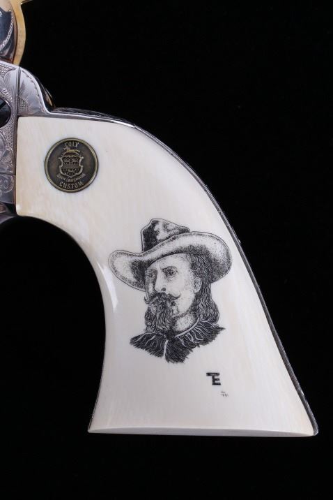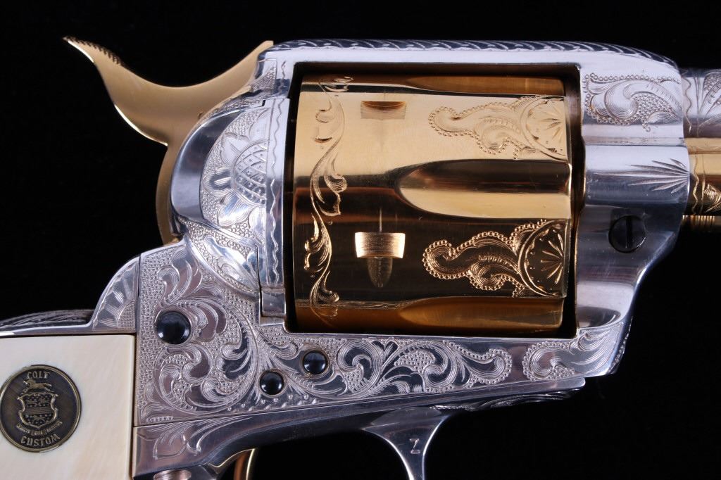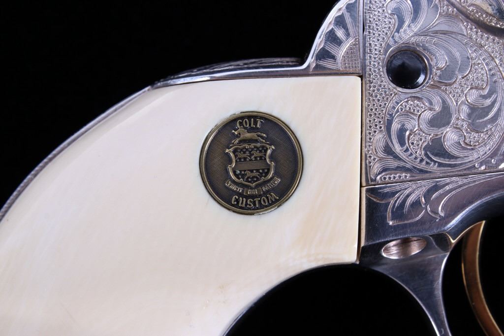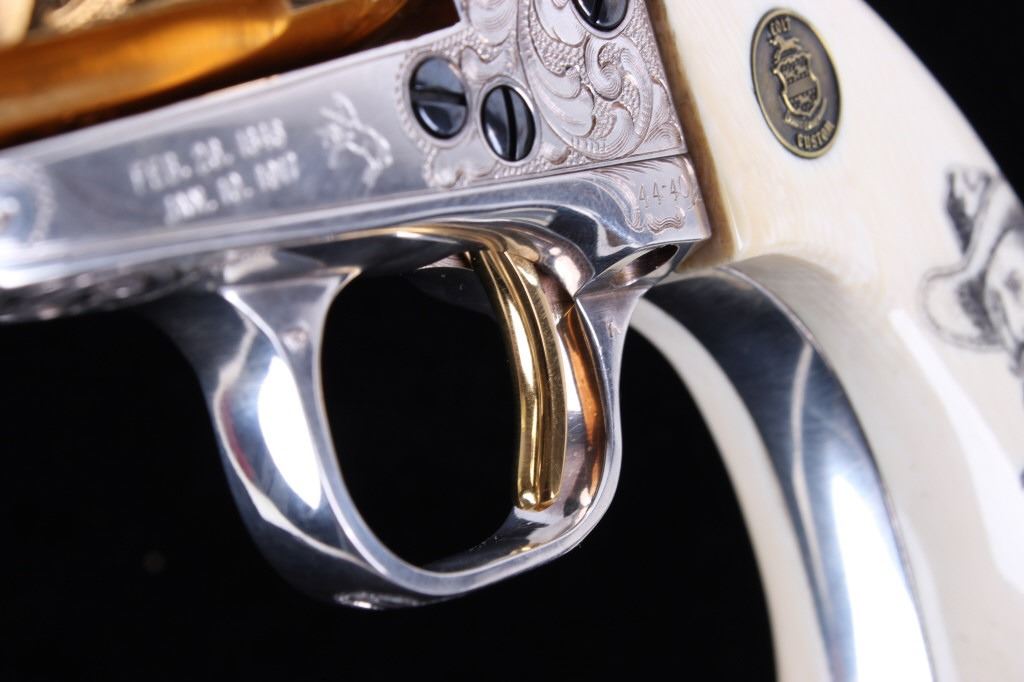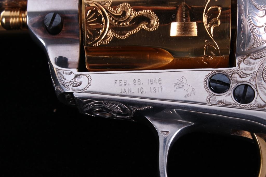 Offered for sale is this special edition Buffalo Bill Historical Center – Winchester Museum Colt Single Action Army revolver which utilizes a 7 ½” fluted barrel chambered in .44-40 and featuring gold and silver plating. As well as extensive coverage of hand engraving (done by A.A. White Engravers) in the Colt style of the 1880s and solid ivory grips with scrimshawed Buffalo Bill motifs and his "TE" cattle brand. The grip panels feature the Colt Custom shop medallion. The barrel is inscribed: Buffalo Bill Historical Center/ Winchester Museum 1 of 250. The back strap is engraved with W.F. Cody’s signature. The left side of the barrel features Winchester’s historic pony express rider and the recoil shield has a bison head among the featured, hand engraved details. In place of the standard Colt patent dates are Cody’s birth and death dates – February 26, 1846 – January 10, 1917”. Also included with this firearm is the original paperwork from the Buffalo Bill Historical Center. Included in this paperwork is the original letter from the Buffalo Bill Historical Center giving first notice to the original buyer about the production of the Colt Limited Edition revolver. As well as the request for reservation of the corresponding serial number to the Scriver bronze in the previous lot (95). The acknowledgement of arrival to the Museum shop at the Buffalo Bill Historical Center of the Colt Revolver and lastly the letter from Colt of the information being inserted into their records of the firearm. The piece is accompanied with a gold embossed and inscribed leather case with French fit velvet interior custom built by Colt’s finest case maker. The cases were produced by Arno Werner, Chief Bookbinder for Harvard's Houghton Library until 1982. These serial numbers are a custom exclusive run from 1WM to 250WM. Serial Number: 157BB. This is a modern firearm and requires a FFL transfer or NICS background check.
