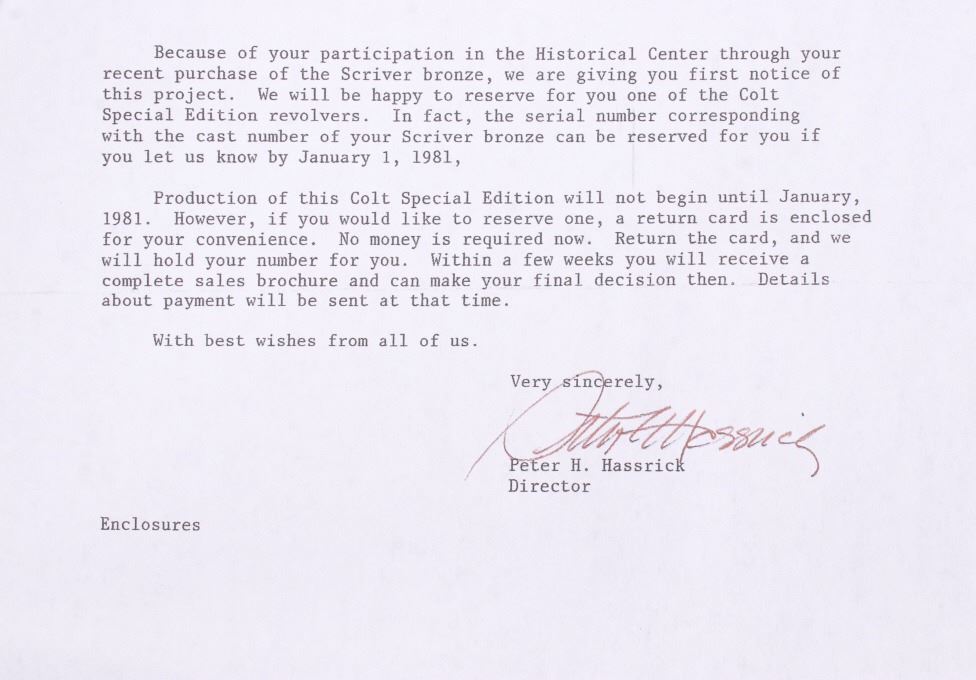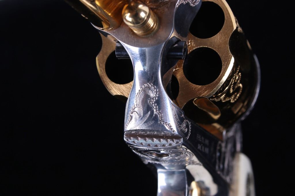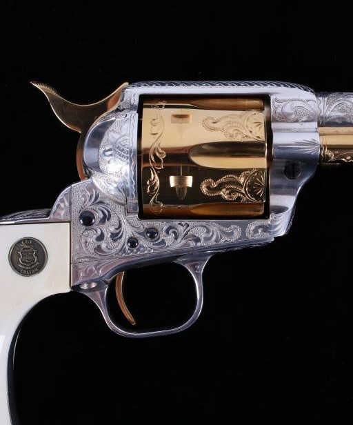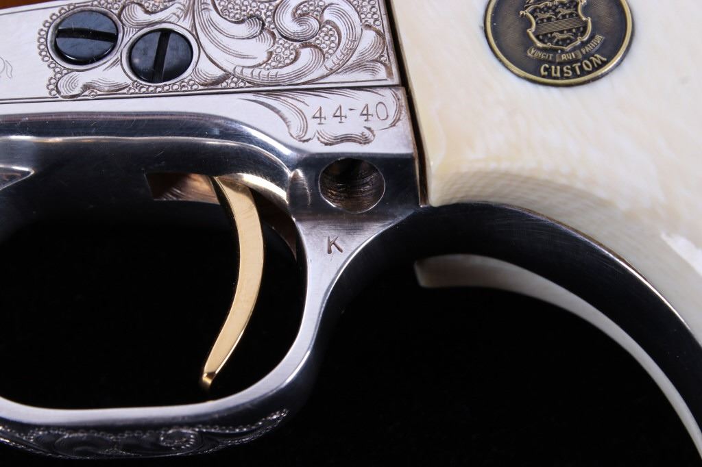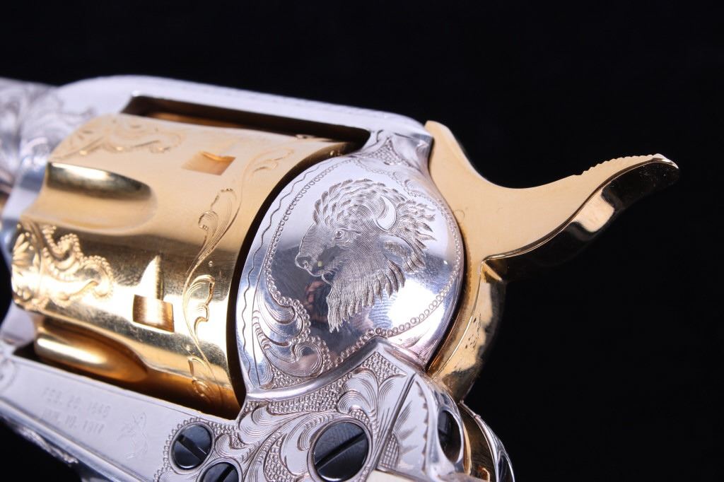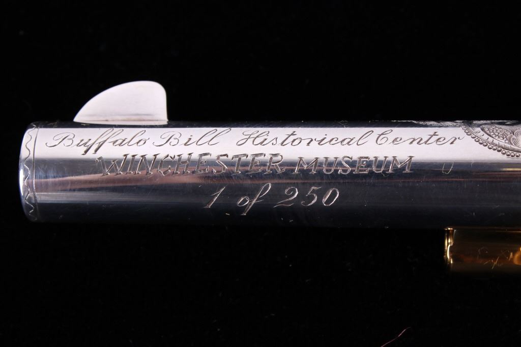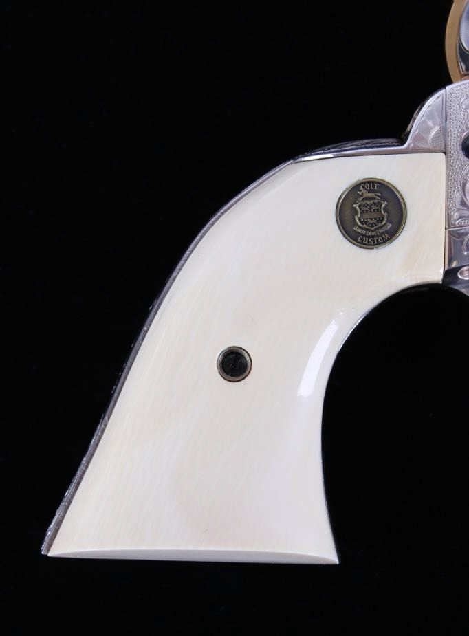 Offered for sale is this special edition Buffalo Bill Historical Center – Winchester Museum Colt Single Action Army revolver which utilizes a 7 ½” fluted barrel chambered in .44-40 and featuring gold and silver plating. As well as extensive coverage of hand engraving (done by A.A. White Engravers) in the Colt style of the 1880s and solid ivory grips with scrimshawed Buffalo Bill motifs and his "TE" cattle brand. The grip panels feature the Colt Custom shop medallion. The barrel is inscribed: Buffalo Bill Historical Center/ Winchester Museum 1 of 250. The back strap is engraved with W.F. Cody’s signature. The left side of the barrel features Winchester’s historic pony express rider and the recoil shield has a bison head among the featured, hand engraved details. In place of the standard Colt patent dates are Cody’s birth and death dates – February 26, 1846 – January 10, 1917”. Also included with this firearm is the original paperwork from the Buffalo Bill Historical Center. Included in this paperwork is the original letter from the Buffalo Bill Historical Center giving first notice to the original buyer about the production of the Colt Limited Edition revolver. As well as the request for reservation of the corresponding serial number to the Scriver bronze in the previous lot (95). The acknowledgement of arrival to the Museum shop at the Buffalo Bill Historical Center of the Colt Revolver and lastly the letter from Colt of the information being inserted into their records of the firearm. The piece is accompanied with a gold embossed and inscribed leather case with French fit velvet interior custom built by Colt’s finest case maker. The cases were produced by Arno Werner, Chief Bookbinder for Harvard's Houghton Library until 1982. These serial numbers are a custom exclusive run from 1WM to 250WM. Serial Number: 157BB. This is a modern firearm and requires a FFL transfer or NICS background check.