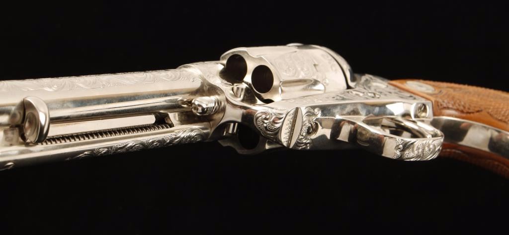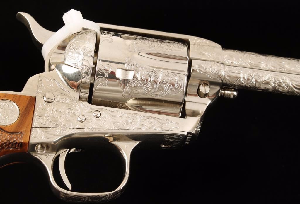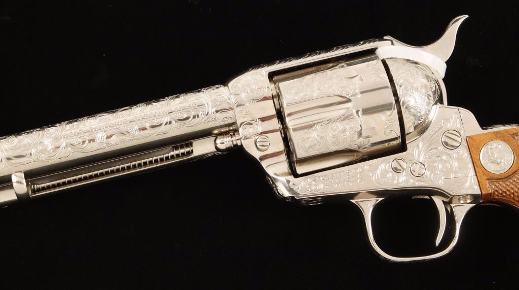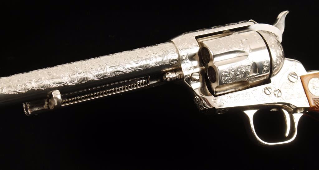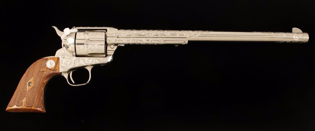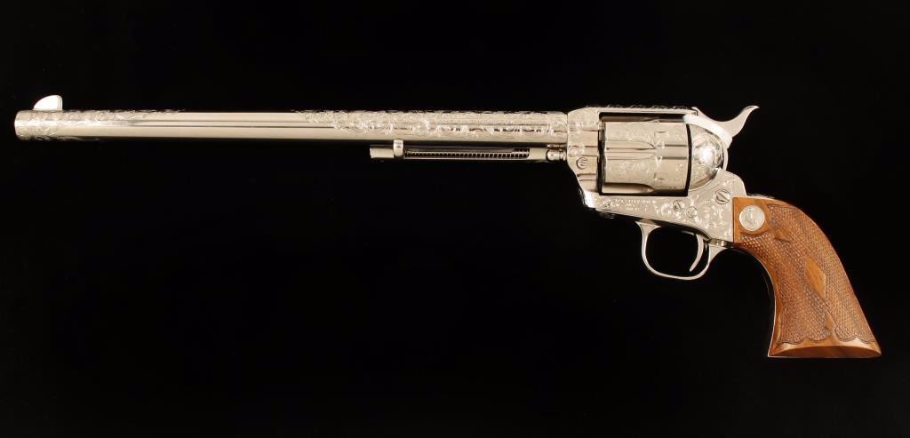 'Third Generation' Factory engraved long barreled single action revolver chambered in .44-40, circa 1985. Features a nickel plated finish, fine factory "D" coverage engraving, 12" barrel, blade front sight, notched rear sight, fluted six-shot cylinder, ejector rod, checkered hammer spur, black powder dates and Colt medallion fancy checkered two-piece walnut grips. Includes original box and documents. Finish shows no sign of wear. Action is smooth, bore is bright and grips are fine. Condition is like new in box. ***Modern Firearm***