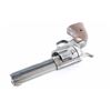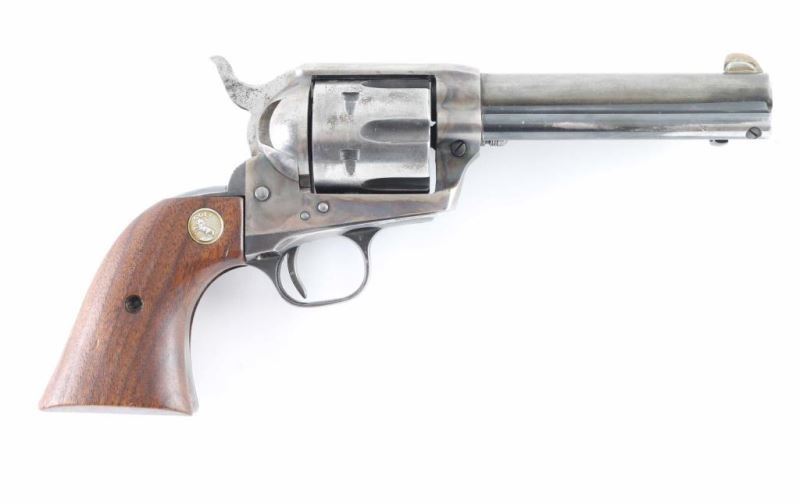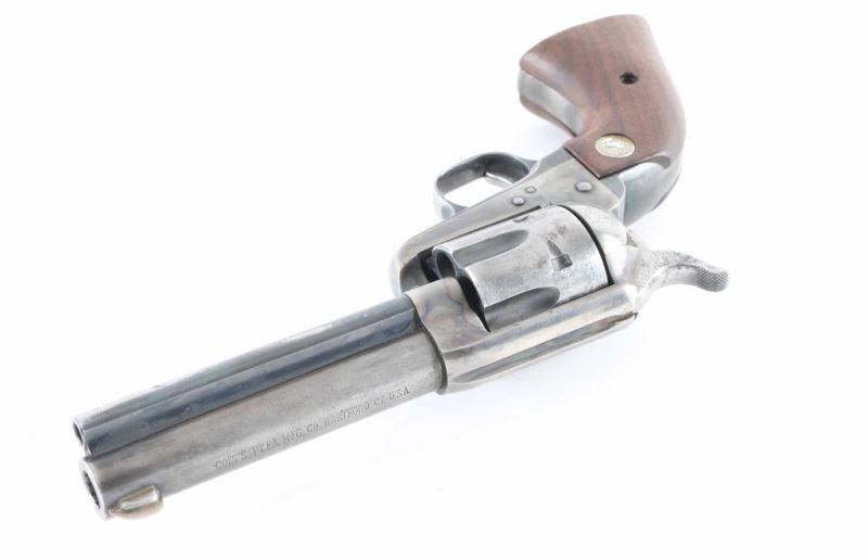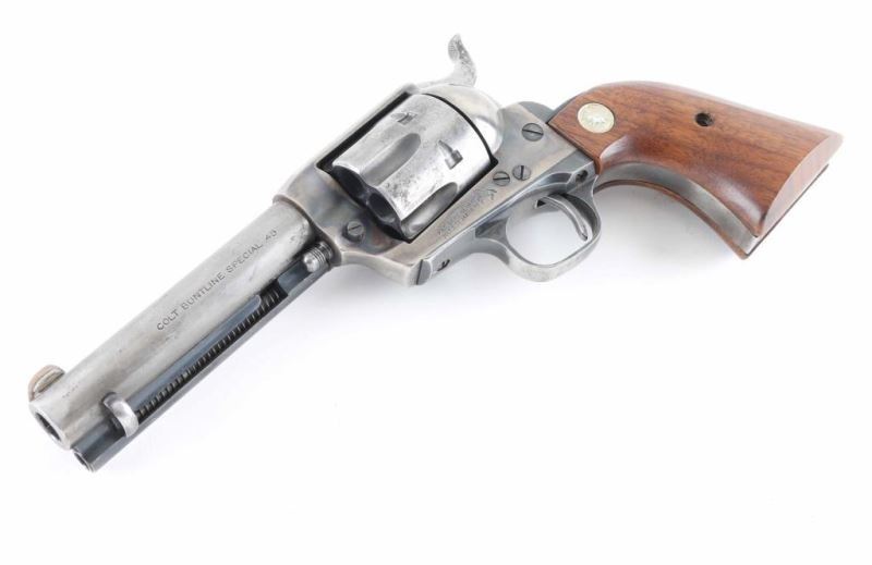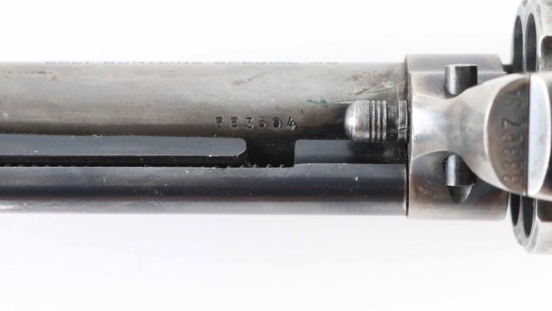 Revolver. Single-Action. 6-rd Capacity. 2nd Generation. manufactured 1960. Designed by Stuart Lake, biographer of Wyatt Earp. Produced 1957-1992. Originally having a 12" barrel, the revolvers barrel has been cut down to 4 3/4". Crude brass blade front sight added. Standard markings with "COLT BUNTLINE SPECIAL .45" stamped on left side of barrel. Blued metal finish with case-hardened frame. Chrome trigger. Smooth walnut grips with gold toned "Rampant Colt" medallions. Sleeved cylinder pin. Bore and cylinders appear very good but dirty. Metal finish is about 30% with blue remaining mostly on triggerguard, and ejector rod housing. Grips are very good. Bottom of barrel stamped BB3604. Assembly number 119 on loading gate. Action is smooth/tight. NRA Condition-Good (Barrel Cut Down) C&R Firearm.