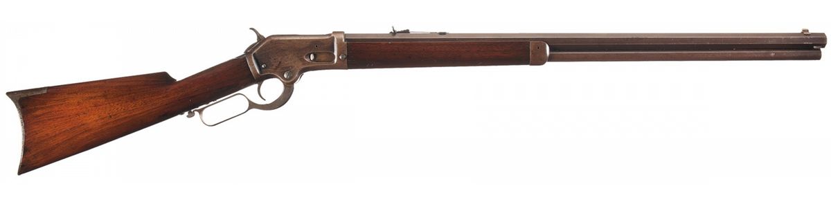 Condition: Near fine. The rifle retains 30% plus original blue finish showing streaks of blue on the barrel and strong in the protected areas of the receiver. The hammer and lever show traces of muted original case colors in the protected areas. The wood has been refinished and remains very good with half of the varnish remaining and showing a few minor dents and scratches. The markings are clear. The action functions fine, but the lever will not stay up without being latched.