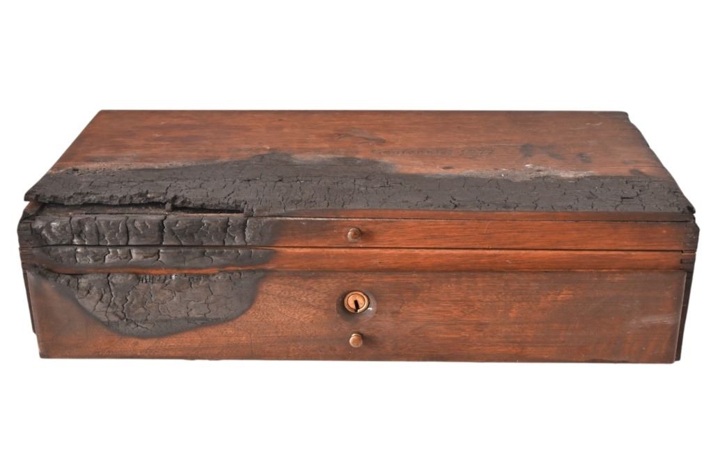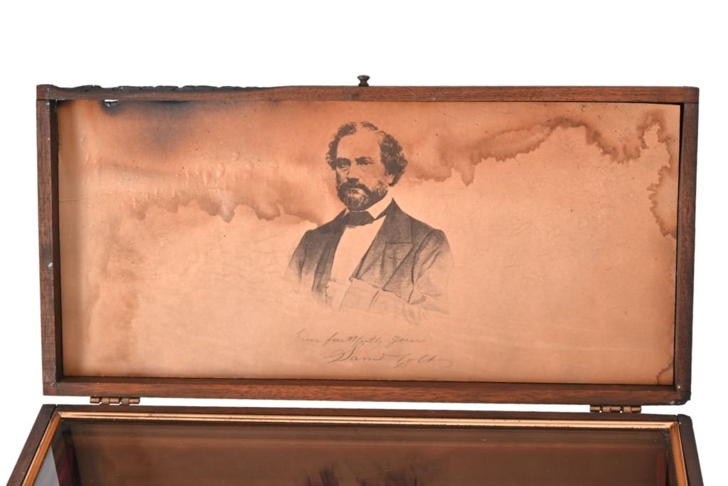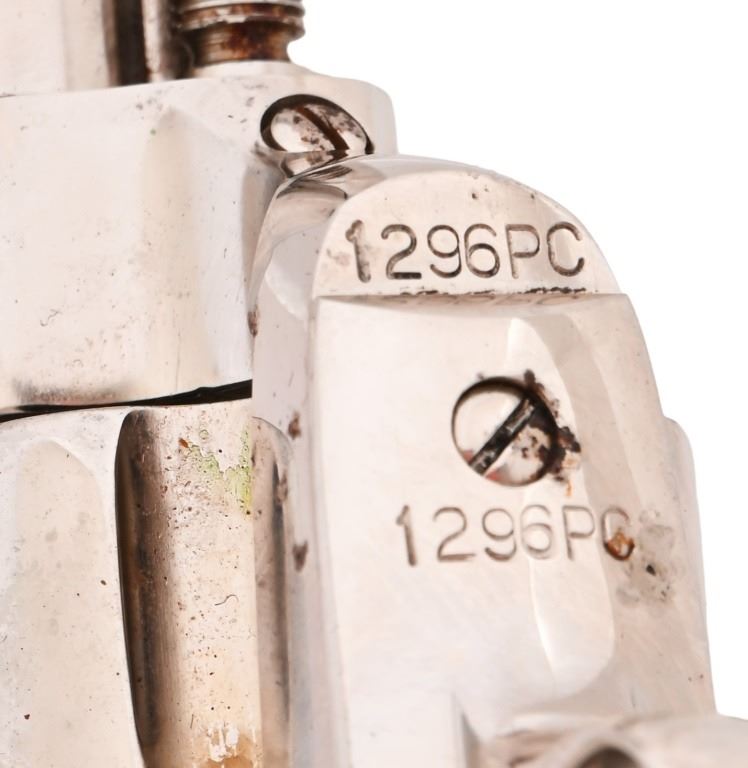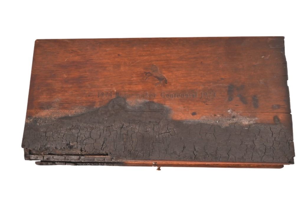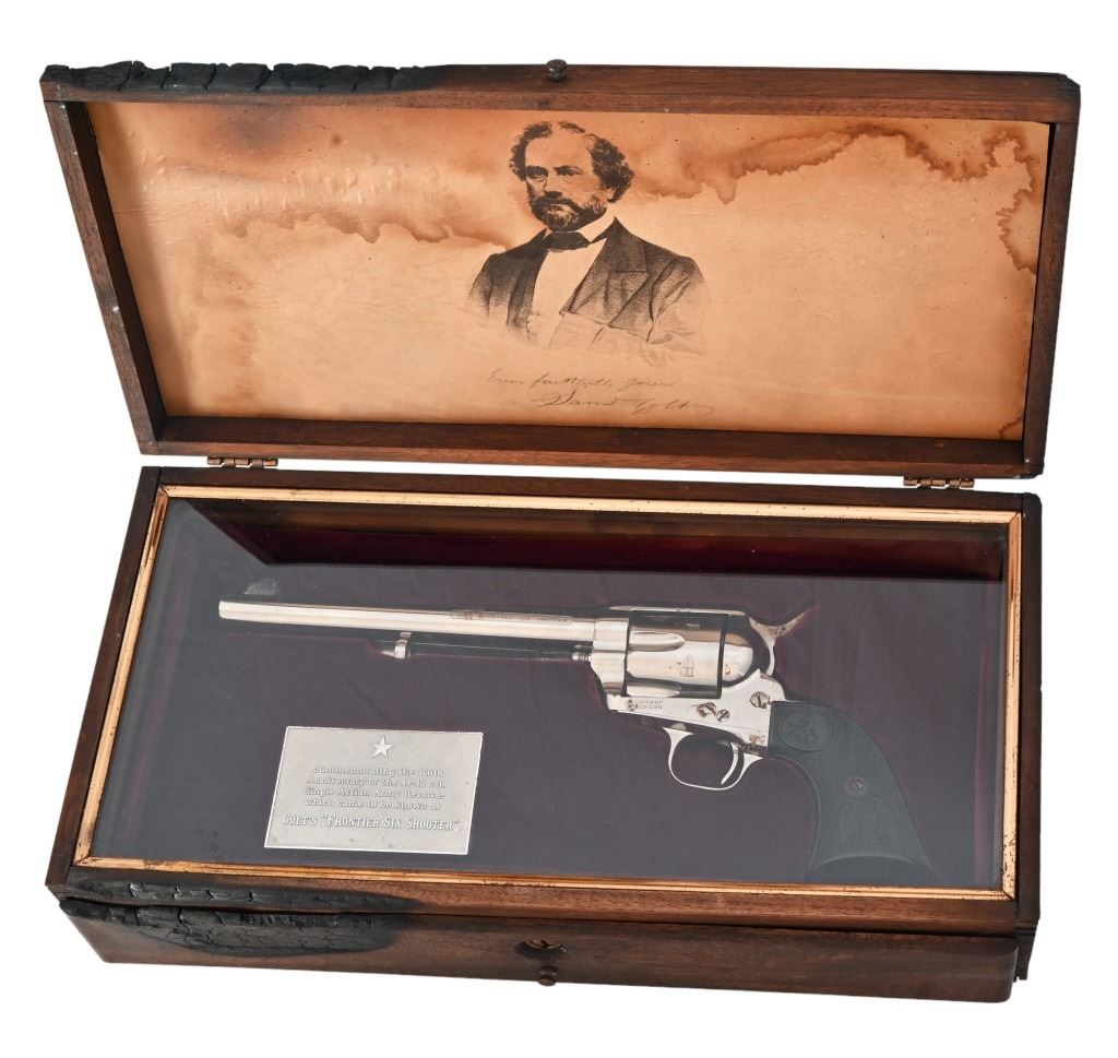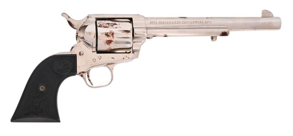 SN 1296PC. 1873 - 1973 Cased Colt Centennial frontier six shooter, celebrating 100 yrs. of the .44-40 cartridge. 7.5" barrel, nickel plated. Unfortunately box and gun were exposed to fire. Sever damage to box, some damage to finish of gun. Action functions, bore and cylinders are fine. Modern