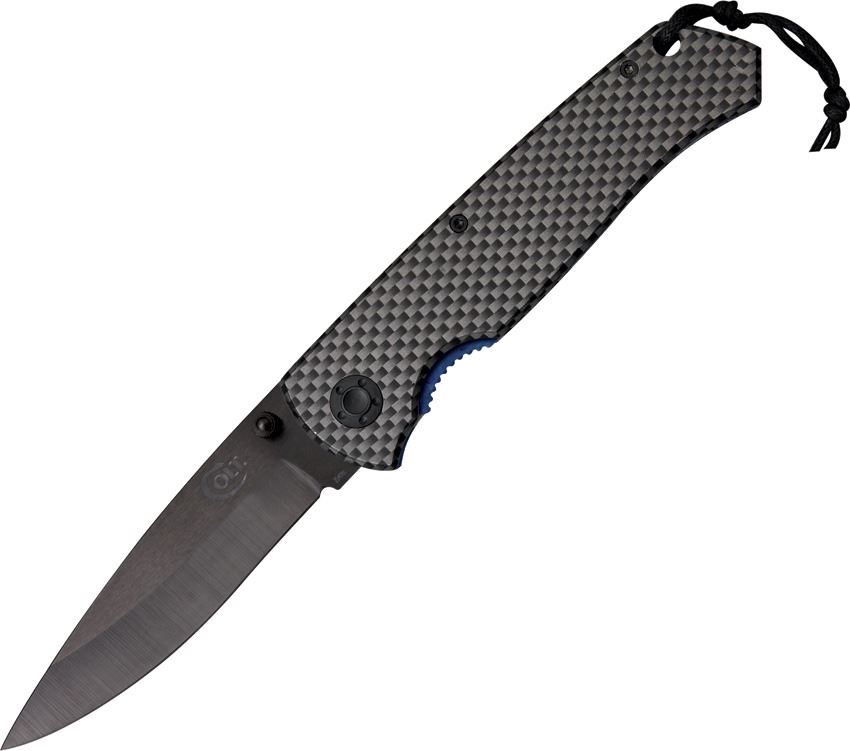 4 3/8" closed. 3 1/4" black ceramic blade with dual thumb studs. Carbon fiber pattern aluminum handles with blue aluminum liners. Black lanyard. Black stainless pocket clip.