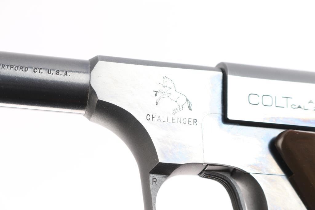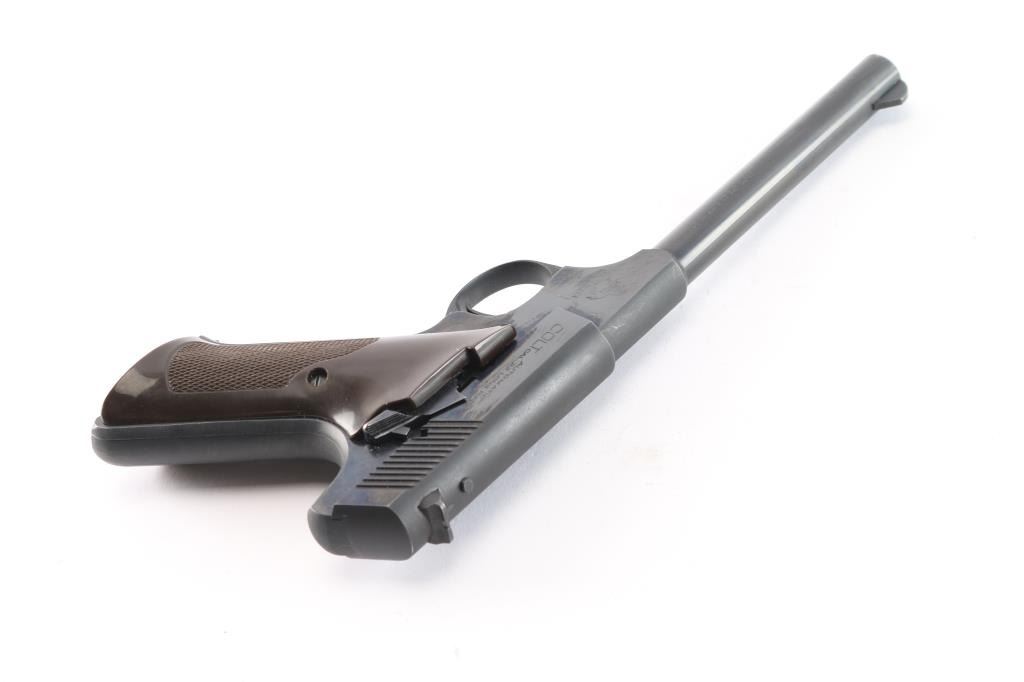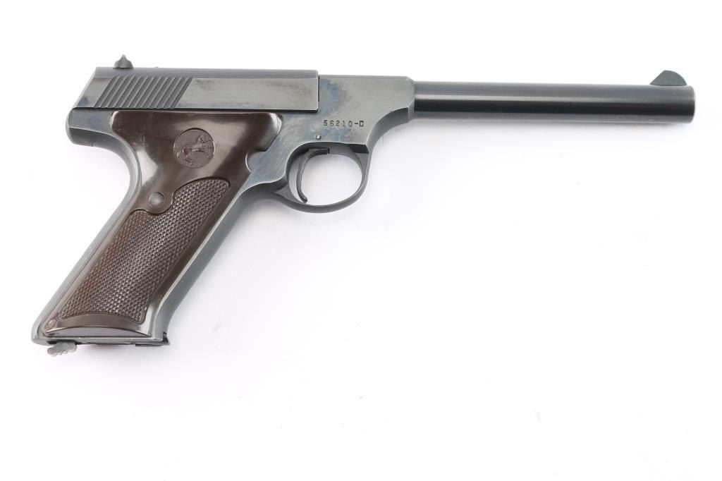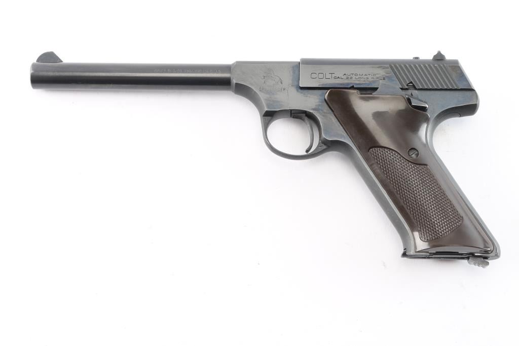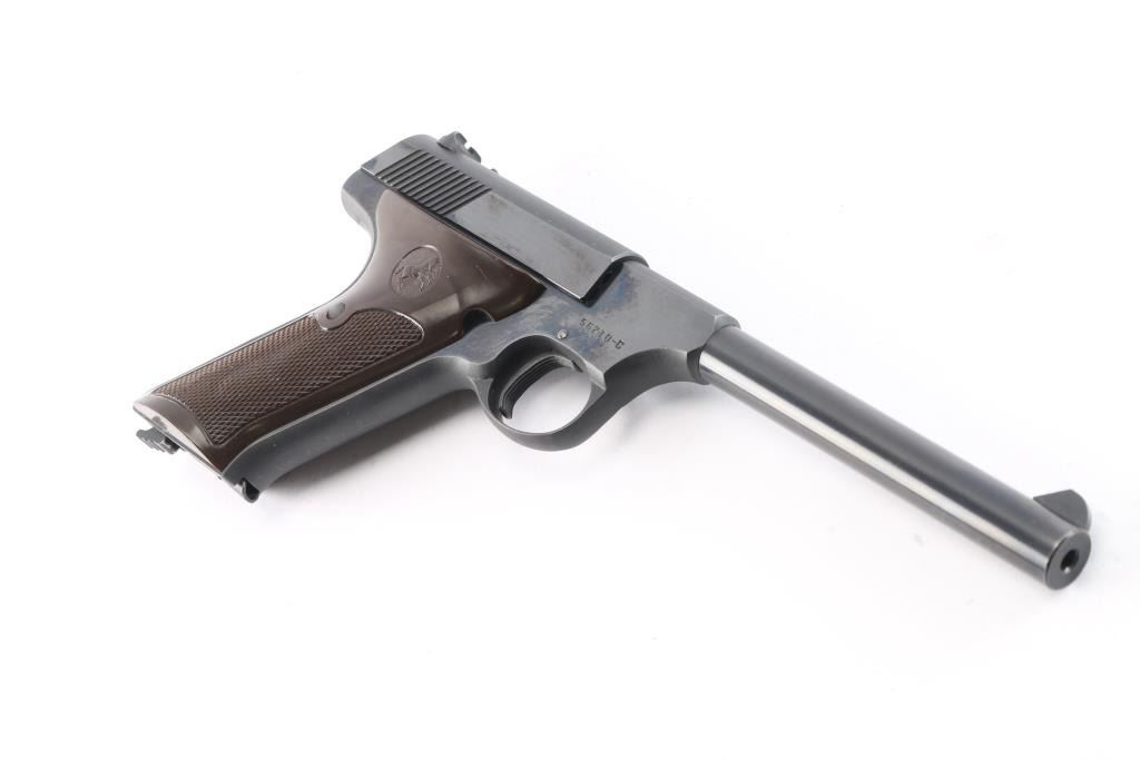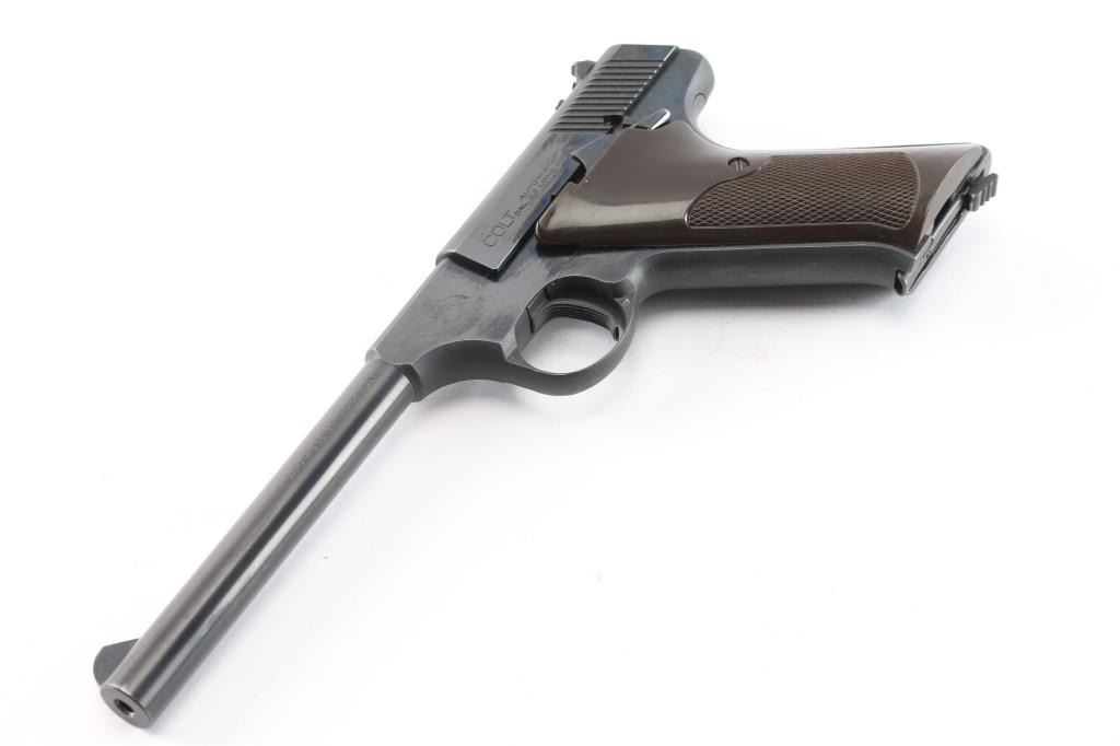 'Second Series' Vintage single action semi-automatic target pistol chambered in .22 Long Rifle, manufactured circa 1952. (1950-55) Features a blued finish, 6" straight taper barrel, blade front sight, dovetailed rear sight with square notch, serrated semi-flat faced trigger, concealed hammer, heel magazine release, factory 10 round magazine, thumb safety/slide catch, steel frame and two-piece faux wood checkered brown plastic grips with molded Rampant Colt decor on the right panel. Pistol exhibits approximately 98% of it's original blued finish showing light edge wear. Action is smooth, the bore appears excellent/bright and the plastic grips are very good+.