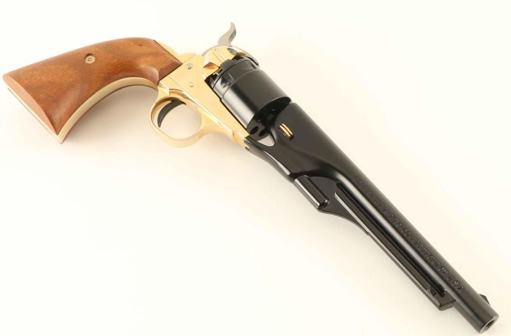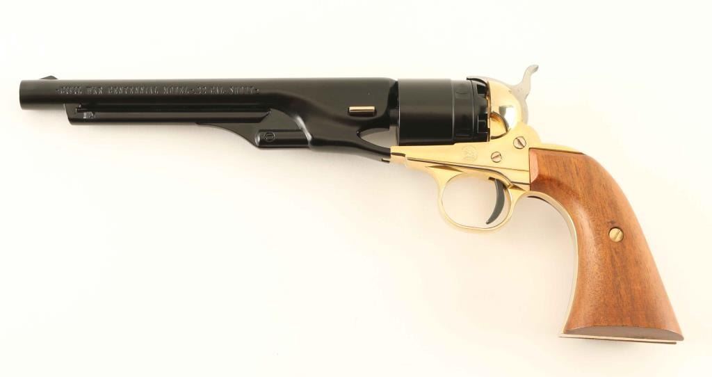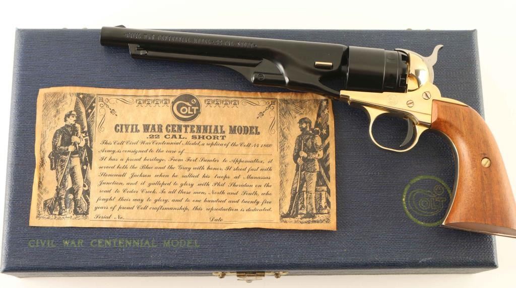 Cased single-shot rimfire pistol commemorating the 100 year anniversary of the American Civil War, manufactured circa 1961. Aesthetically a scaled down version of the 1860 Army, with 24,114 pistol reported to have been produced. Features a satin black/bright gold plated finished, 6" round barrel, non-working loading lever, stationary non-fluted cylinder, smooth trigger, round trigger guard, serrated hammer spur, roll stamped engraved butt and two-piece walnut grips. Includes a factory presentation case with fitted grey velvet interior and document. Pistol exhibits approximately 98% of it's original finish showing a ding in the right side of the barrel, a couple light handling marks and minor losses around the barrel wedge. Action is crisp, bore is appear very good but dirty, and the wood grips are fine. Condition is NRA Excellent in box. ***C&R Firearm***
