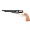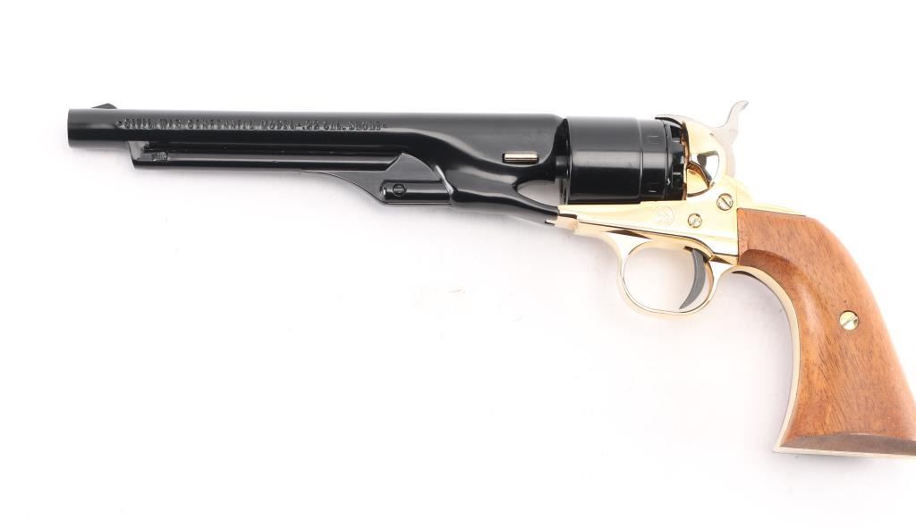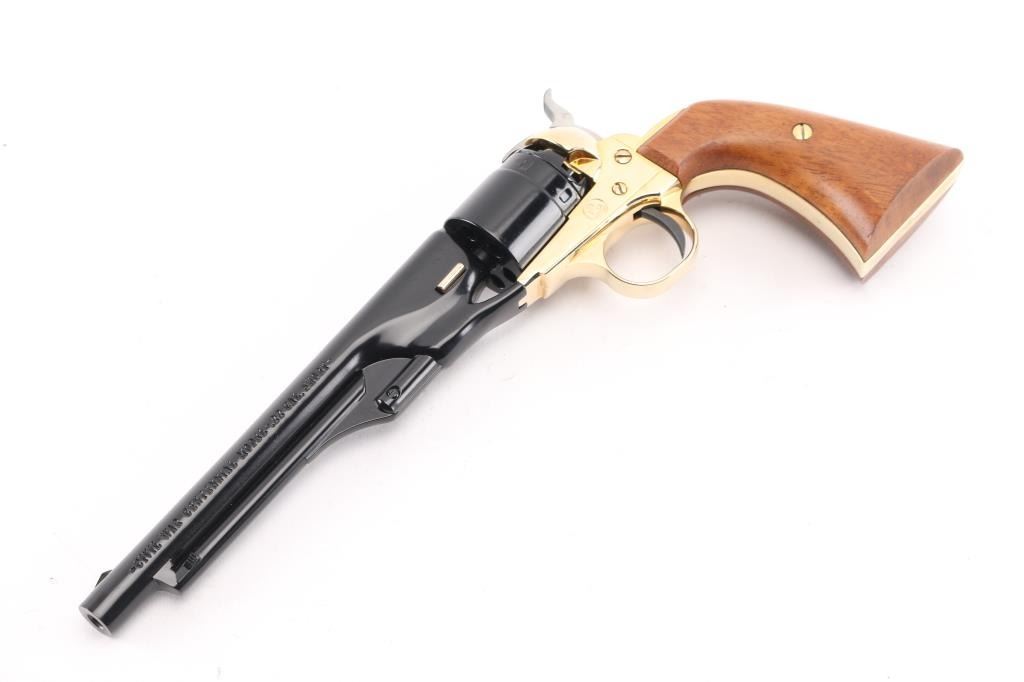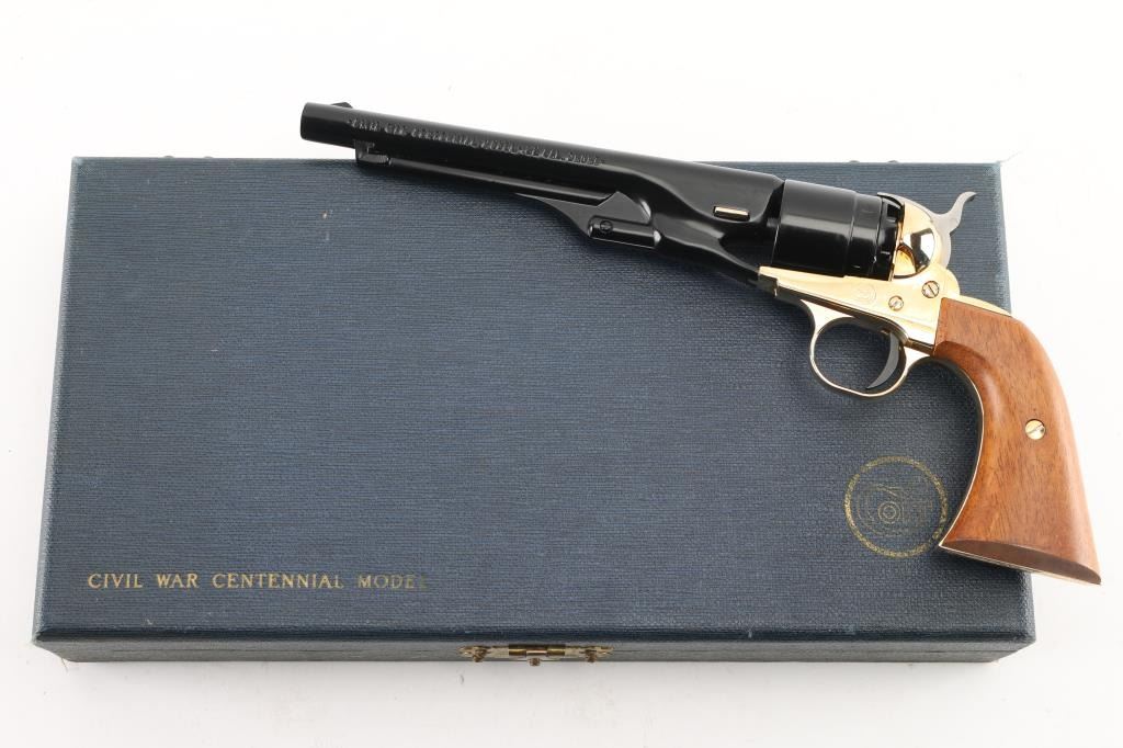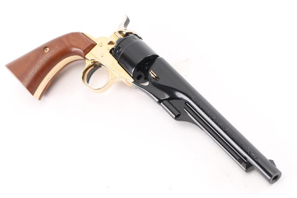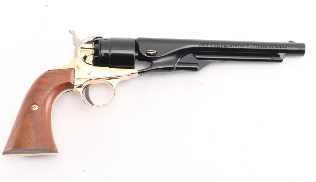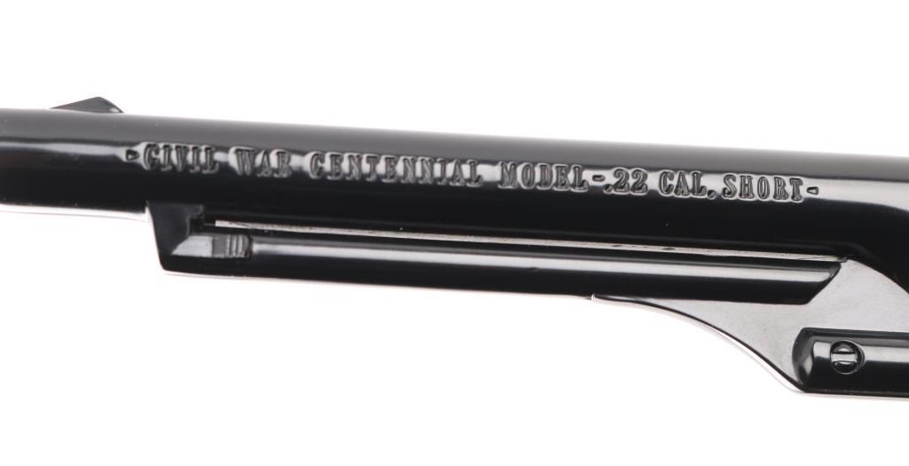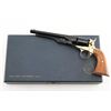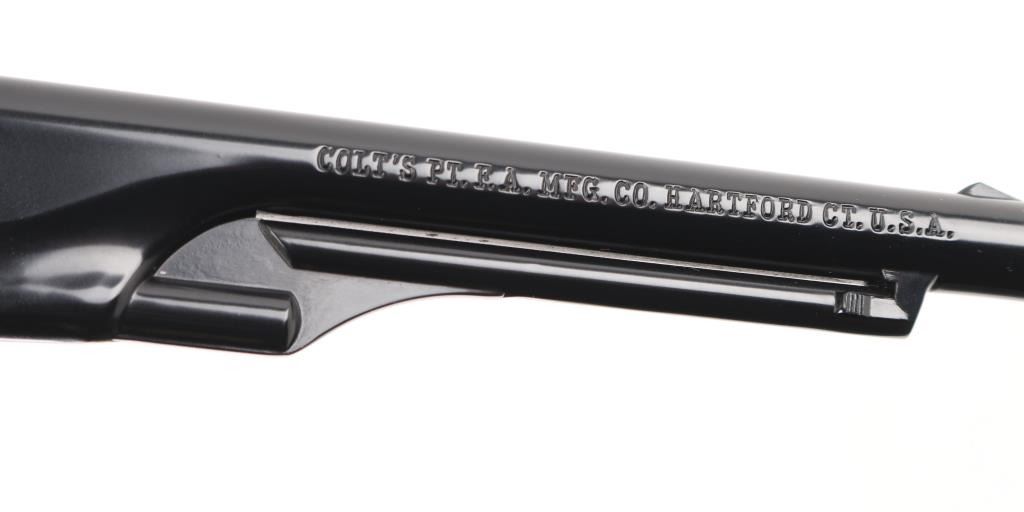 Scaled down 1860 Army look-alike, this pistol is actually a single shot that must be disassembled to load or unload. Around 24,000 made circa 1961. Features blued finish, gold color frame and grip straps, 6" barrel, fixed sights, two piece smooth wood grip. Has been fired, retains 98% condition with few minor blemishes. Includes the original presentation hinged-lid box, with Colt logos, fitted cloth interior. Appears unfired. Condition is NRA Excellent *** C&R Firearm ***