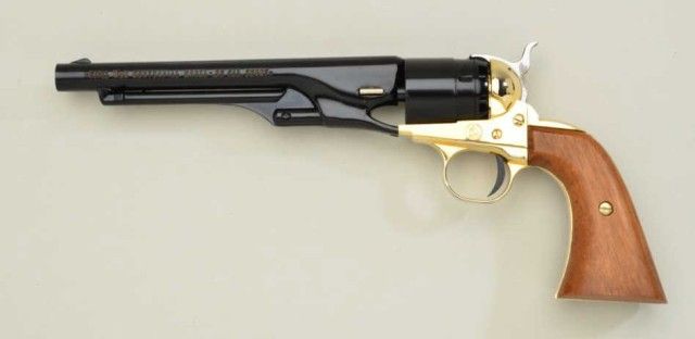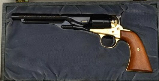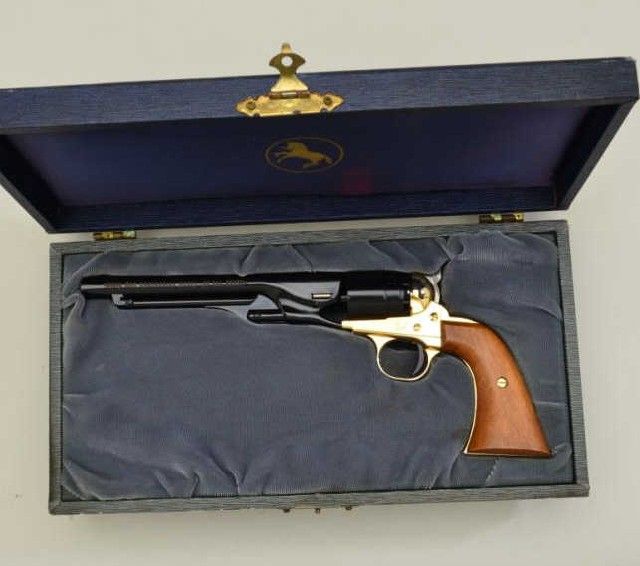 Colt Civil War Centennial Model diminutive copy of an 1860 Army revolver, single shot, .22 short cal., 6” barrel, blue and gold finish, wood grips, #7498W, accompanied by factory leatherette covered wood display boxwith grey lining. This commemorative is in overall fine condition showing little handling; display case is in overall good condition showing some wear to edges. Est.: $100-$200.
