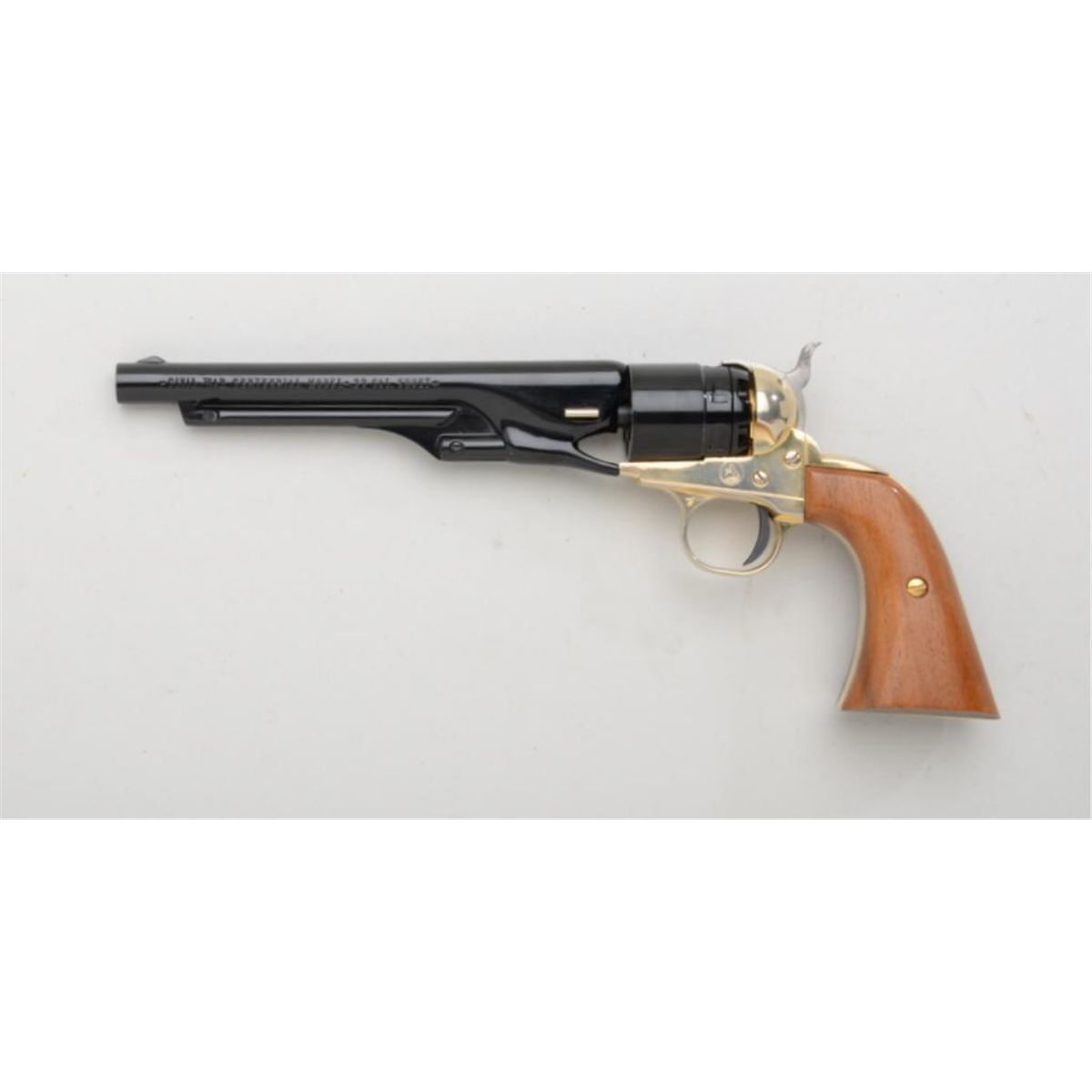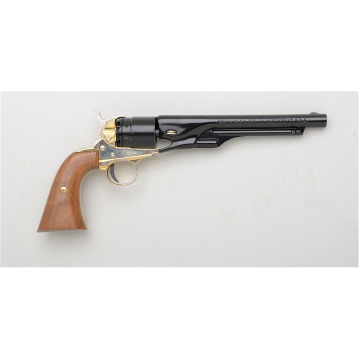 Colt Civil War Centennial single shot pistol in the style of a diminutive Model 1860 Army revolver, .22 short cal., 6” barrel, black and gold colored finish, wood grips, #21757W. This gun is in overall excellent conditionshowing little use or handling; accompanied by a factory presentation leatherette covered wood box with grey corduroy lining in very good condition with some scuffing and wear. Est.: $100-$200.