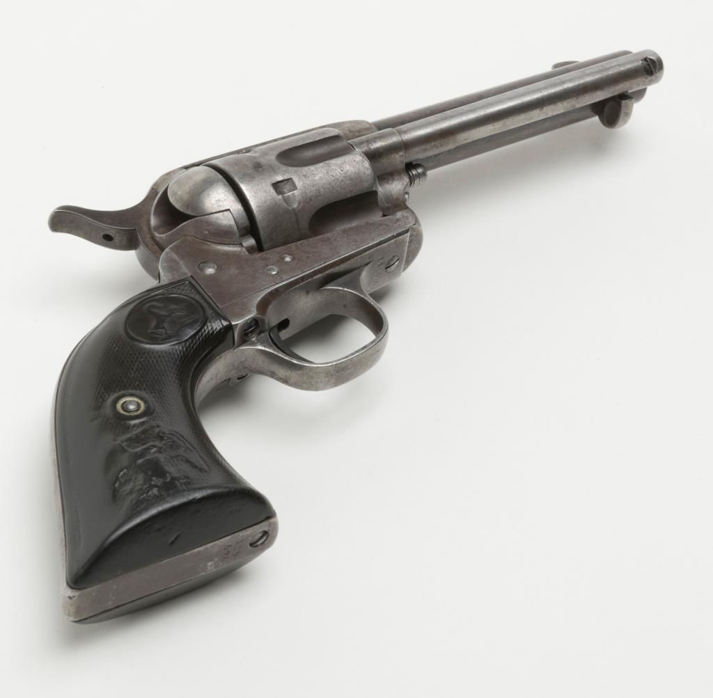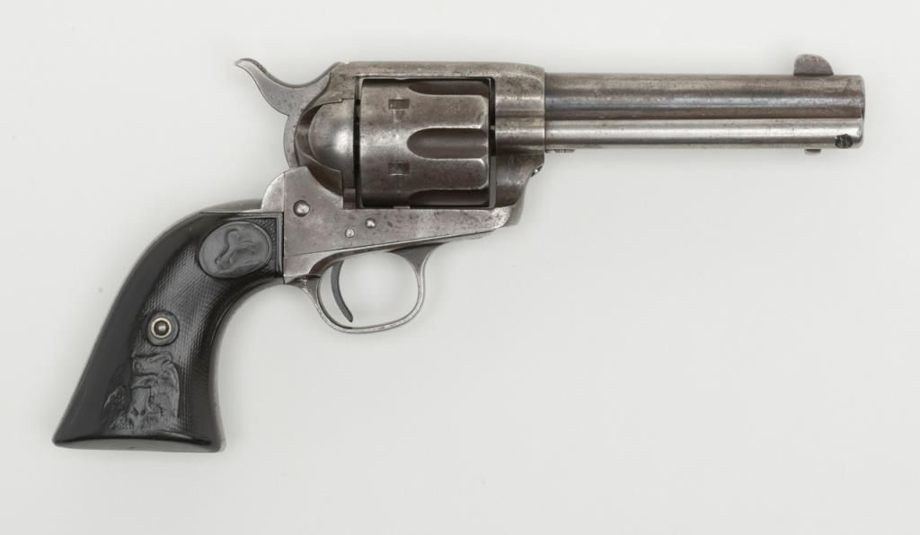 Colt Civilian Model SAA revolver, .45 cal., 4-3/4” barrel, blue and case hardened finish, checkered black hard rubber eagle grips, #125636 with factory letter confirming caliber, barrel length, finish and grips; shipped to Hibbard, Spencer,Bartlett & Co., Chicago, Illinois on July 30, 1888, 10 guns in shipment. This Colt is in overall very good condition showing a grey patina with traces of original blue in protected areas, crisp action, good bore, very good markings,classic worn grips showing years of handling; all matching visible numbers. From the estate of Joe Kiser. (Antique). Est.: $3,000-$6,000.