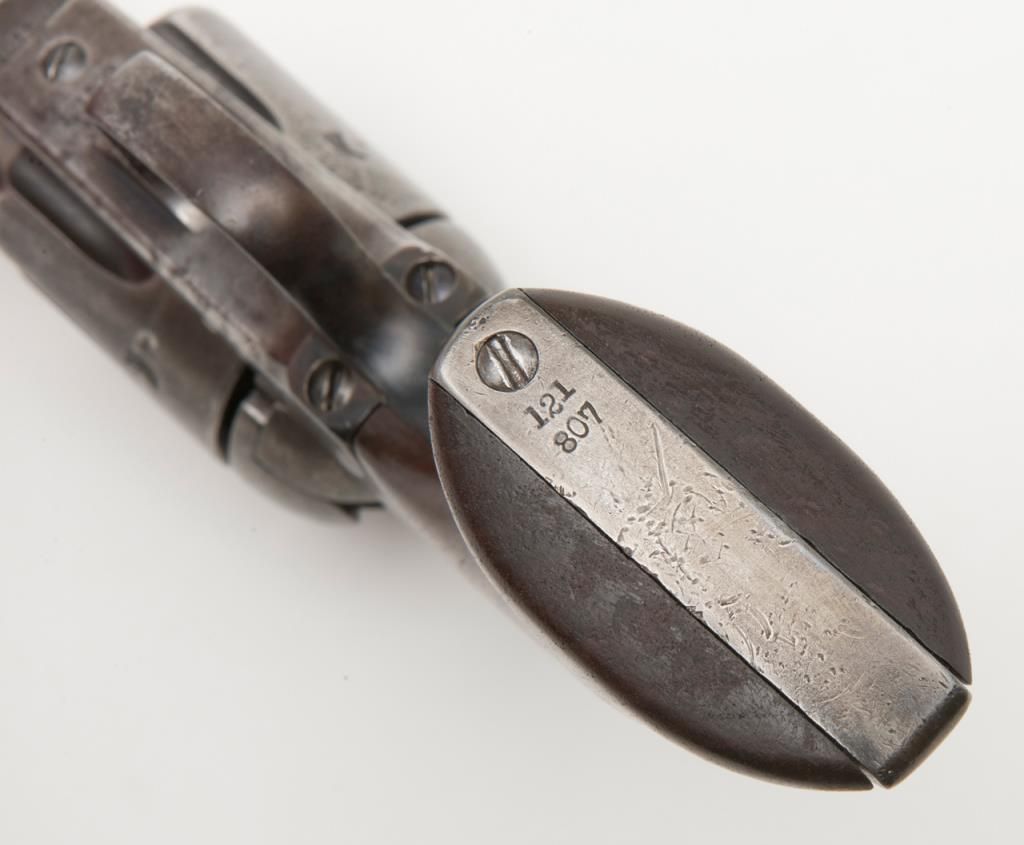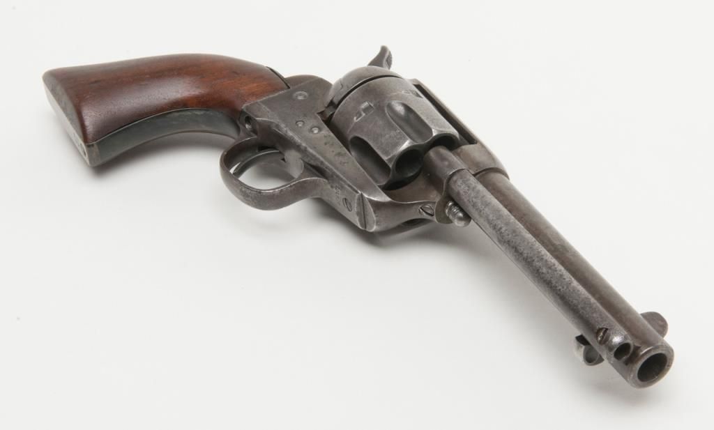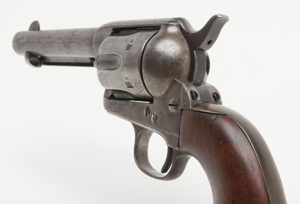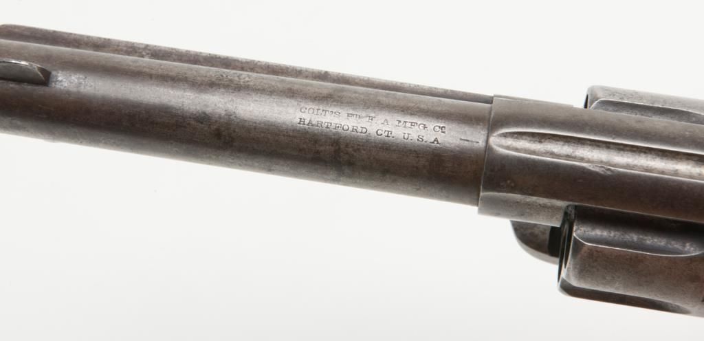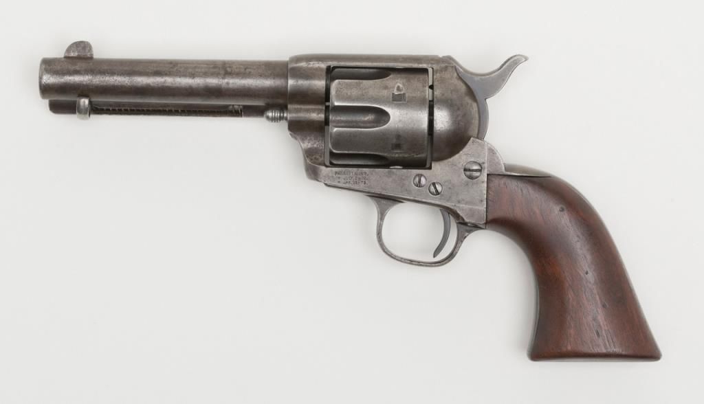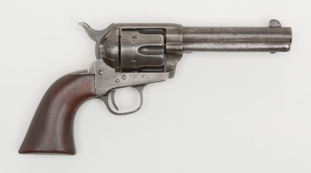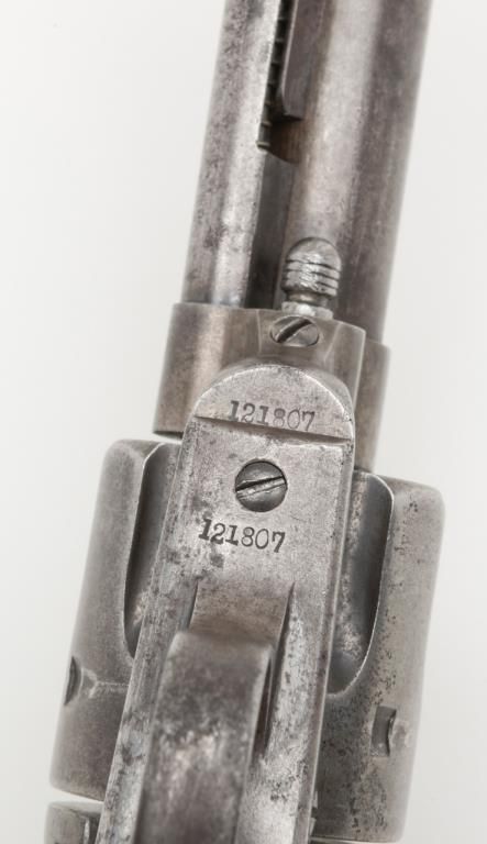 Colt Civilian Model SAA revolver, .45 cal., 4-3/4” barrel, blue and case hardened finish, wood grips, #121807 in overall very good + condition showing an even grey patina with scattered spots of erosion and pinprick pitting, traces oforiginal blue in cylinder flutes, hints of original case colors in protected areas of frame, crisp action, good bore, good markings, very good grips, matching visible numbers. From the estate of Joe Kiser. (Antique). Est.:$2,000-$4,000.