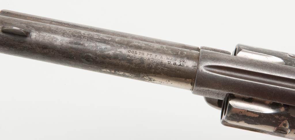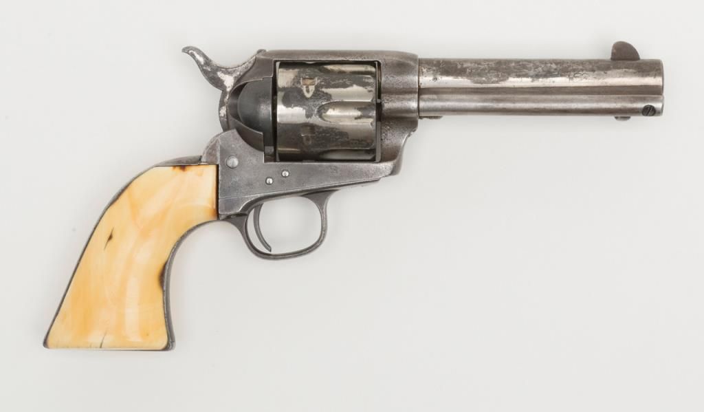 Colt Civilian Model SAA revolver, .45 cal., 4-3/4” barrel, nickel finish, ivory grips, #109259 accompanied by a factory letter confirming caliber, barrel length and finish; original grips were wood; shipped to Schoverling, Daly & Gales,New York, NY on Oct. 1, 1884, 12 guns in shipment. This gun is in overall very good condition showing original nickel on the barrel and cylinder with traces of original nickel on the backstrap; balance of gun has gone to a grey patina withscattered pinprick pitting; good bore, crisp action, good markings and beautiful mellow period ivory grips with age crack on the butt area. From the estate of Joe Kiser. (Antique). Est.: $3,000-$6,000.