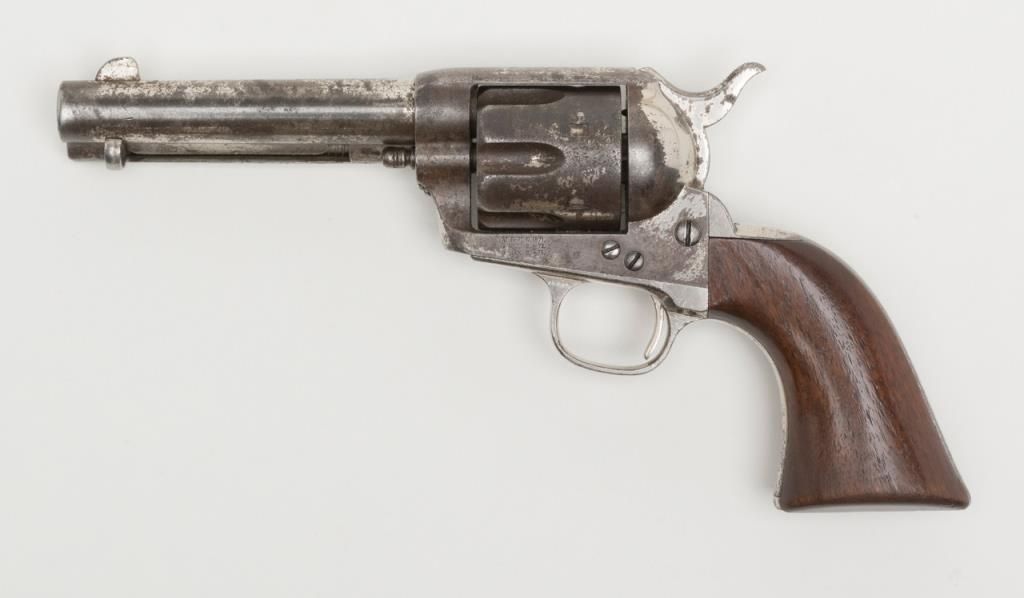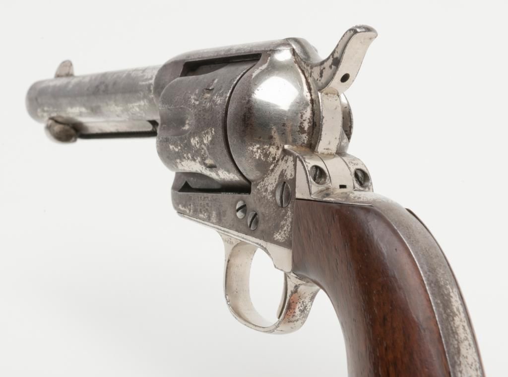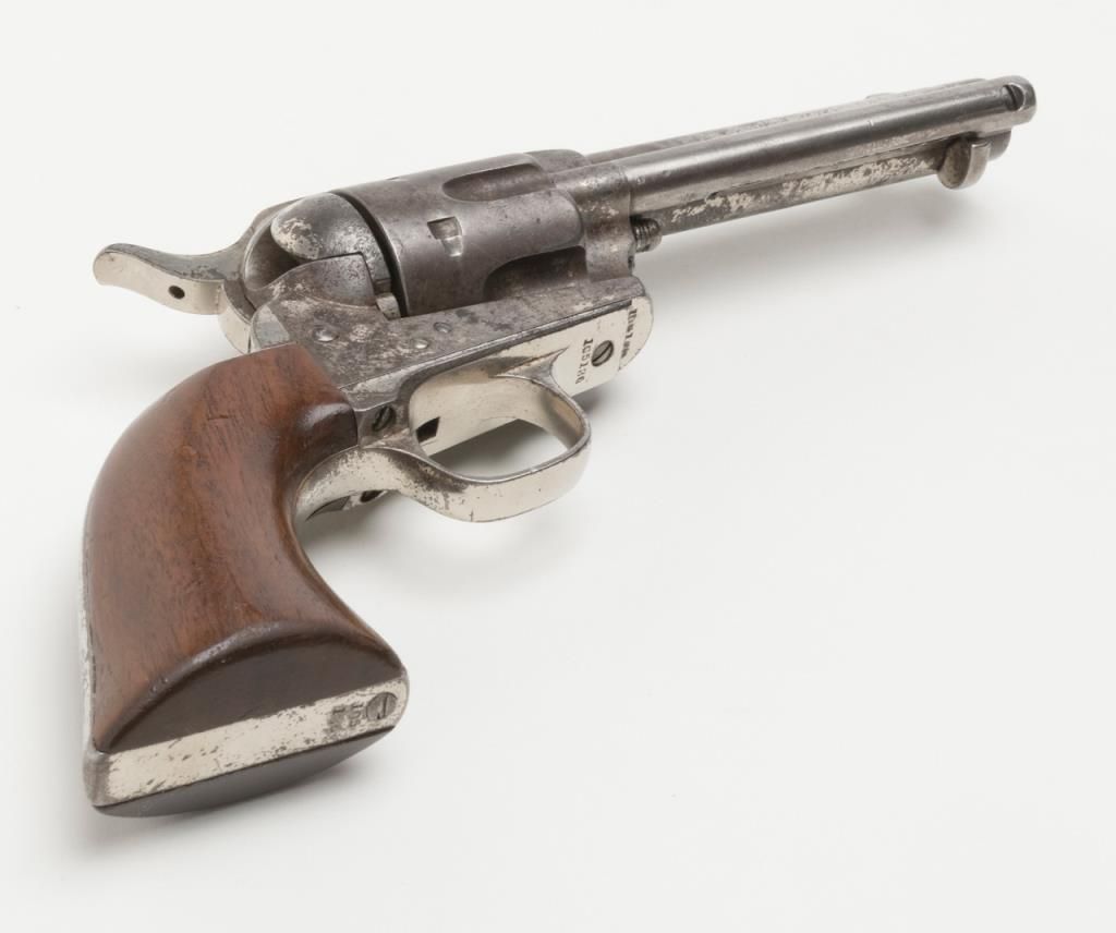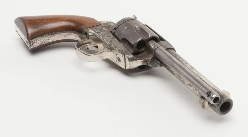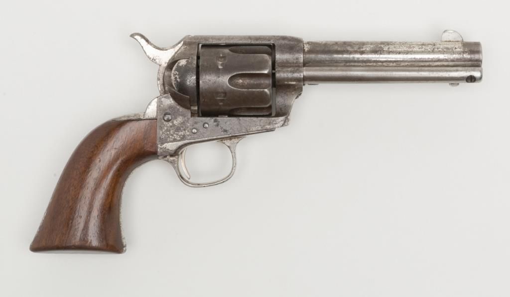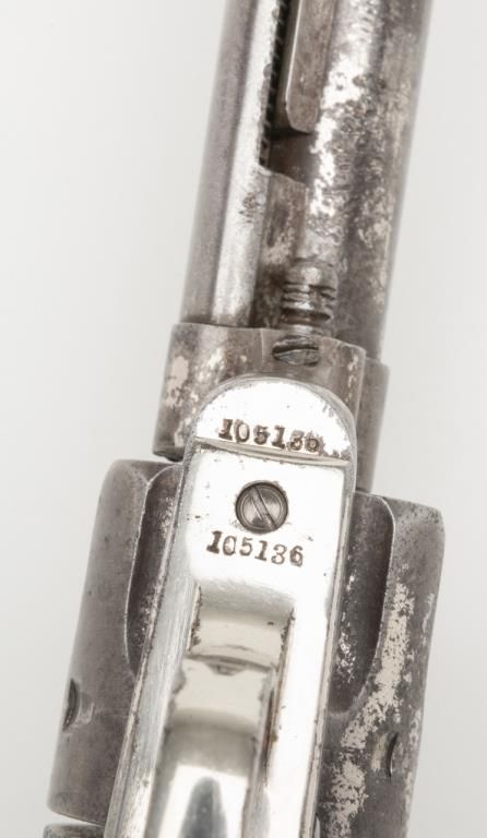 Colt Civilian Model SAA revolver, .45 cal., 4-3/4” barrel, nickel finish, wood grips, #105136 with copy of a factory letter confirming all features and indicating shipment to Schoverling, Daly & Gales, New York, NY on May 12, 1884, two guns inshipment. This Colt is in overall very good condition showing approx. 30% original nickel with balance of metal surfaces gone to a dark patina with scattered light pitting areas on cylinder and frame around firing areas; crisp action, verygood bore and markings, very good grips; completely un-cleaned and the way collectors love to find them. From the estate of Joe Kiser. (Antique). Est.: $3,500-$7,000.