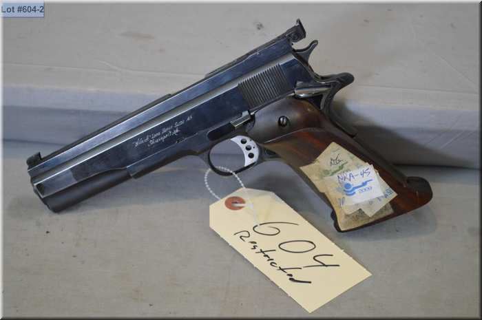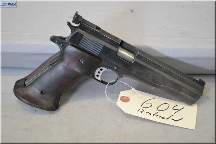 Colt ( Clark Cutomized Long Heavy Slide ) Mod 1911 .45 Auto cal 7 shot semi automatic Pistol w/ 146 mm bbl [ blued finish, w/Bo-mar adjustable sight & rail , Right hand walnut target grips, some slight holster wear, etc. ] Ser # 247760C * Restricted Handgun Cert # 5669940