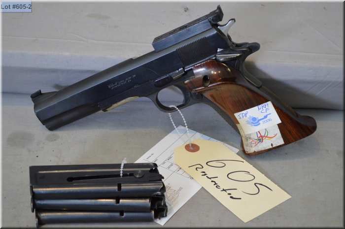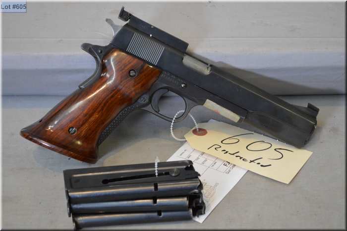 Colt ( Clark Long Slide Custom 38 ) on Mark IV Series 70 Frame .38 Super Auto cal 7 shots semi automatic Pistol w/ 152 mm bbl [ blued finish, Bo-Mar rear sight, short rail , Right hand target grips, appears v-good , various NRA stickers, w/three mags ] Ser # 70S06581 * Restricted Handgun Cert # 8428949