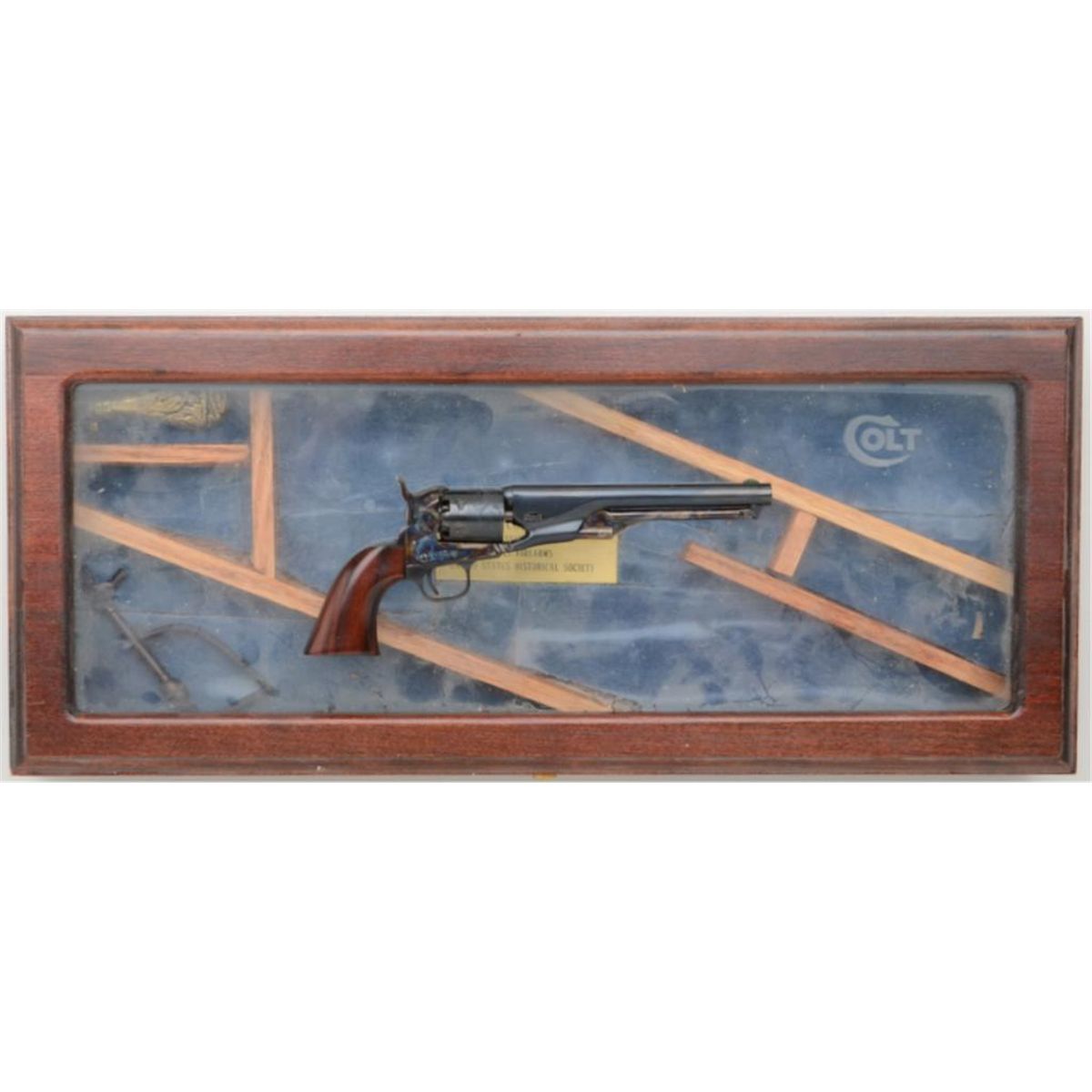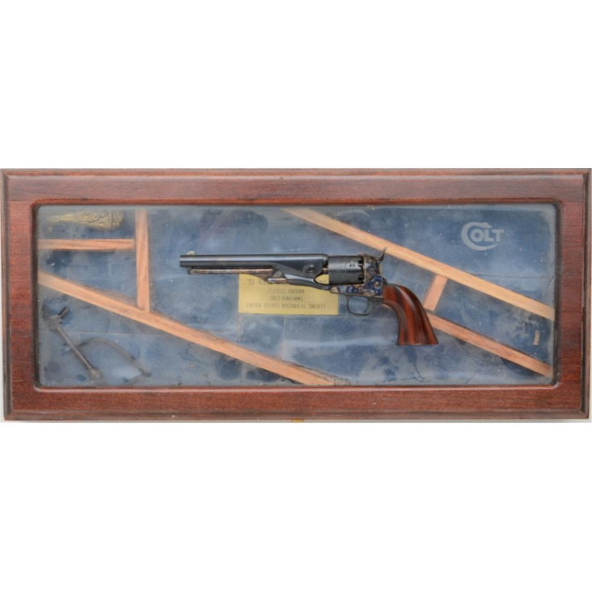 Colt Classic miniature Model 1861 percussion revolver serial #051 in double display case with flask and mold in overall excellent condition; case is overall good with some losses to the interior lining. Est.:$400-$800.