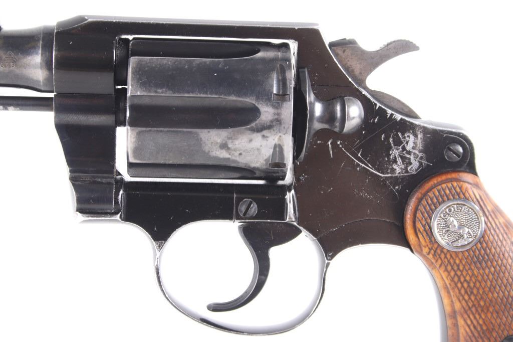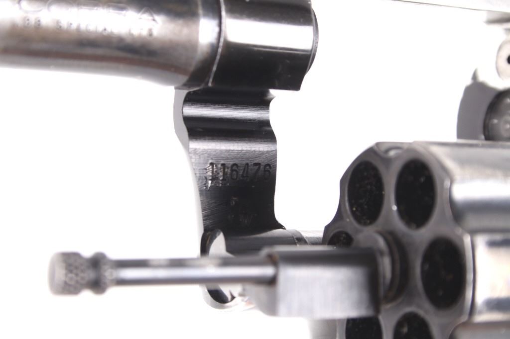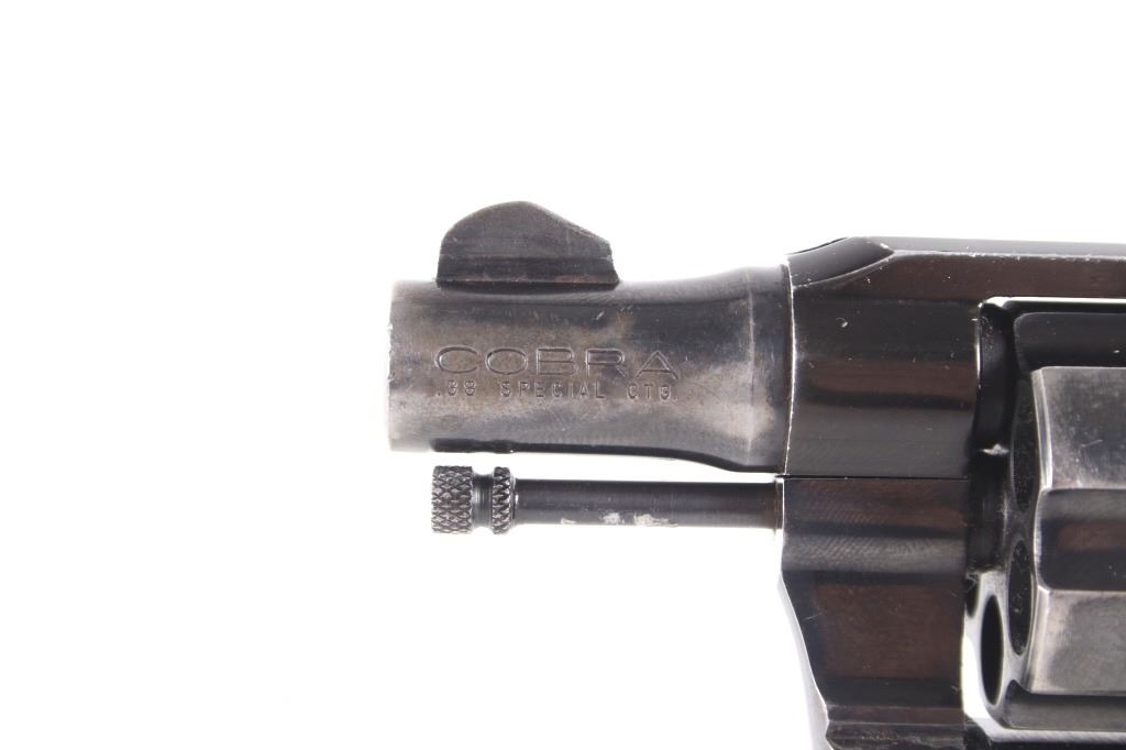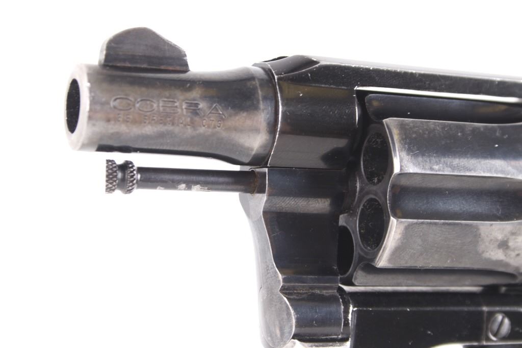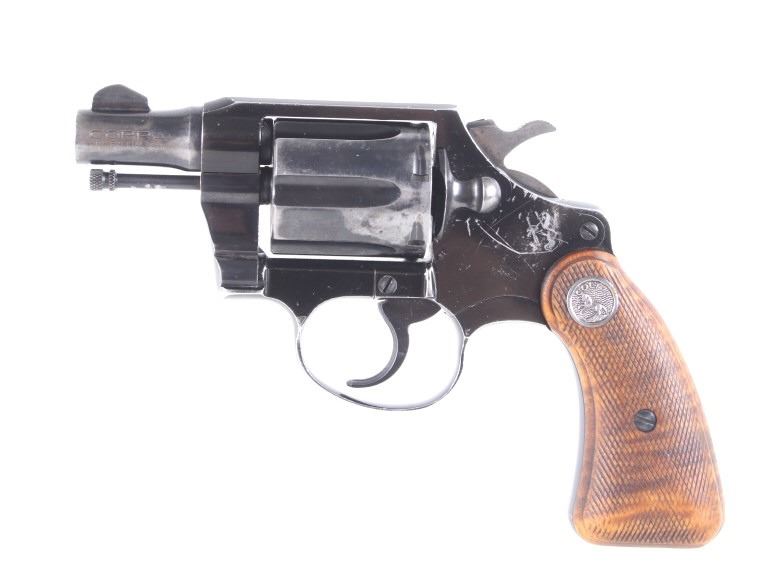 Featured in this lot we have a Colt model Cobra double action snub nosed revolver chambered in .38 special. The revolver was manufactured in 1961 by Colt. The revolver displays a 2" long round barrel, six shot cylinder, checkered wood grips, fixed sights, and double action trigger. The barrel is marked across the left side reading "COBRA .38 SPECIAL CTG." with the right reading "COLTS PT. F.A. MFG. CO. HARTFORD CONN. U.S.A.". Mechanically the revolver shows a smooth cylinder rotation and crisp trigger. The grips display worn checkered design with metal colt medallions at the top of the grips with the rearing Colt logo with "COLT" across the top. The piece shows good condition overall with some wear across the blue'd finish and some handling wear across the grips and frame. The revolver weighs 14oz. Serial Number: 116476. This firearm qualifies as a Curio & Relic firearm, and requires FFL Transfer or NICS Background Check.