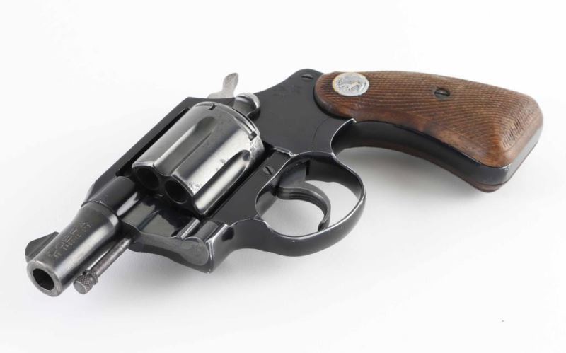 Revolver. D/A, S/A 6-rd capacity. Produced 1950-1981. Lightweight, aluminum-framed . Blued cylinder, and barrel, black painted frame. 2 " Barrel with serrated ramp front, and square notch rear sights. Serrated trigger. Exposed ejector rod. Checkered walnut grips with "Rampant Colt" medallions. Bore and cylinders appear very good, but are a little dirty. Action is crisp/tight. blued metal finish has dulled somewhat with some scratches/dings. frame has some minor chips/scratches. Grips are good with the checking worn. NRA condition-Very Good. Modern Firearm.