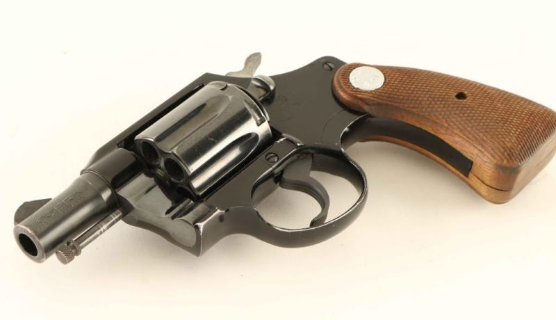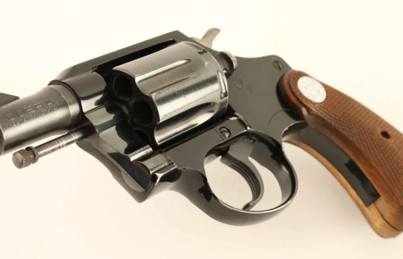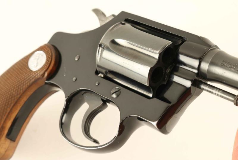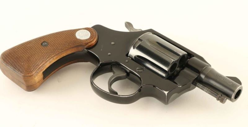 '1st Issue' Lightweight snub-nosed double action revolver chambered in .38 Special, manufactured circa 1966. Features a blued/black finish, 2" barrel, serrated ramp front sight, square notched rear sight, long fluted six-shot cylinder, non-shrouded ejector rod, serrated trigger, serrated hammer spur, square butt alloy frame and extended two-piece checkered walnut grips with silver Colt medallions. Revolver exhibits approximately 87% of it's original finish with holster wear, scattered handling marks/scratches and some minor surface rust on the barrel & cylinder. Action is smooth with solid lock-up, the bore is mirror bright with minor rust, and grips are good with wear. Condition is NRA Good to Very Good. ***C&R Firearm***