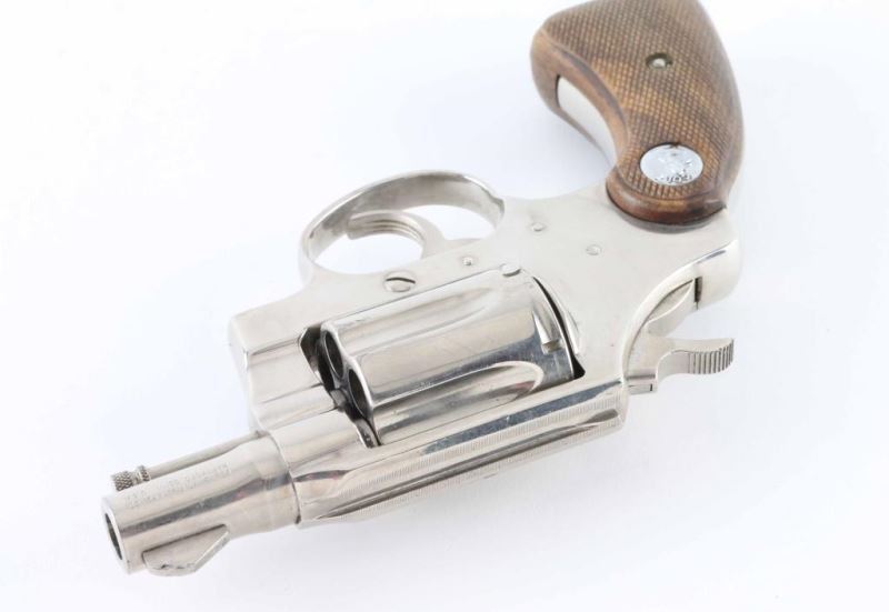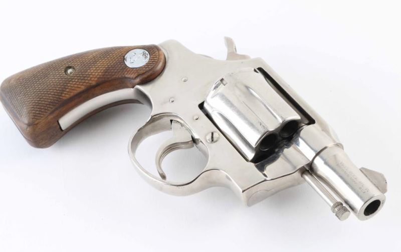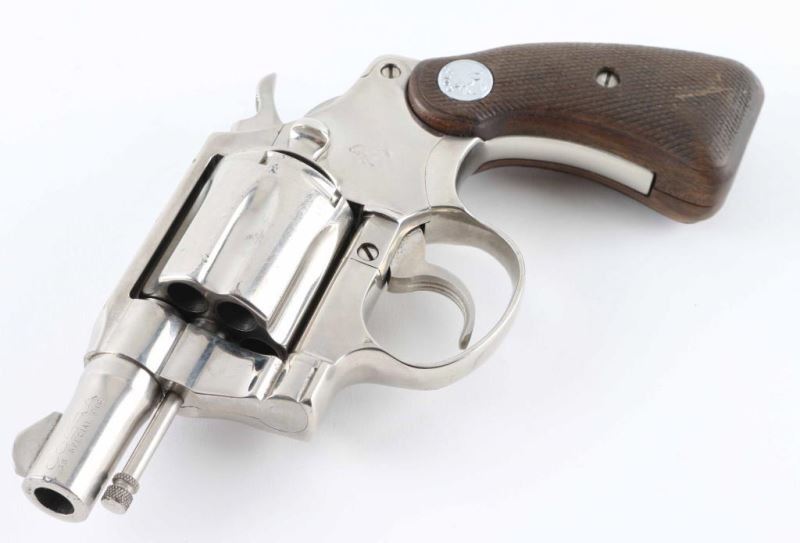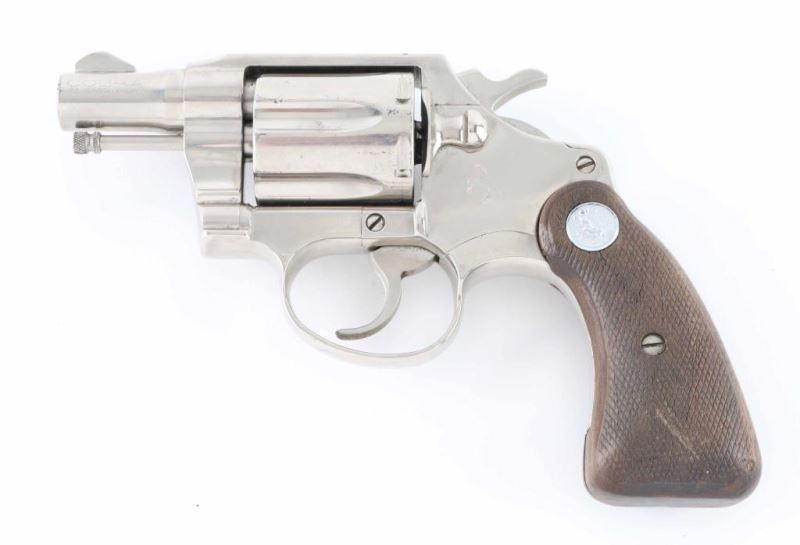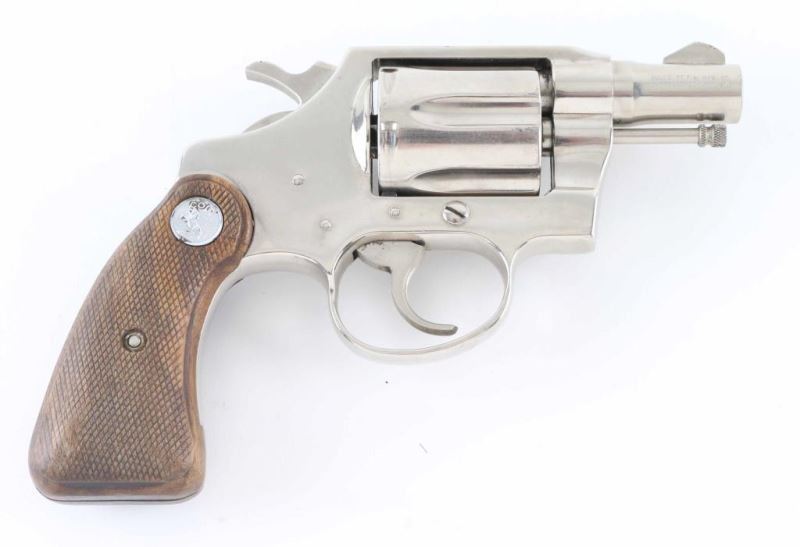 Revolver. D/A, S/A 6-rd capacity. Produced 1950-1981. Lightweight, aluminum-framed. 2" Barrel with serrated ramp front, and square notch rear sights. Serrated trigger. Exposed ejector rod. Checkered walnut grips with "Rampant Colt" medallions. Bore and cylinders appear excellent/bright. Cylinders are a little dirty. Action is crisp/tight. Nickel metal finish is very good with a some scratches/dings. Grips are good with the checking worn smooth. NRA condition-Very Good. Modern Firearm.