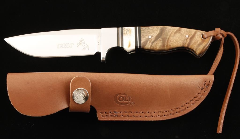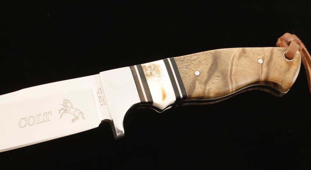 Burled wood handle accented with faux antler. Stainless steel blade with etched Rampant Colt symbol. 4" blade includes leather scabbard in original box.