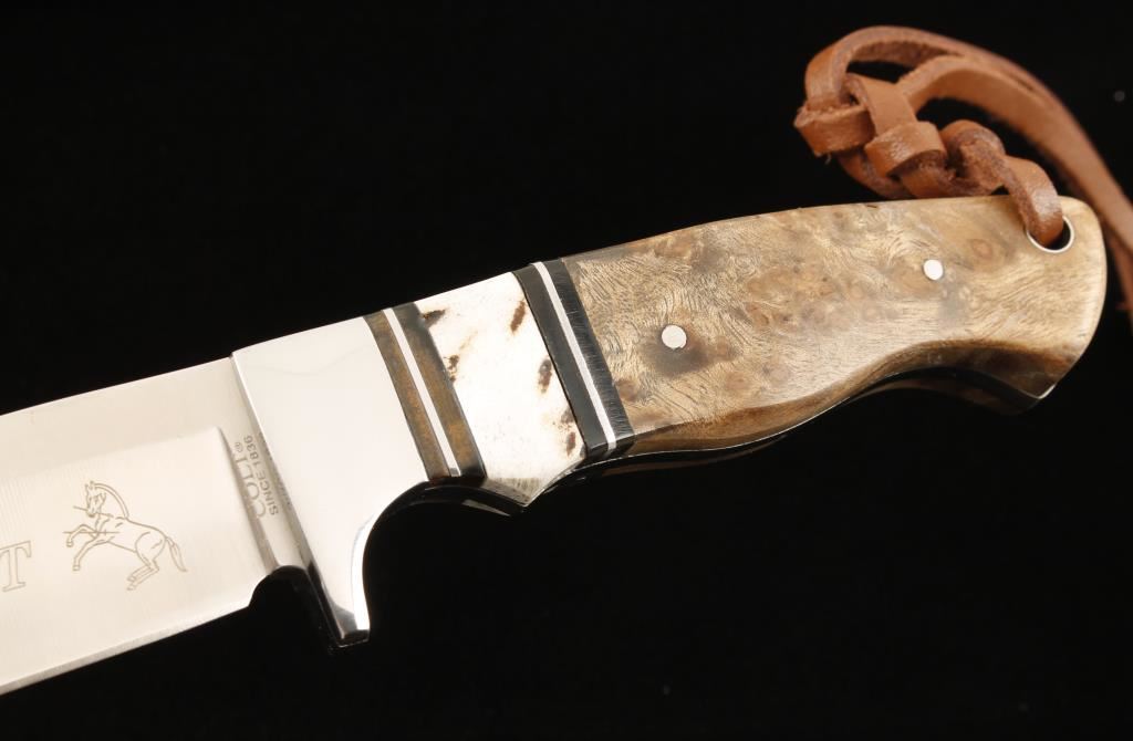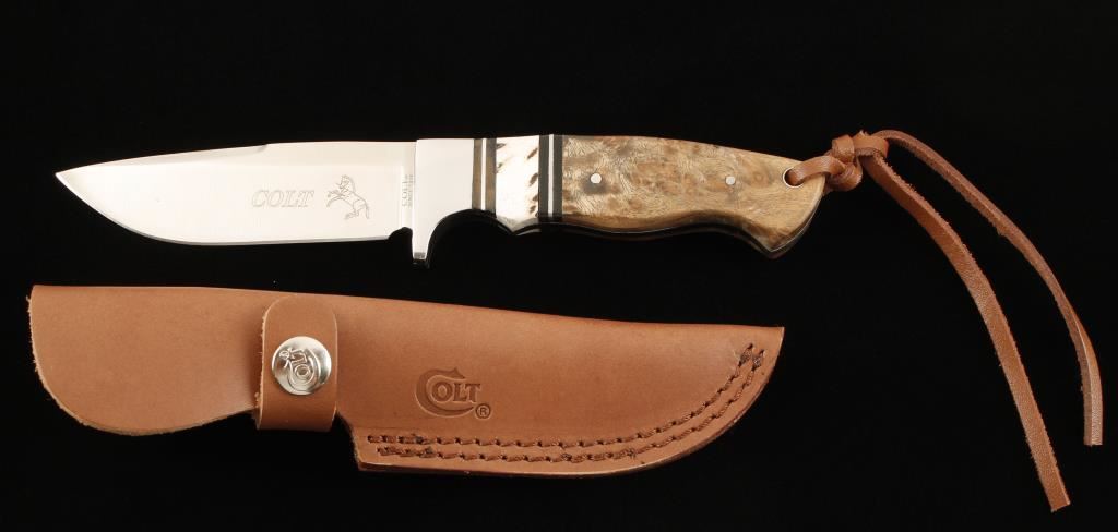 Burled wood handle accented with faux antler. Stainless steel blade with etched Rampant Colt symbol. 4" blade includes leather scabbard in original box.
