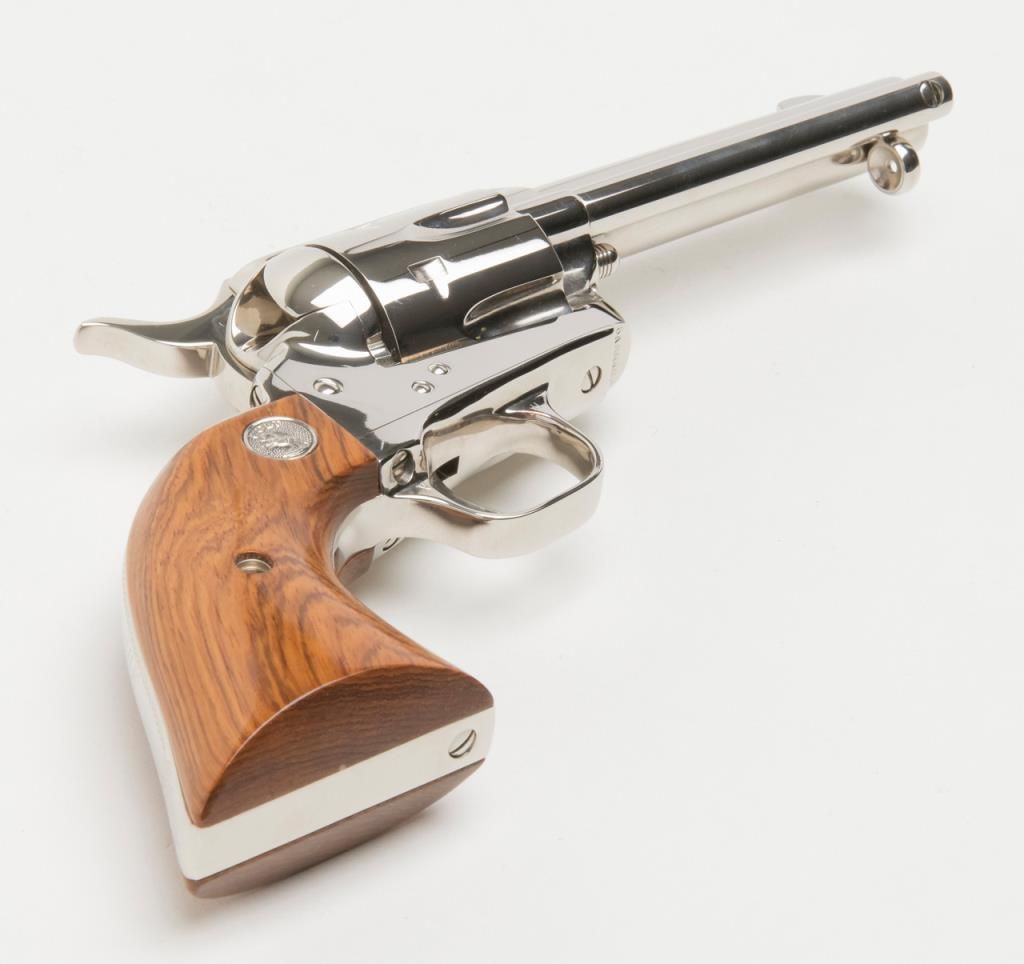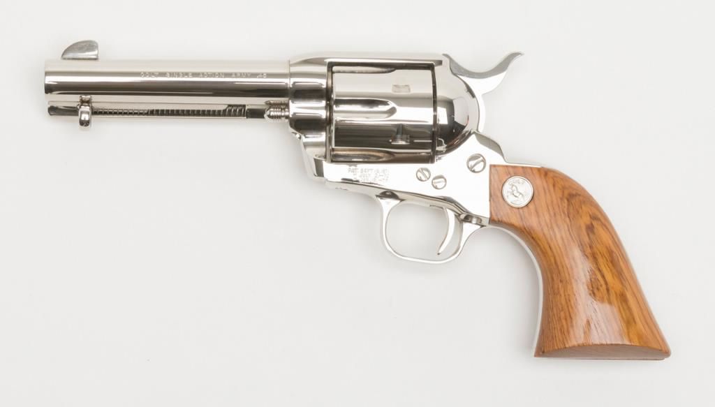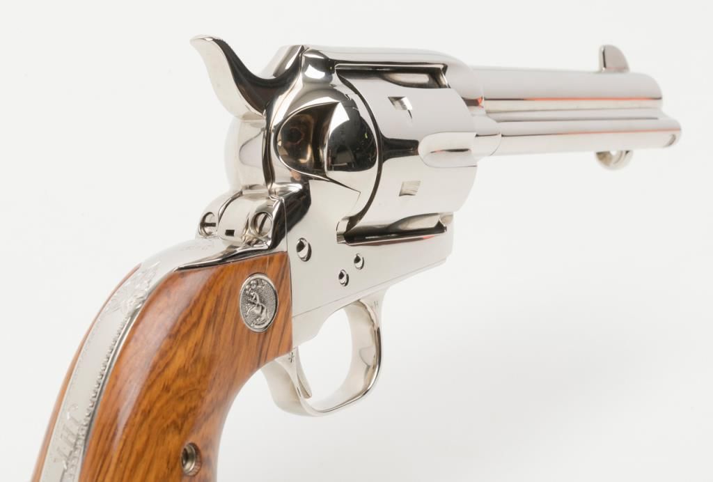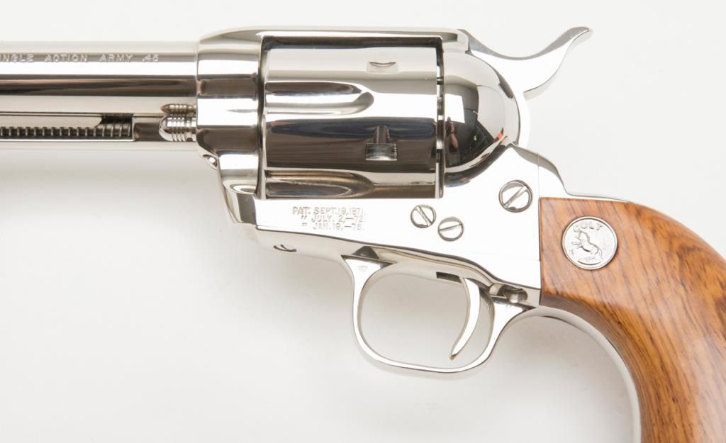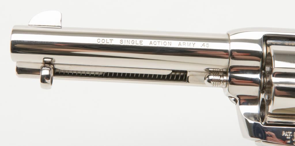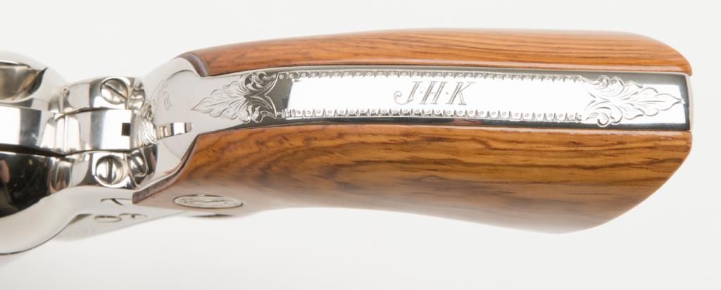 Colt Collector’s Special Edition Custom Gun Shop SAA revolver, .45 cal., 4-3/4” barrel, nickel finish, smooth wood medallion grips, backstrap engraved with line cut initials “J.H.K”, #SA68463 in factory wood grained cardboard box withinserts, instructions, and Colt Custom Gun Shop end label numbered to this gun and describing features including the inscription. This Single Action, personalized to Mr. Kiser, is in like new condition showing little handling and stillretains its orange hang tag. From the estate of Joe Kiser. (C&R). Est.: $1,500-$3,000.