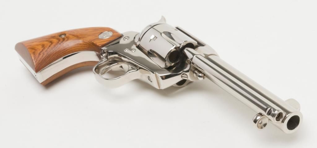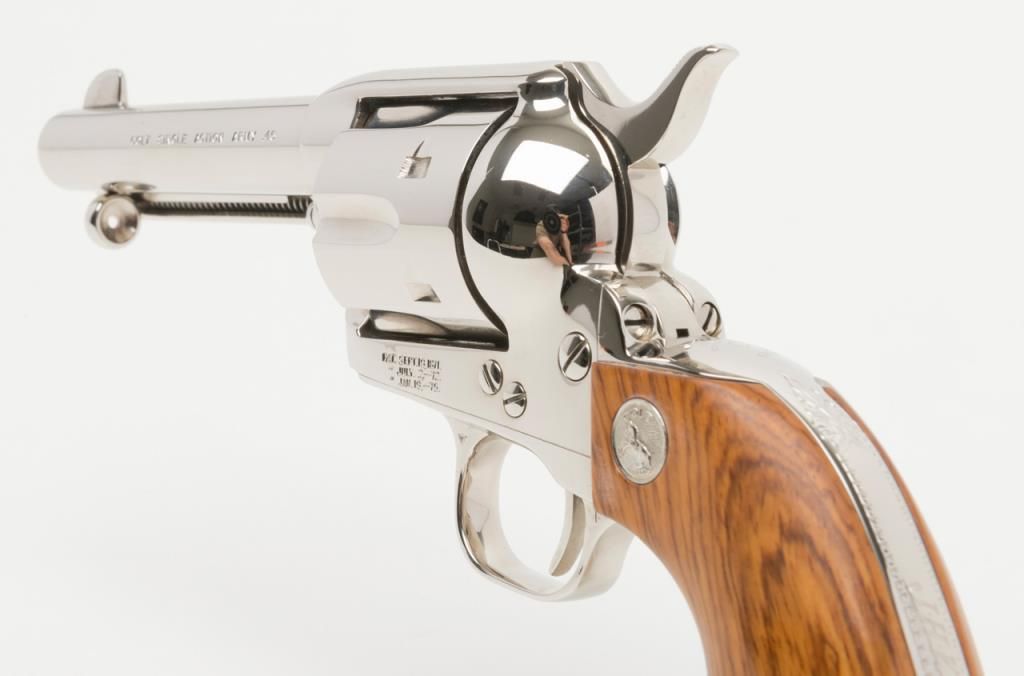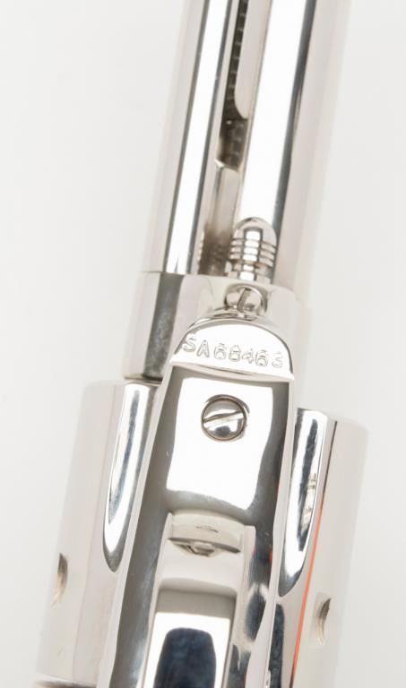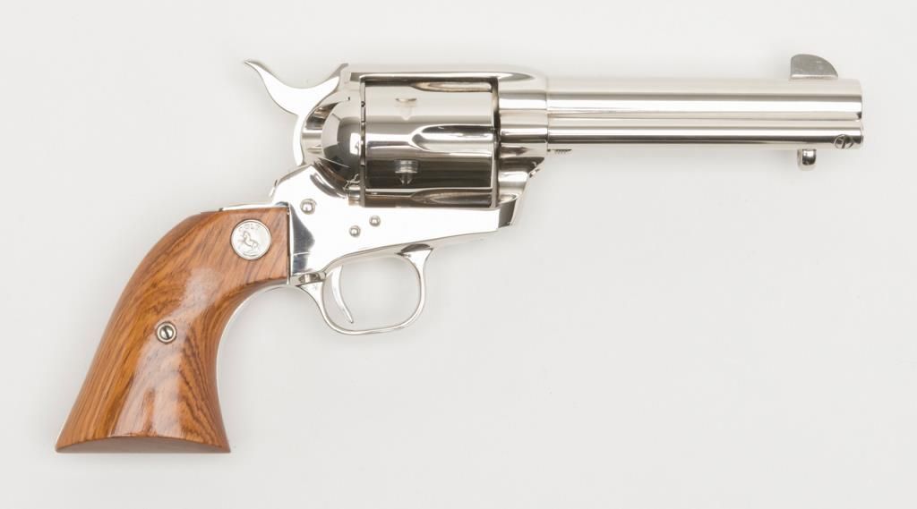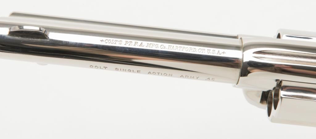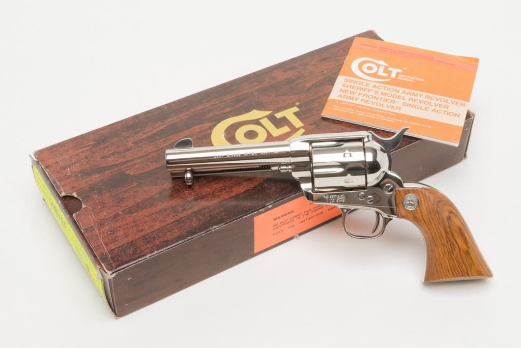 Colt Collector’s Special Edition Custom Gun Shop SAA revolver, .45 cal., 4-3/4” barrel, nickel finish, smooth wood medallion grips, backstrap engraved with line cut initials “J.H.K”, #SA68463 in factory wood grained cardboard box withinserts, instructions, and Colt Custom Gun Shop end label numbered to this gun and describing features including the inscription. This Single Action, personalized to Mr. Kiser, is in like new condition showing little handling and stillretains its orange hang tag. From the estate of Joe Kiser. (C&R). Est.: $1,500-$3,000.