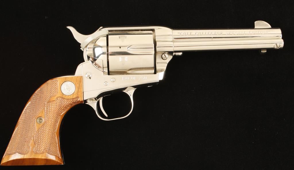 SN: SA65943 Colt Frontier Six Shooter marked "Colt Collector Special Edition" #190 of 250. Nickeled with 4 3/4" barrel with checkered wood medallion grips. Comes in velvet lined wood presentation box with key. Condition is like new. ***Modern Firearm***