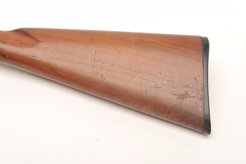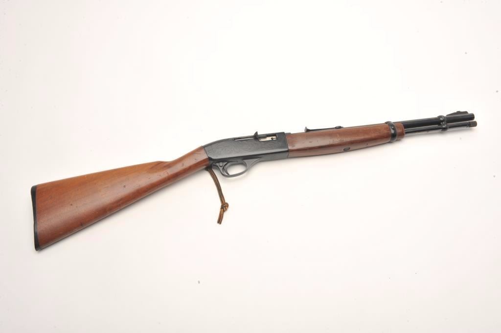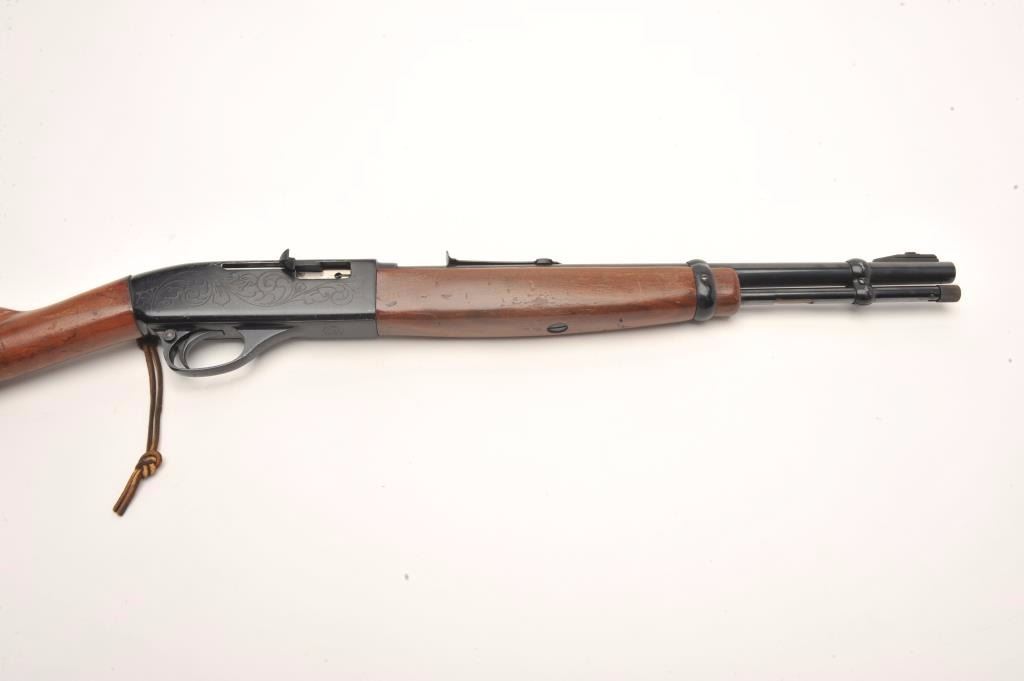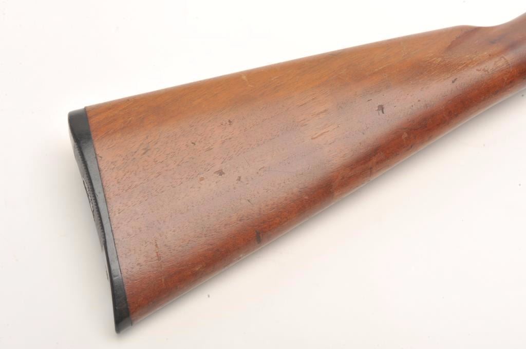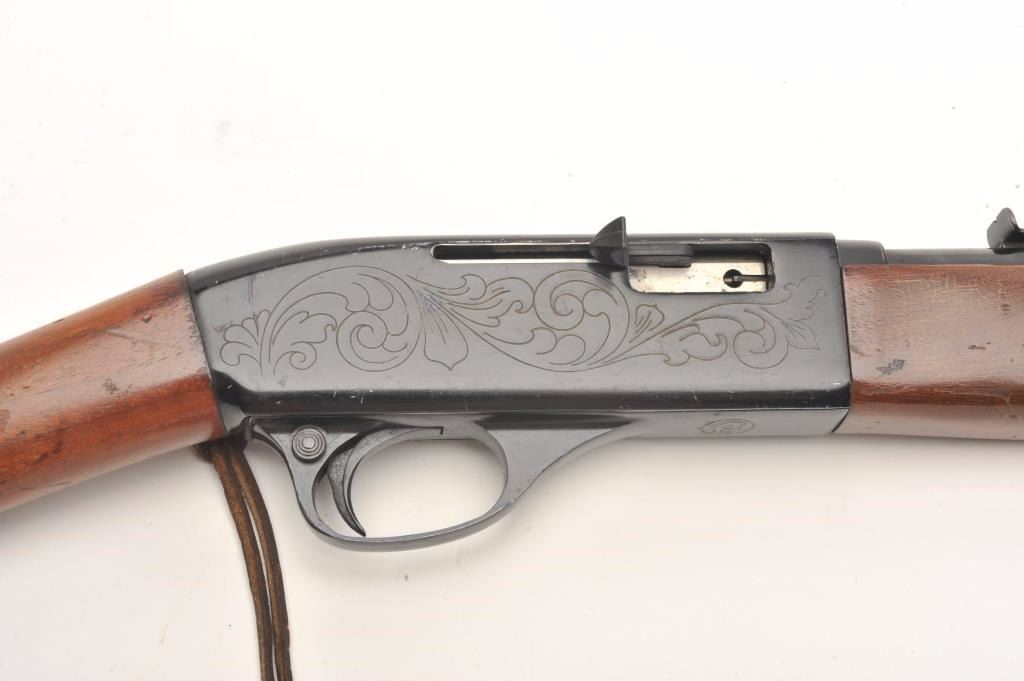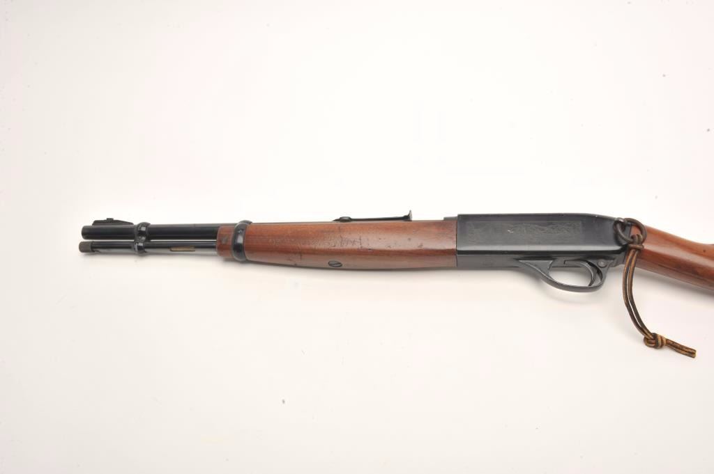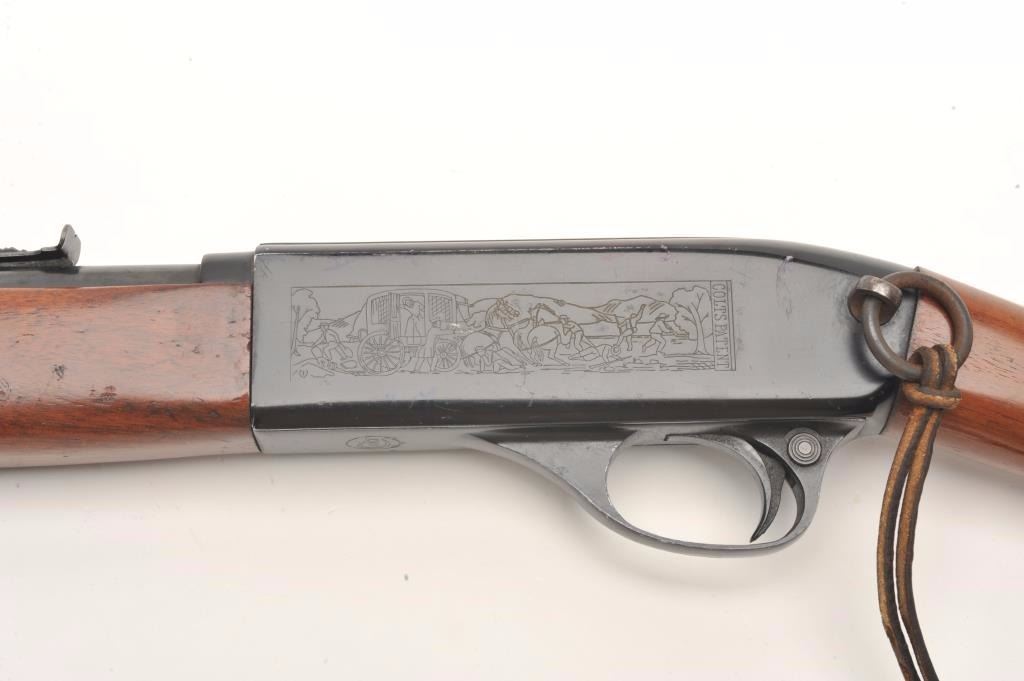 Colt “Colteer” .22 caliber semi-auto carbine with a 16” barrel, saddle ring, and rolled engraving on the frame showing a stage coach hold up scene on the left and scrolls on the right. Original rampant Colt butt plate.80%-90% overall with some use and mars to the butt but generally very good overall. Hard to find and collectible. NSNV. (Modern) Est.: $300-$600