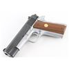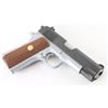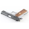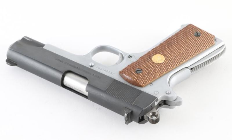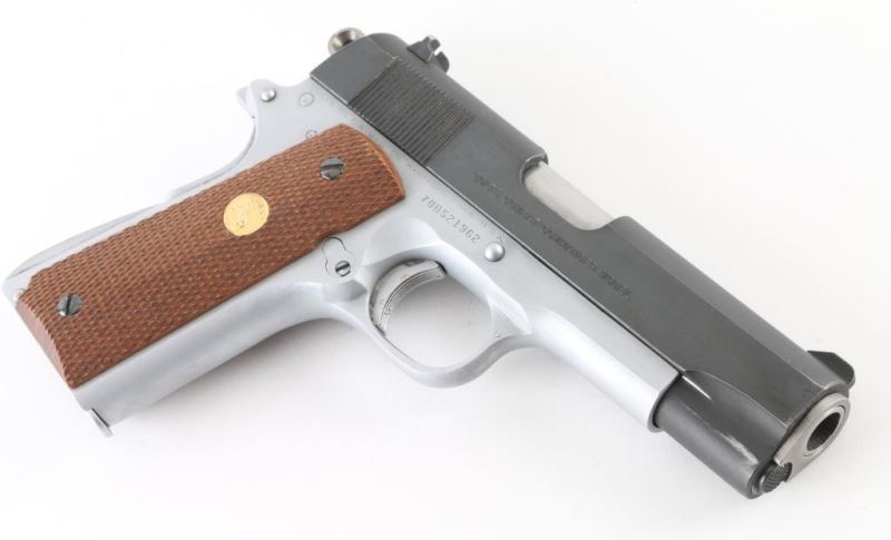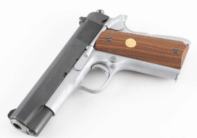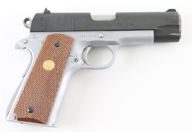 'Series 70' Semiautomatic single action pistol manufactured circa 1974. Features two tone finish, blued slide over satin nickel frame, 4.25" barrel, low-profile serrated blade front sight, dovetailed rear sight with square notch, serrated trigger, serrated round hammer, thumb safety on the left side of the frame, grip safety, push button magazine release, steel frame, serrated arched mainspring housing and checkered walnut grips with gold color Colt medallions. Bore is very good condition. Retains 98% finish with handling marks, minor edge losses. Grips are very good condition. Includes (1) magazine. Condition is NRA Excellent *** Modern Firearm ***