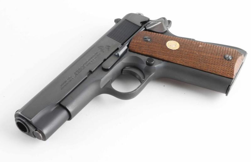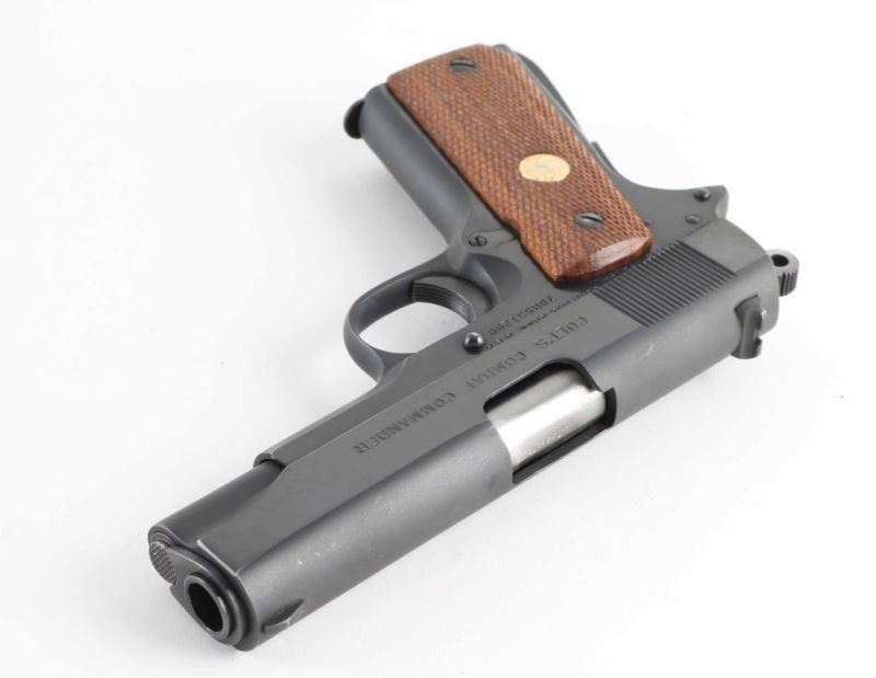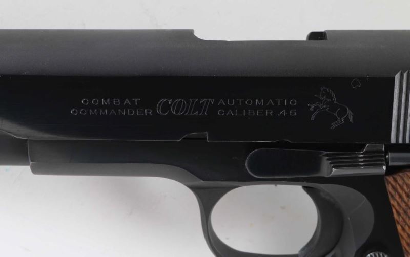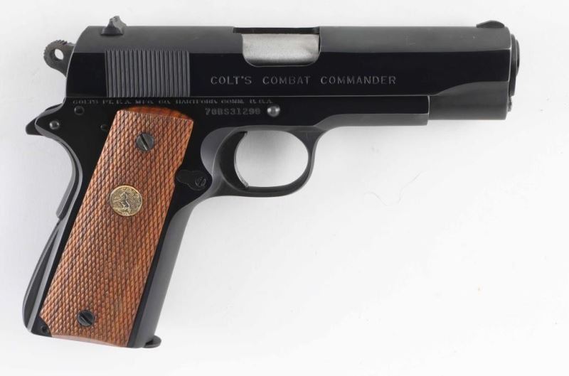 Pistol. Semi-Automatic. 8+1 Capacity. Series 70. Manufactured 1975. 4 1/4" barrel. Blade/notch sights. Commander style ring hammer. Serrated trigger, and mainspring housing. Standard Colt markings with "Colt's Combat Commander" stamped on the right side of the frame. Blued metal finish. Checkered walnut grips with gold toned "Rampant Colt" medallions. Bore appears excellent/bright. Slide action is smooth/tight. Blued finish is about 97% with some very minor scratches, and edge wear. Grips are excellent. Comes with the original magazine marked "Colt 45 Auto/Rampant Colt" NRA Condition-Excellent. Modern Firearm.