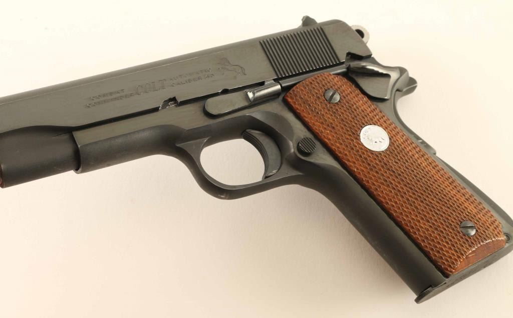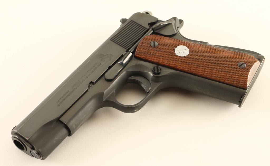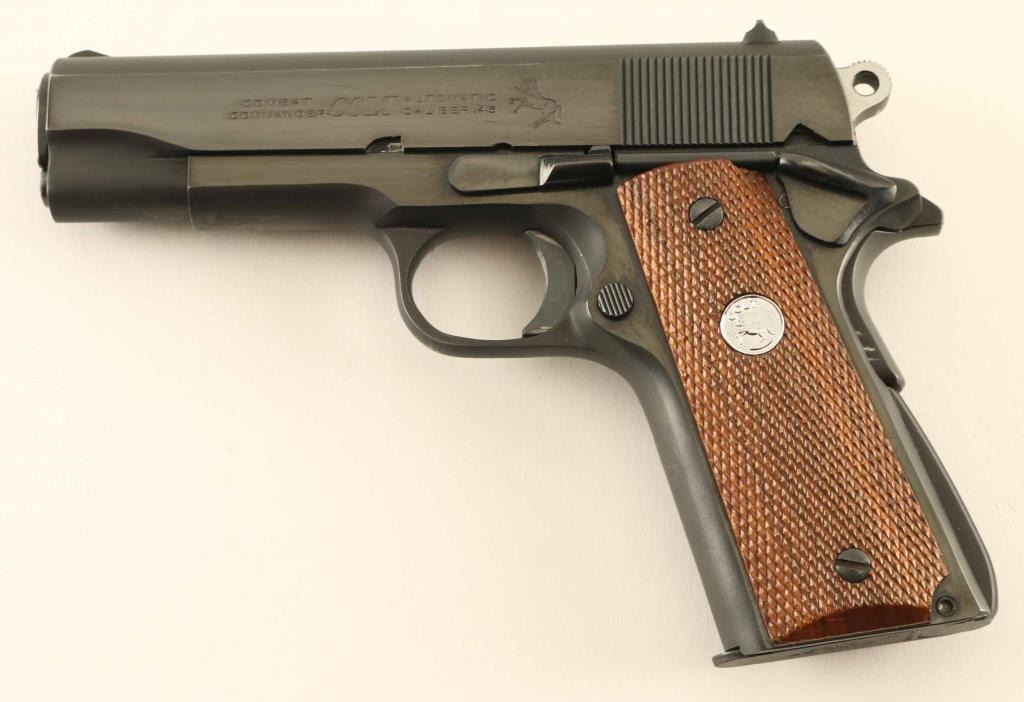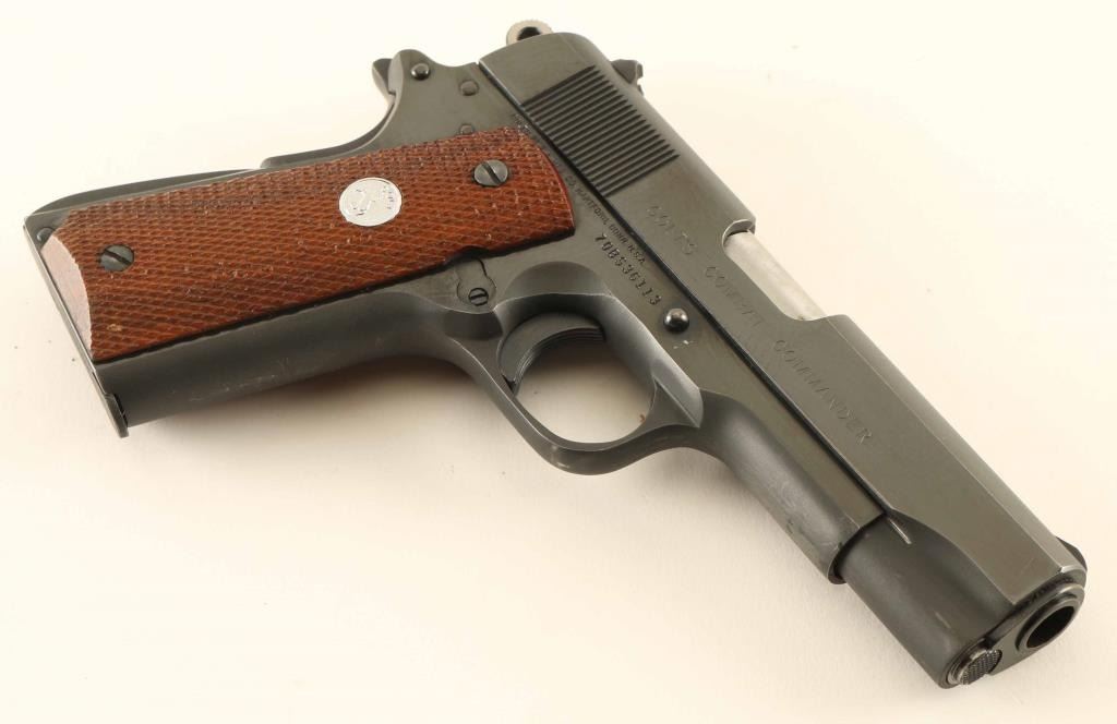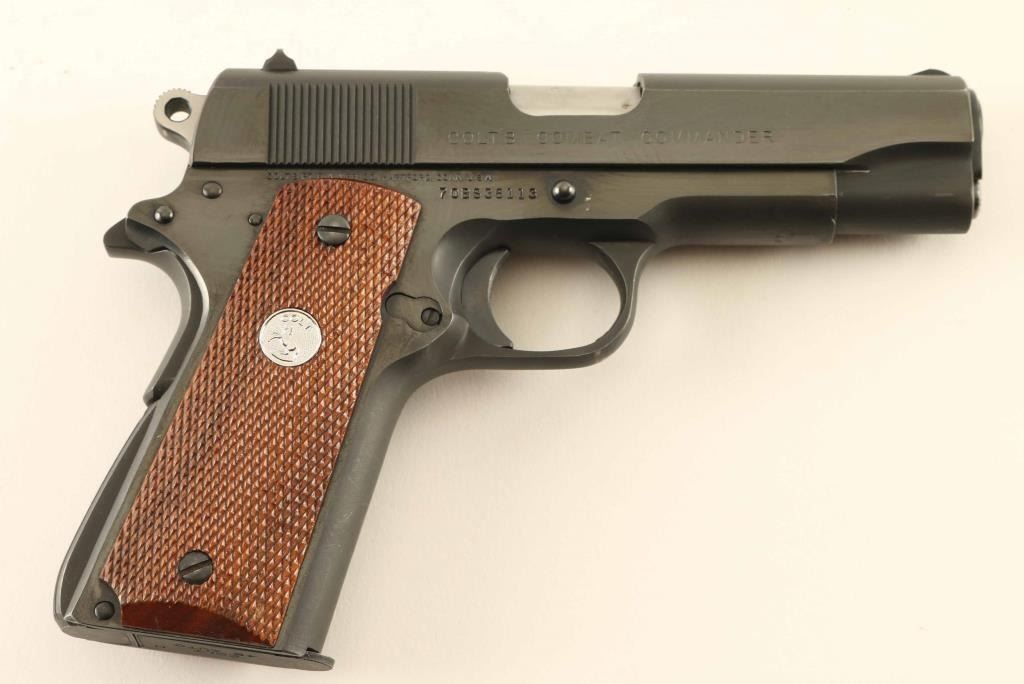 'Series 70' Desirable single action semi-automatic 1911A1 platform pistol chambered in .45 Auto, manufactured circa 1976. The original "Commander" was a variation of the 1911A1 designed to meet the requirements of the post-WWII U.S. military contract which outlined a lightweight 9mm pistol to be issued to officers. Features a matte/polished blued finish, 4.25" barrel, low-profile serrated blade front sight, dovetailed rear sight with square notch, serrated trigger, serrated round hammer spur, thumb safety on the left side of the frame, bobbed grip safety, push button magazine release, factory 7 round magazine, steel frame, serrated arched mainspring housing and checkered two-piece walnut grips with silver Colt medallions. Pistol exhibits approximately 95% of it's original finish showing light edge wear, some scattered handling marks/losses and bright scuffs on the front strap & underside of the frame/slide. Action is smooth, the bore appears pristine but is slightly dirty and the wood grips are near fine with slightly worn points. Condition is near NRA Excellent. ***Modern Firearm***