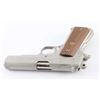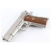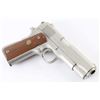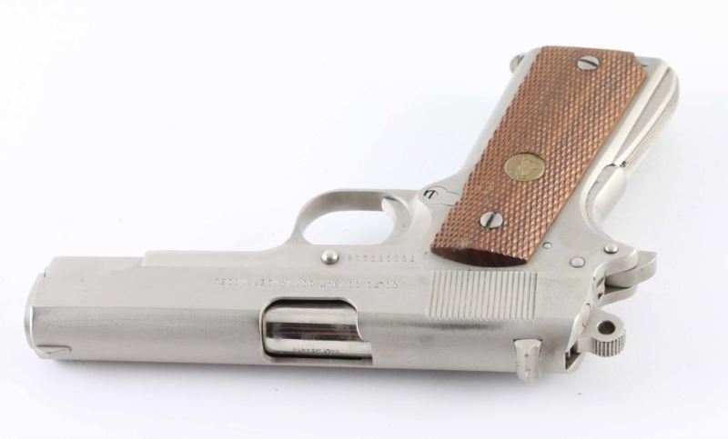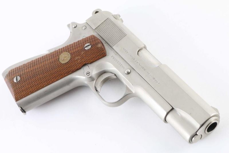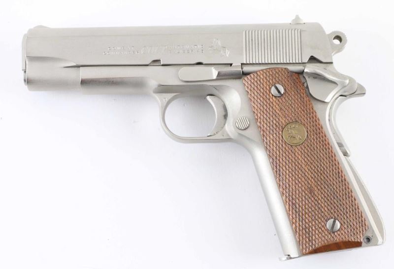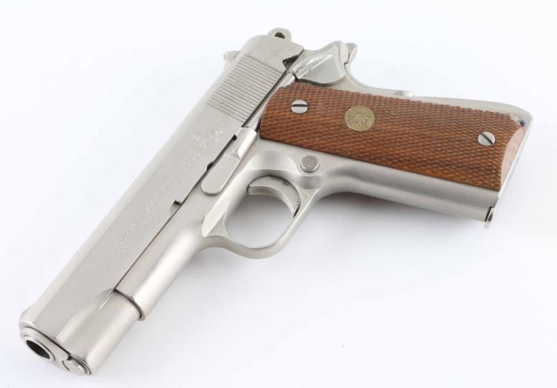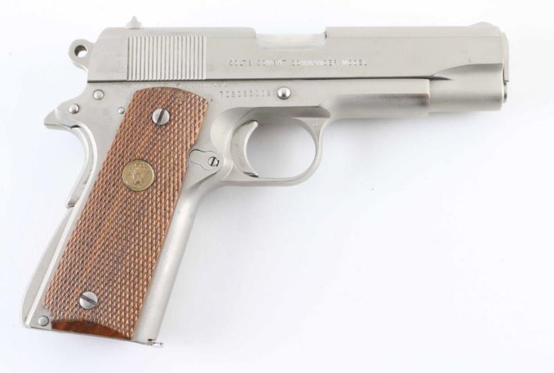 'Series 70' Semiautomatic single action pistol manufactured circa 1978. Features satin nickel finish, 4.25" barrel, fixed sights, serrated trigger, serrated round hammer, thumb safety on the left side of the frame, grip safety, push button magazine release, steel frame, serrated arched mainspring housing and checkered wood grips with gold color Colt medallions. Bore is very good condition. Retains 95% finish showing handling marks. Grips are very good condition. Includes (1) magazine. Condition is NRA Very Good++ *** Modern Firearm ***