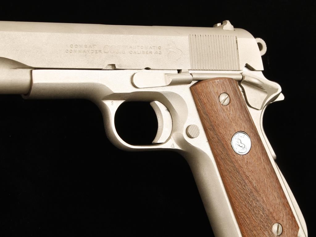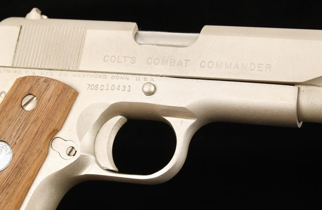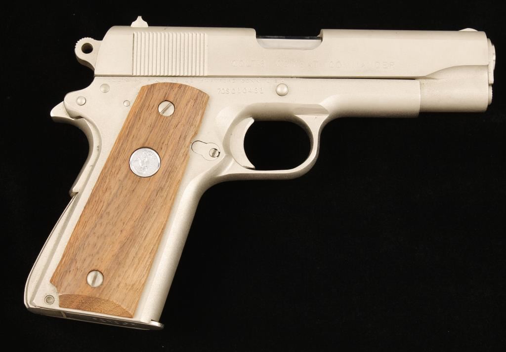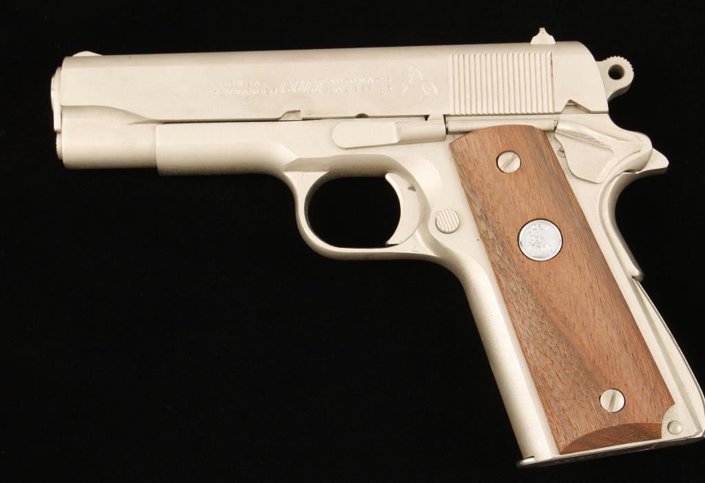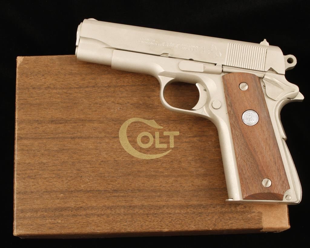 Satin Nickel single-action semi-automatic pistol with a 4-1/4" barrel, drift adjustable rear sight, factory wood-grain box with documents, wood grips and one magazine. Made in 1972. 70 Series. Metal finish shows a few rubs with wear on the hammer side and face. Bore is shiny with good rifling. Action and safety work properly. Grips are unmarked. Condition is excellent. *Modern Firearm*