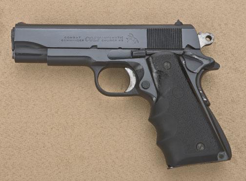 Colt Combat Commander Model semi-auto pistol, .45 cal., 4-1/4” barrel, black finish, Hogue combat wrap around hard rubber grips, #70BS93730. This gun is in overall excellent condition showing approx. 98% originalfinish, jeweled barrel, trigger and hammer, fine bore, crisp action and markings, excellent grips. Est.: $350-$700.