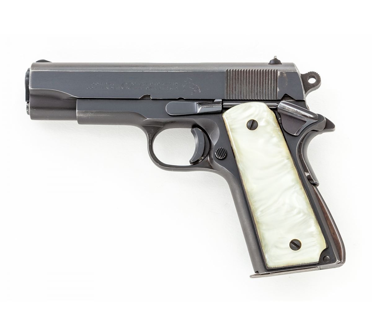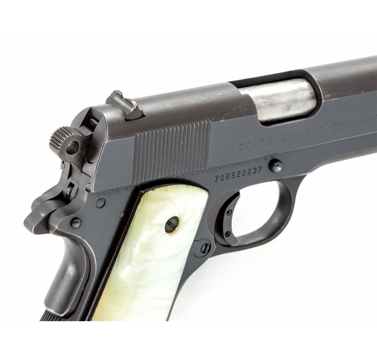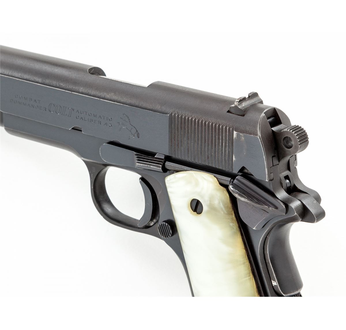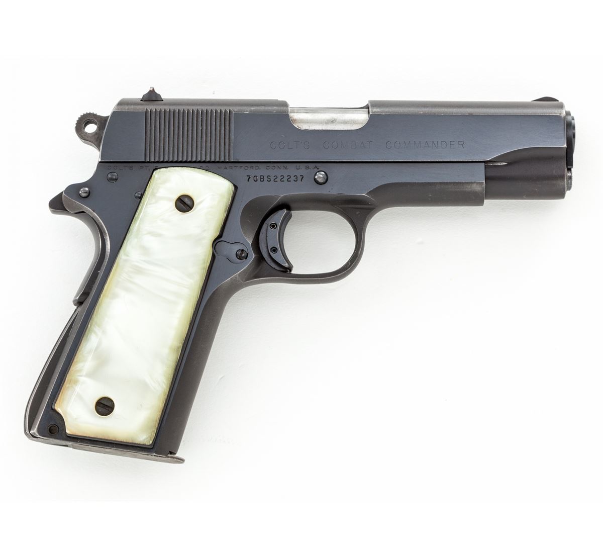 Colt Combat Commander Semi-Automatic Pistol, #70BS22237, .45 ACP cal., 4-1/4'' barrel, blue finish, faux pearl grips, with one WWII era contract magazine. Condition is fine to near excellent retaining approx. 96% blue with thinning at muzzle and high edges; front strap shows very light thinning as well. Grips and action are crisp, bore is bright. Triggershoe is present. Est.: $600-$800. (Modern/PPT)