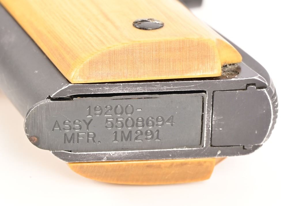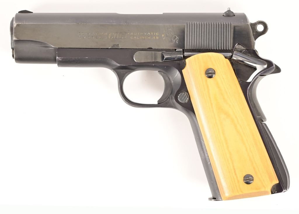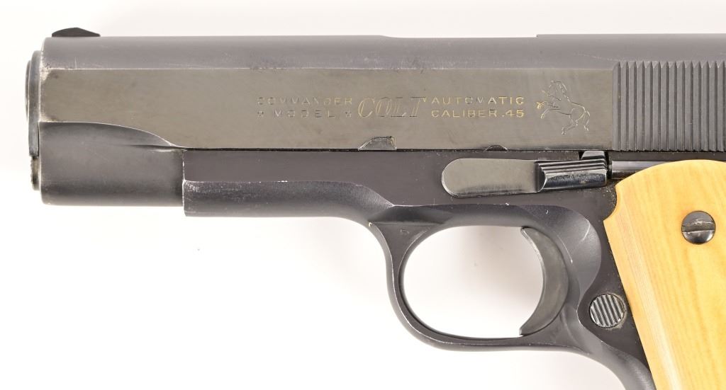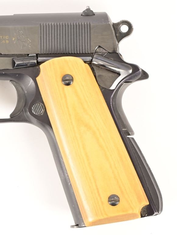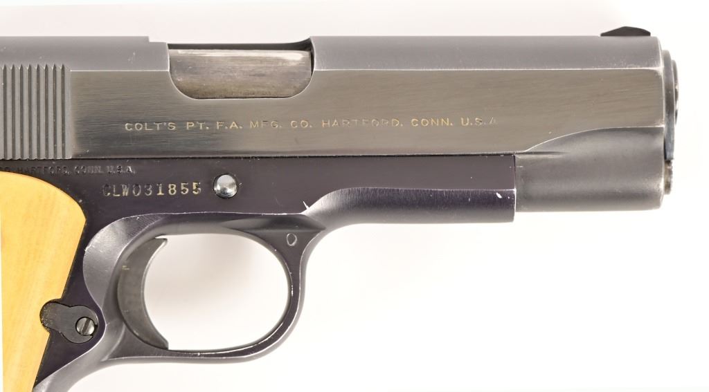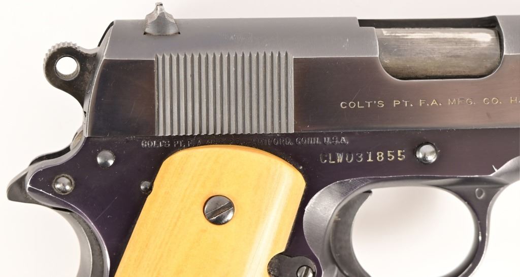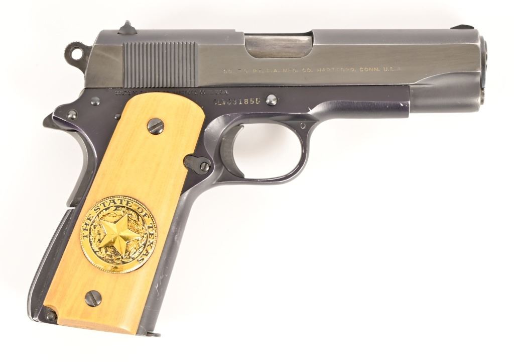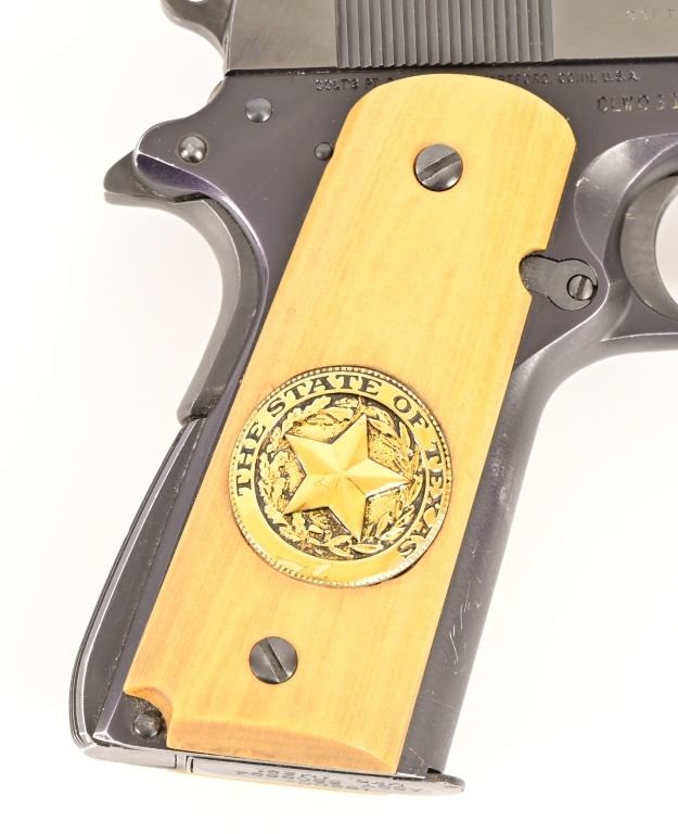 S/N CLW031855. Colt Lightweight Commander 1911, State of Texas Seal wood grips, blued finish. Good condition with slight/moderate holster wear seen in normal blued areas. Modern
