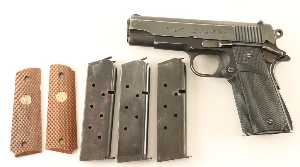 Lightweight 1911A1 pattern single action semi-automatic compact pistol chambered in .45 Auto, manufactured in Hartford, CT circa 1979. Features a matte blued slide with polished flats, 4.25" barrel, low-profile blade front sight, dovetailed rear sight with square notch, serrated trigger, serrated round hammer spur, manual safety on the left side of the frame, grip safety, push button magazine release, factory 7 round magazine, black finished alloy frame, serrated arched mainspring housing and Pachmayr Signature checkered black rubber wrap-around grip. Includes a set of checkered walnut grips with gold Colt medallions and three spare magazines (2 Colt & 1 USGI with “S” stamped on the floorplate). Pistol retains approximately 85% of its original finish showing heavy holster wear, handling marks, and a small amount of pitting & rust. Action is sound, the bore is pristine and rubber grips are good with wear. Condition is NRA Good. ***Modern Firearm***