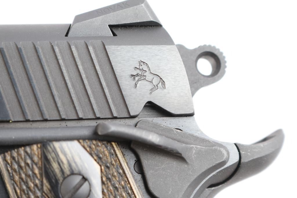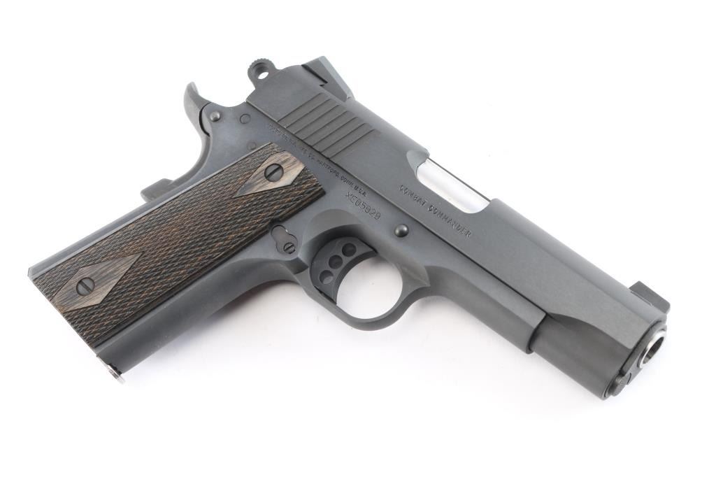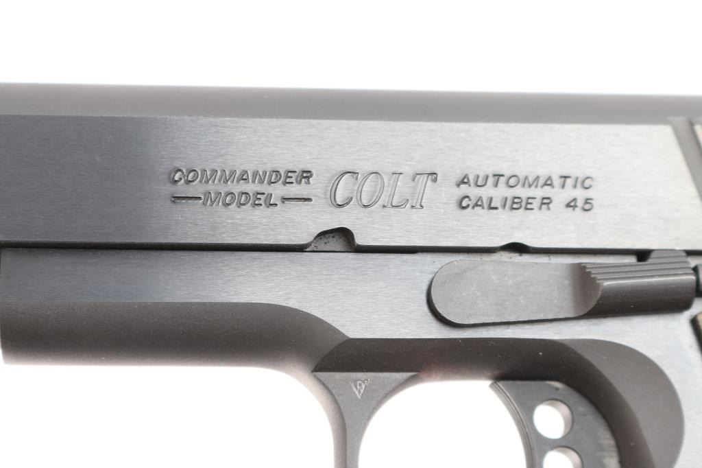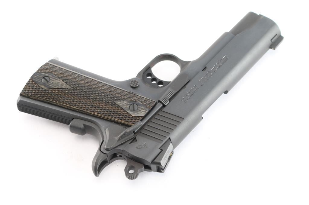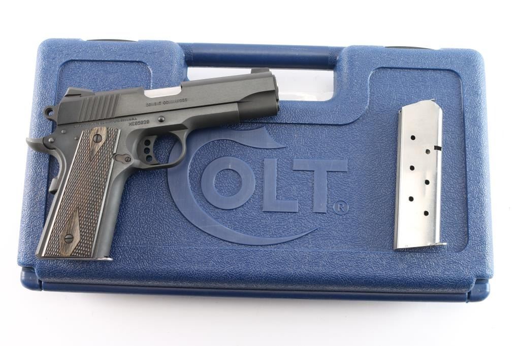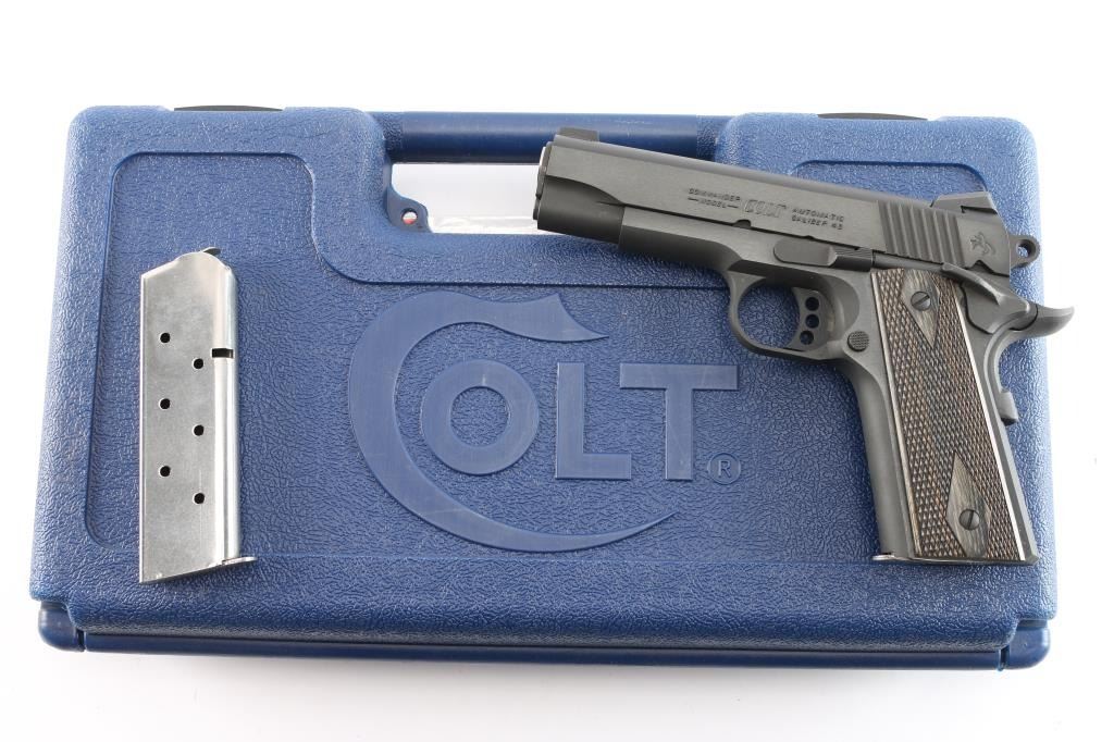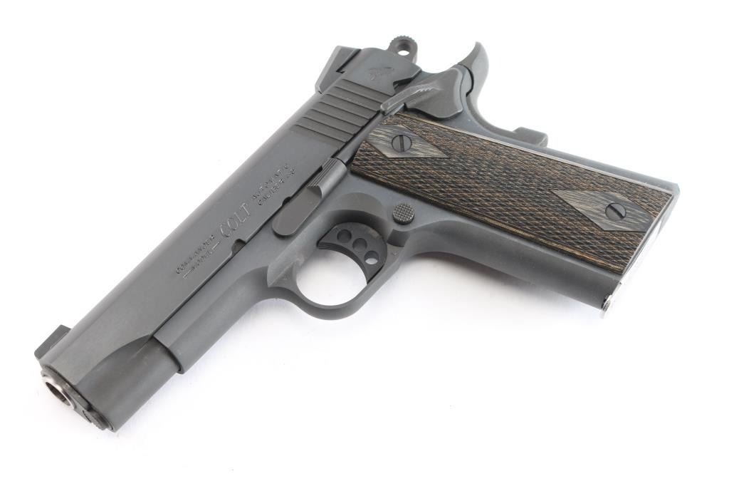 American made series '80 1911 style pistol with firing pin safety chambered in .45 ACP manufactured in Hartford, CT. This is likely a fairly new pistol because the Colt website does not have information regarding this serial number. It features an extended safety, serrated slide stop, checkered push button magazine release, serrated curved skeletonized trigger, smooth extended beavertail grip safety with memory bump, skeletonized hammer with serrated hammer spur, ramped Novak three dot sights, dark checkered hardwood grips with diamond patterns around the screws, smooth front strap, and serrated mainspring housing. The ejection port is lowered and flared. The bore is bright with strong rifling. The original finished retained is approximately 99% with little remarkable to speak of. The wood grips are excellent. The slide action is smooth and crisp. It comes with the factory blue plastic carry case, manual, and two total magazines.