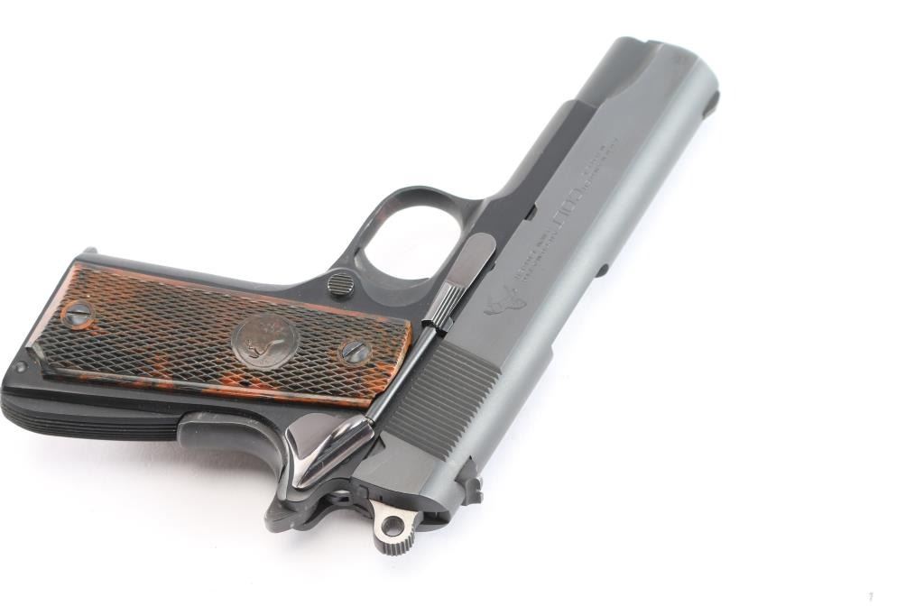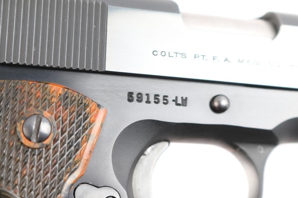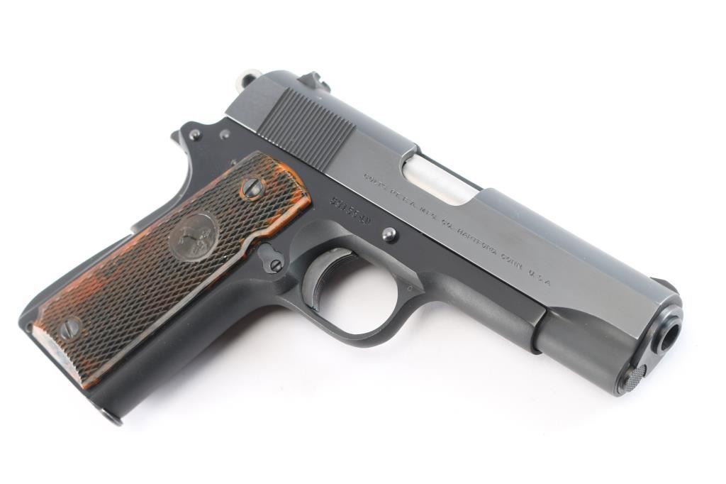 Lightweight 1911A1 pattern single action semi-automatic compact pistol, manufactured in Hartford, CT circa 1968. Matte blued slide with polished flats, 4.25" barrel, low-profile blade front sight, dovetailed rear sight with square notch, serrated ‘long’ trigger, serrated round hammer spur, manual safety on the left side of the frame, grip safety, push button magazine release, factory 9 round magazine, alloy frame with serrated arched mainspring housing and 'Coltwood" grips. Pistol retains approximately 96% of its finish showing light scratches on the slide and frame. Action is sound, the bore is excellent/bright and Coltwood grips are excellent.