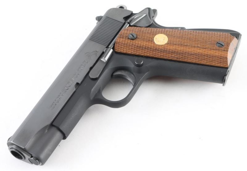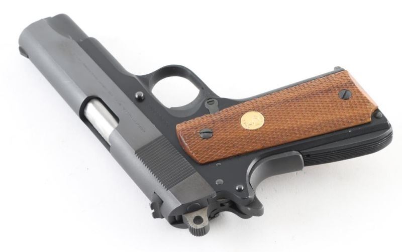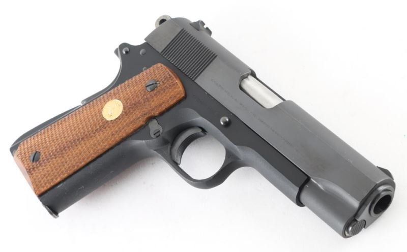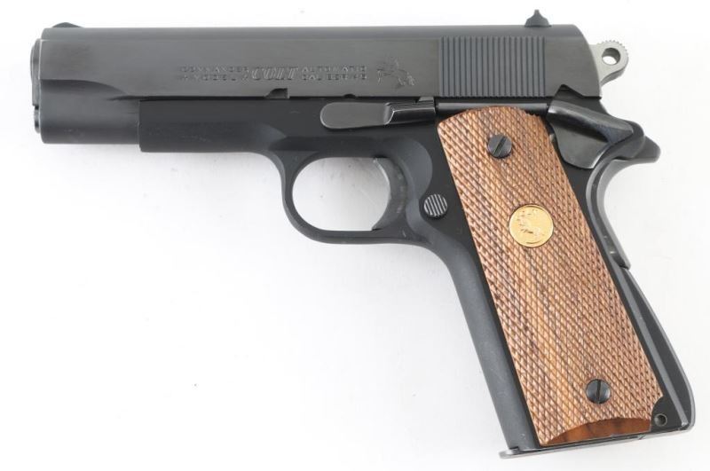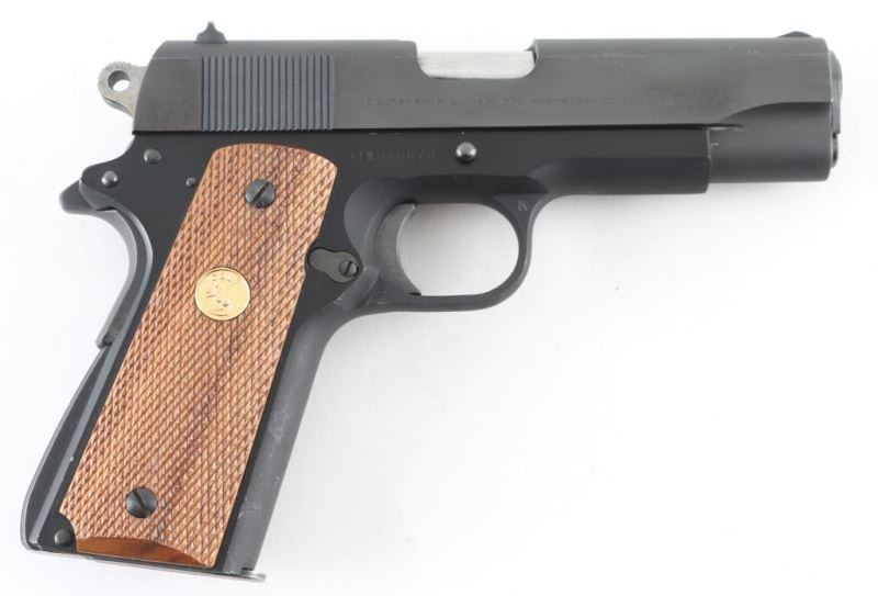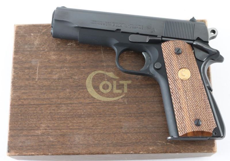 Pistol. Semi-Automatic. 8+1 Capacity. Series 70. "Lightweight" Manufactured 1972. 4 1/4" barrel. Blade/notch sights. Commander style ring hammer. Serrated trigger, and mainspring housing. Standard Colt markings. Blued metal finish. Checkered walnut grips with gold toned "Rampant Colt" medallions. Bore appears excellent/bright. Slide action is smooth/tight. Blued finish is about 98% with some very minor edge wear/scratches. Comes with the original magazine marked "Colt 45 Auto/Rampant Colt". Comes in its original Colt "wood grain" cardboard box with manual. NRA Condition-Excellent. C&R Firearm.