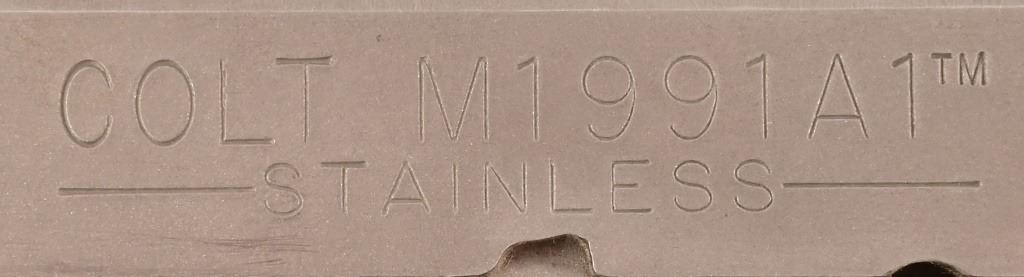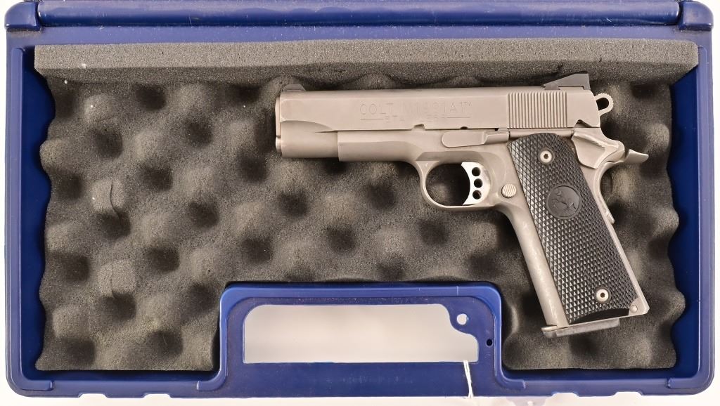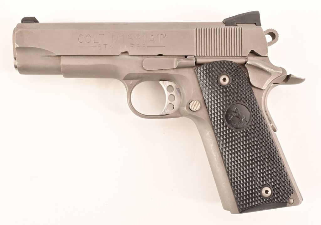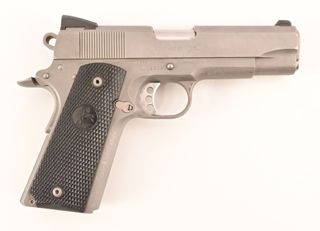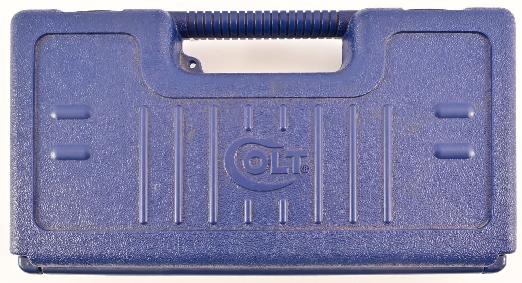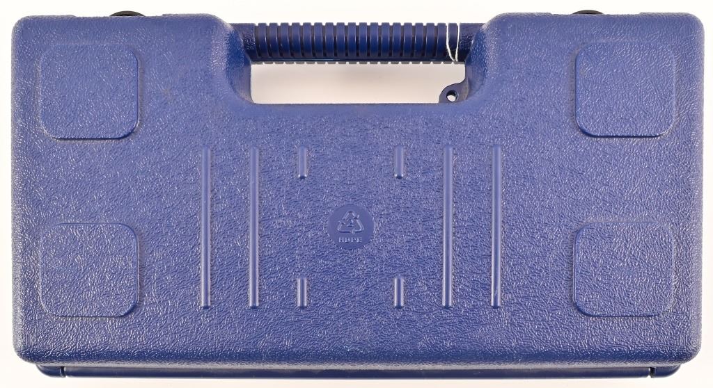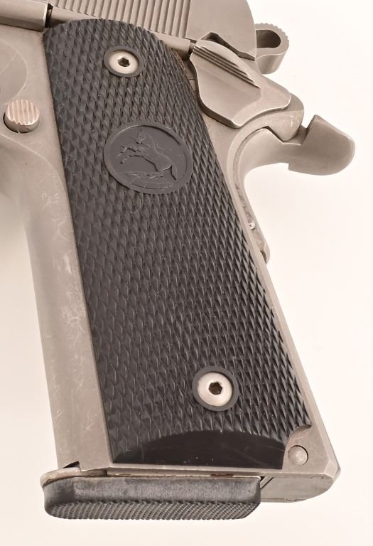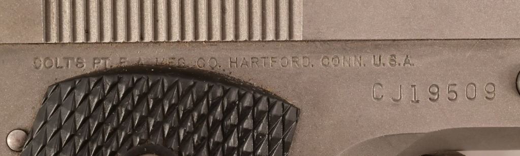 S/N CJ19509. Satin stainless finish, checkered rubber grips. With original plastic case.